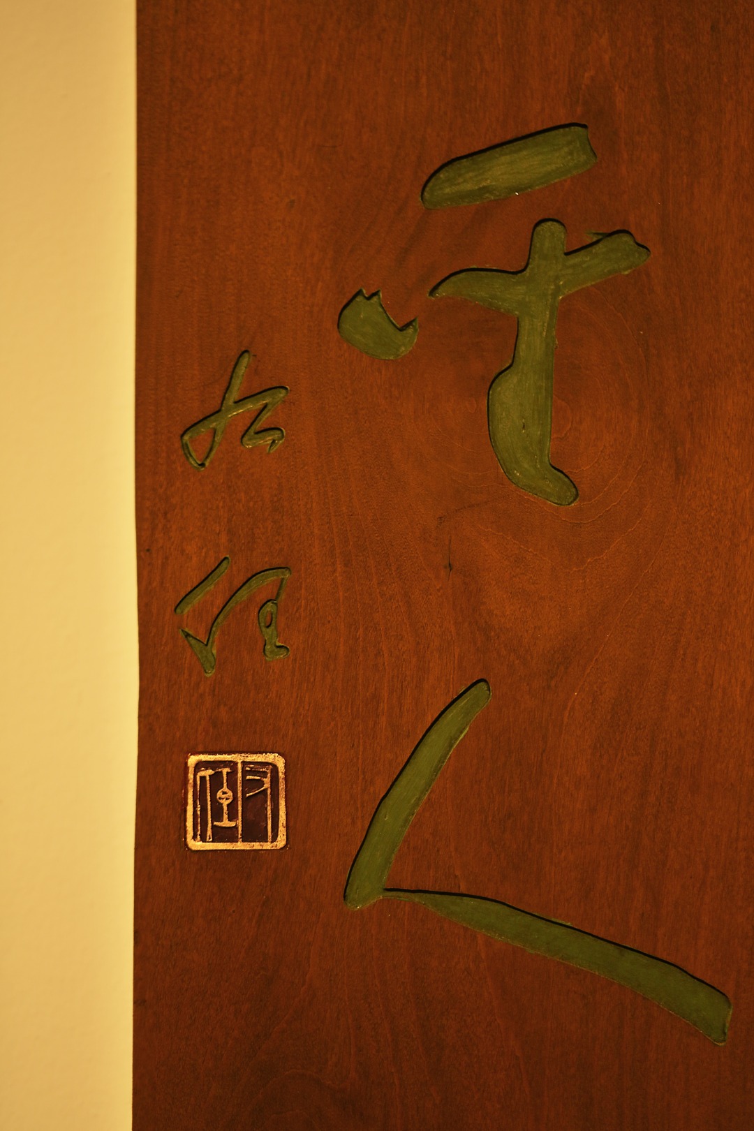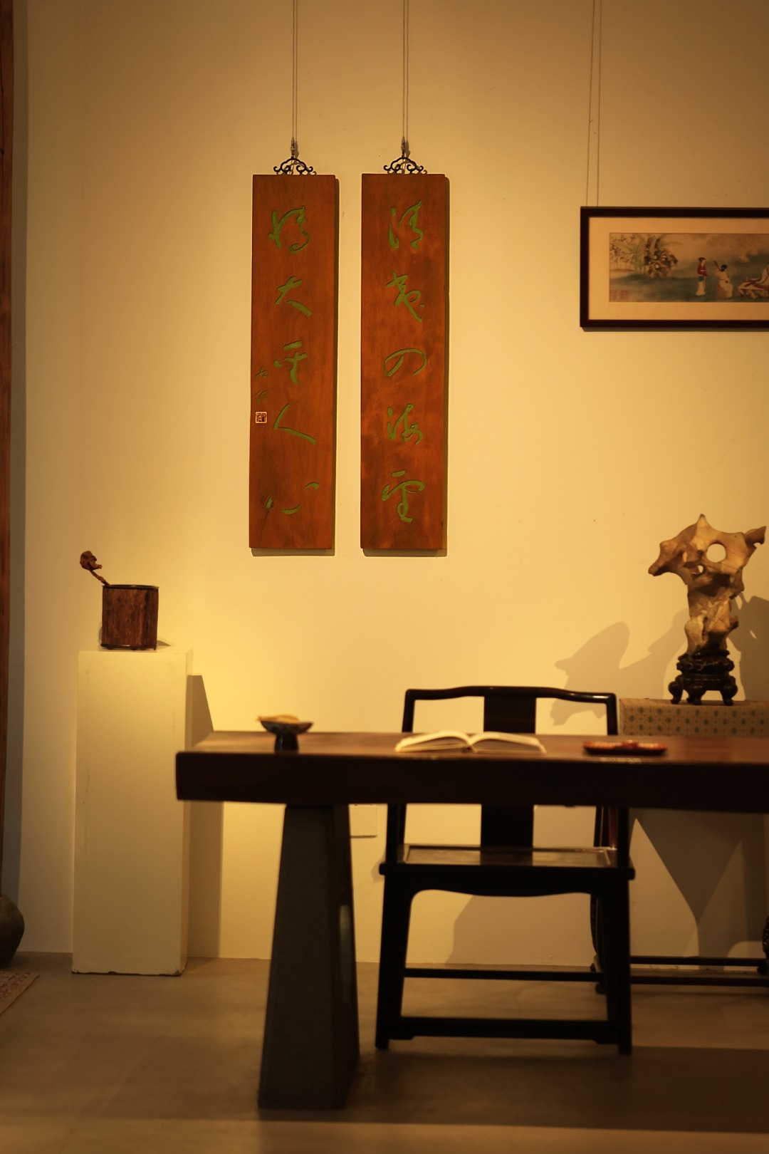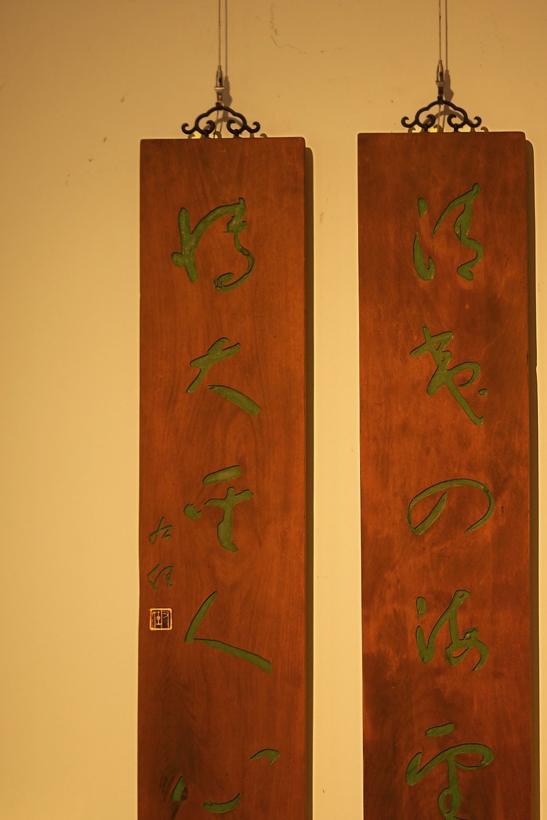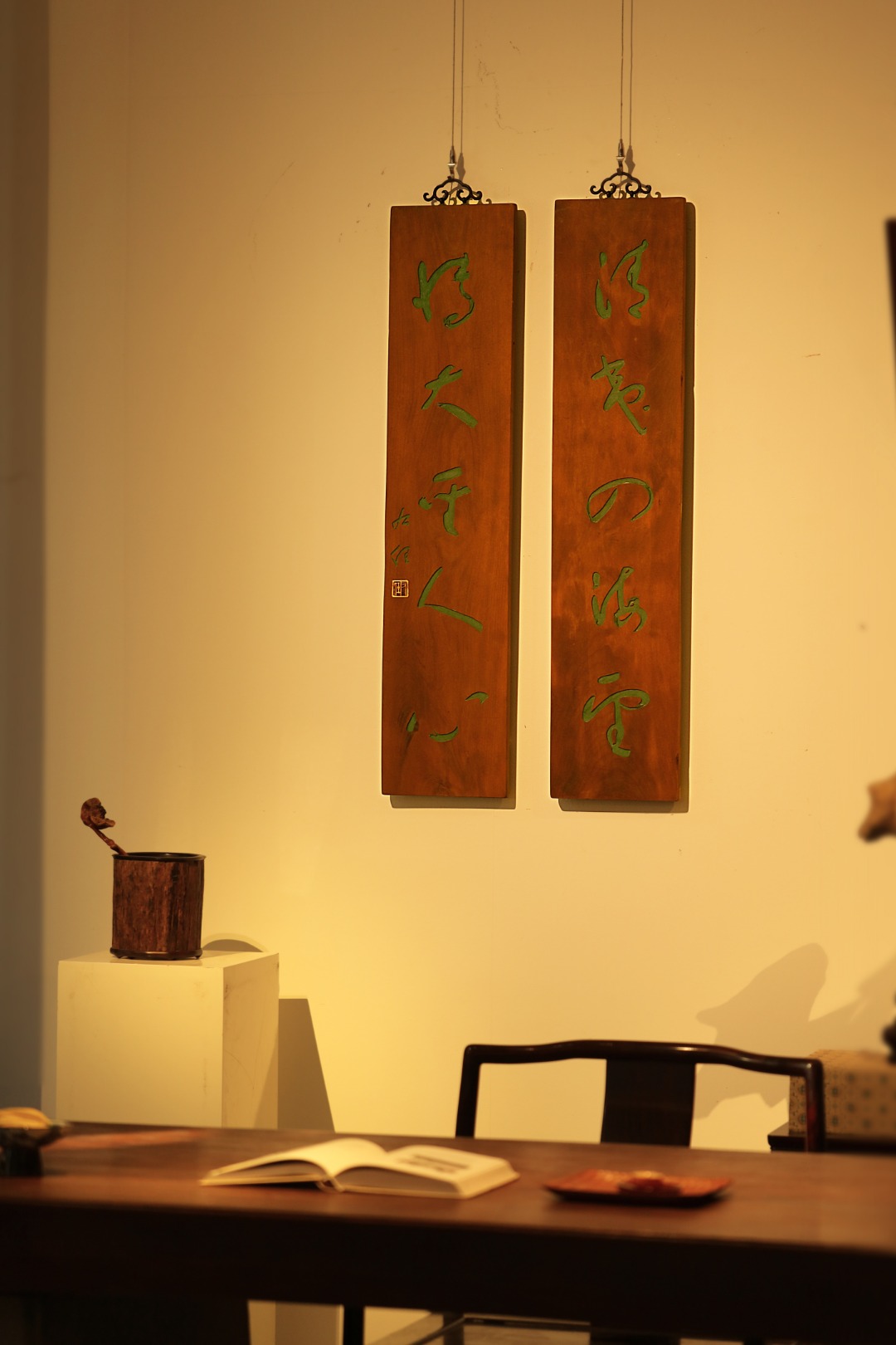 取旧时老板料,手刻对联,大漆描绘,原皮壳沉着古朴,悬于空间,深得意象真趣,人生理趣,为文房雅室佳选。