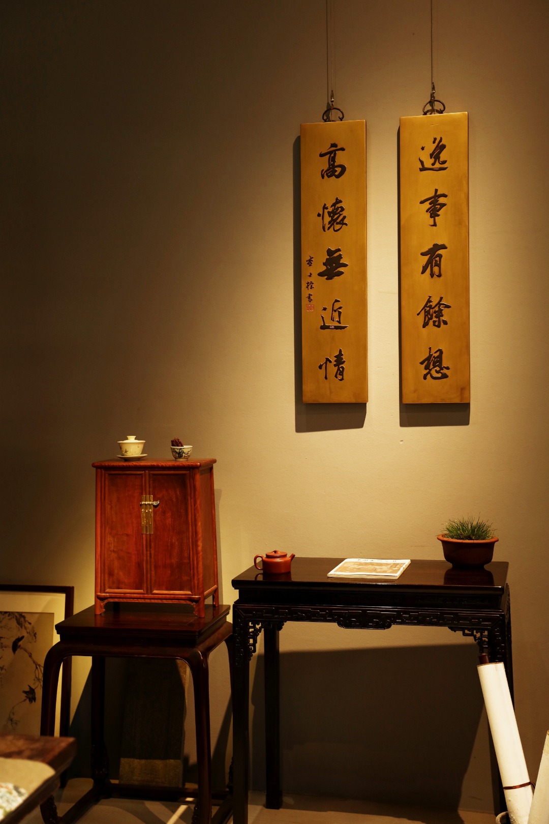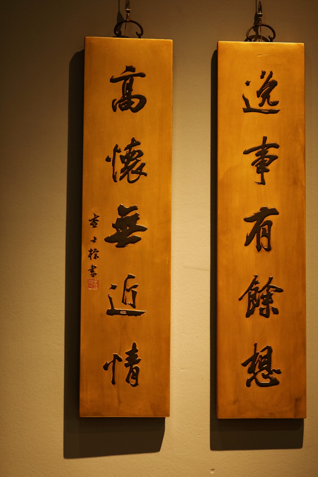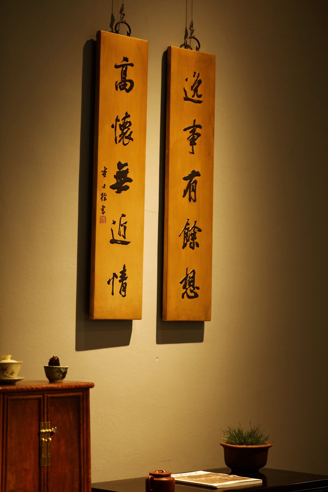 取旧时老板料,手工阳刻对联,面饰金漆、沉着古朴,悬于空间,深得意象真趣,人生理趣,为文房雅室佳选。