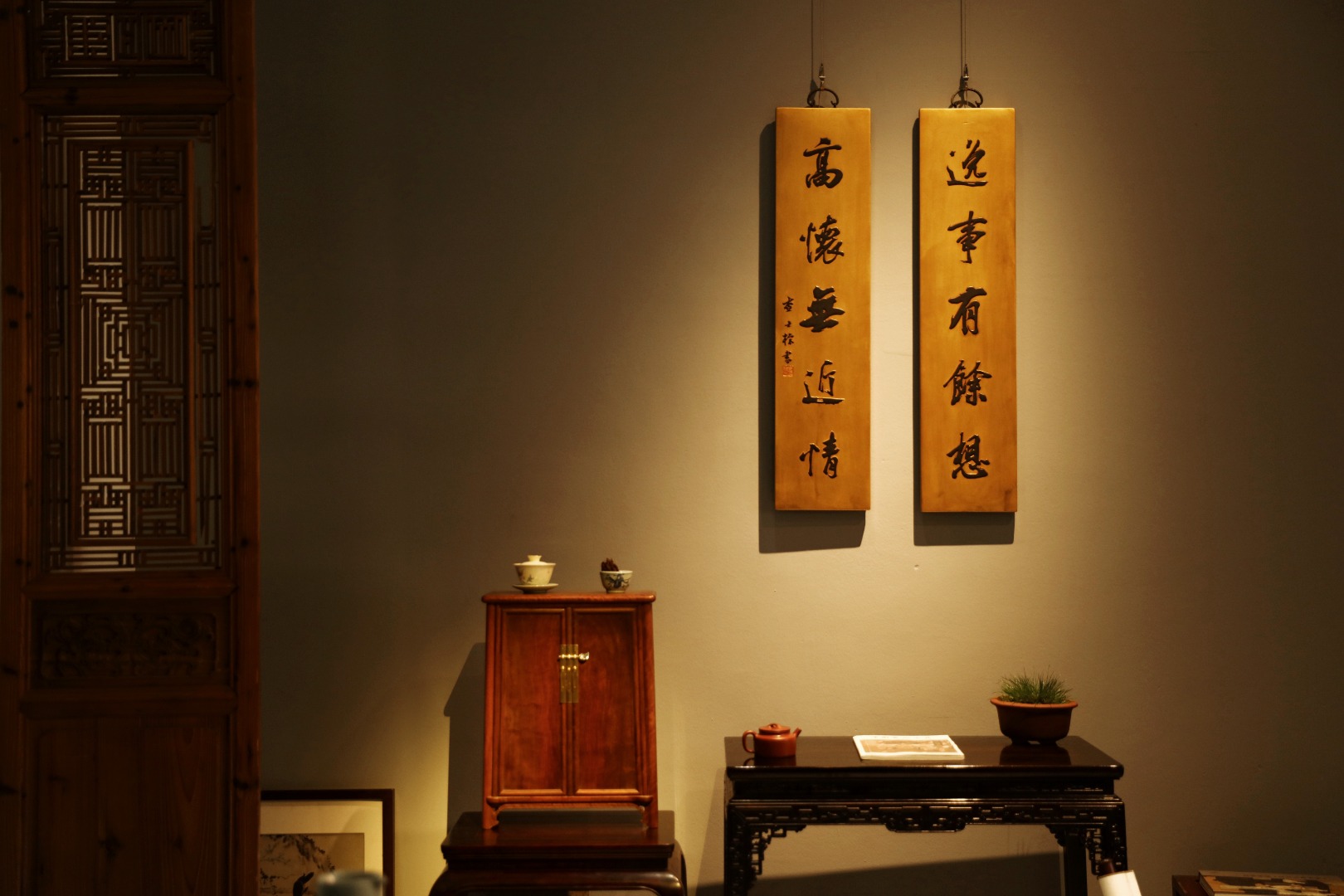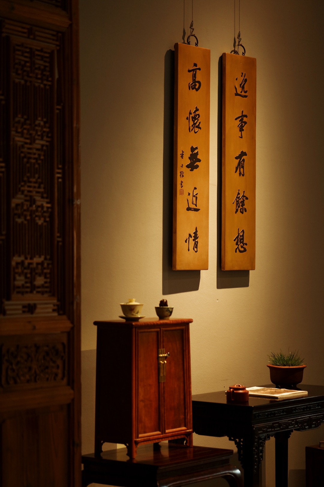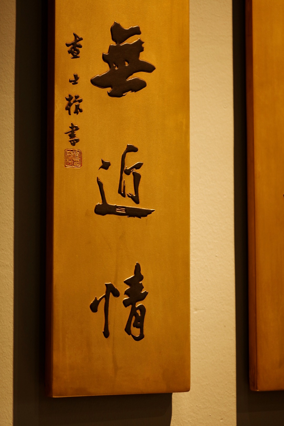 取旧时老板料,手工阳刻对联,面饰金漆、沉着古朴,悬于空间,深得意象真趣,人生理趣,为文房雅室佳选。