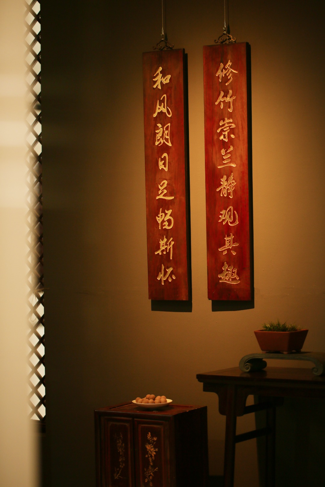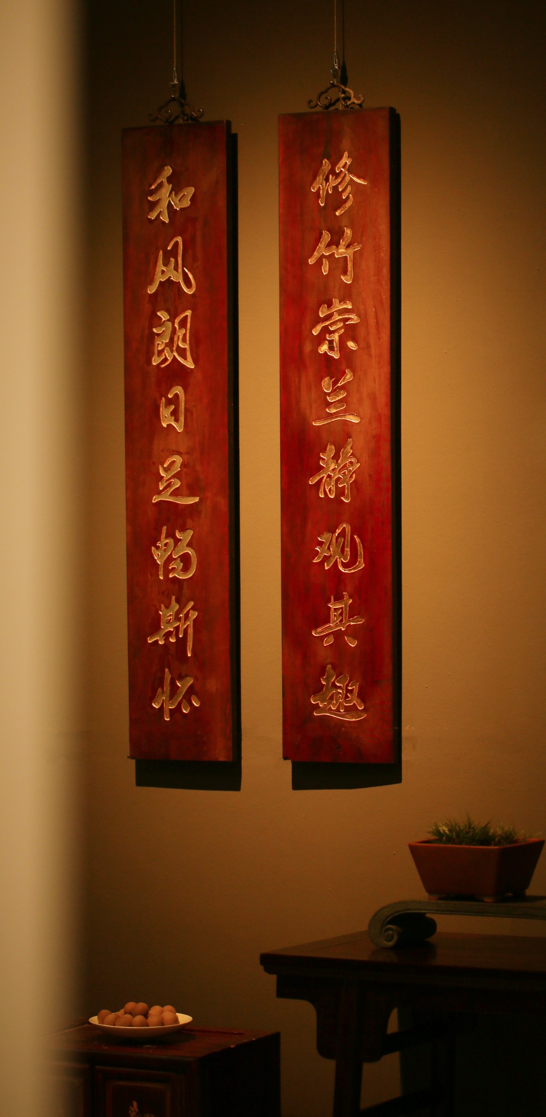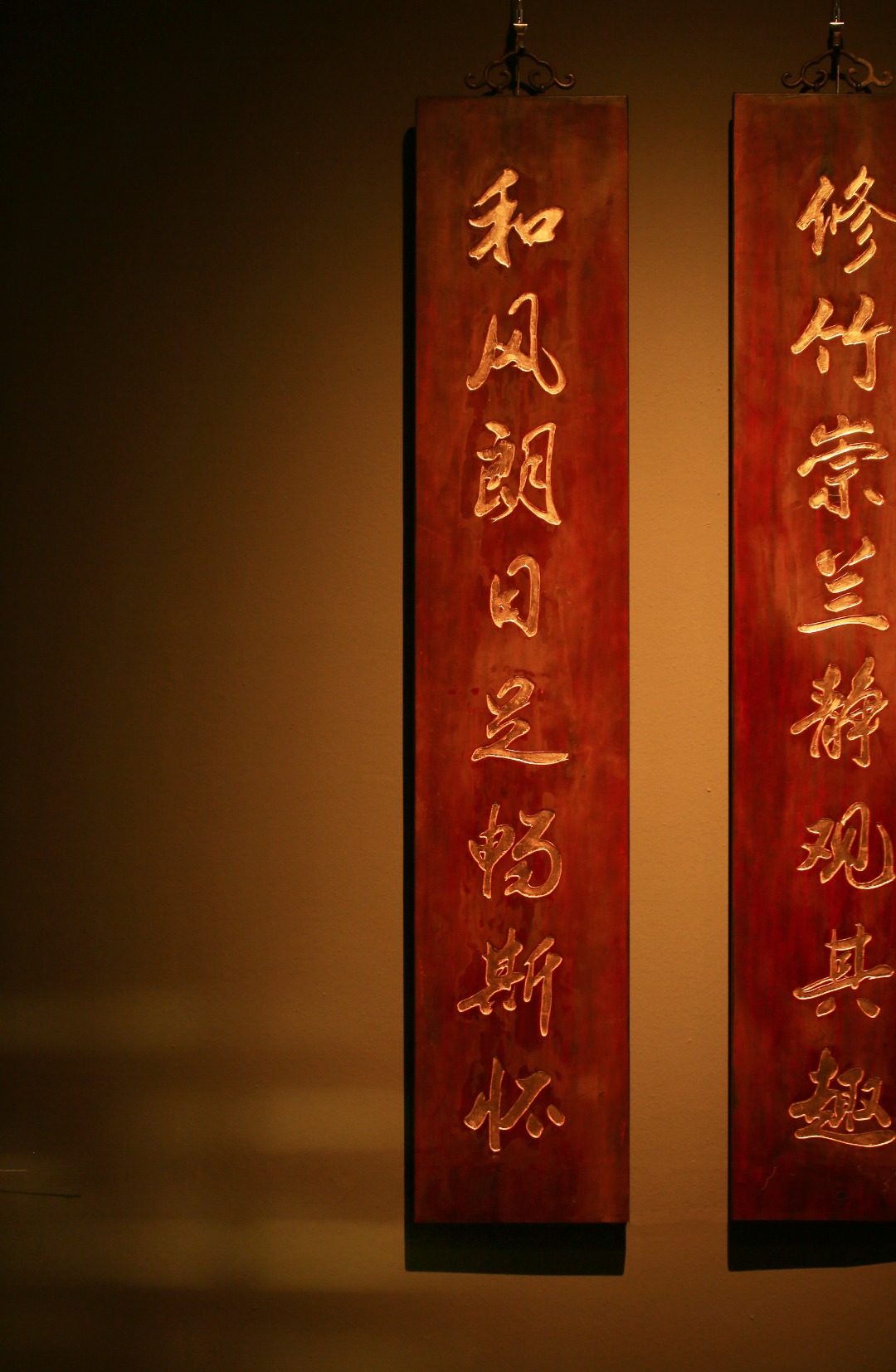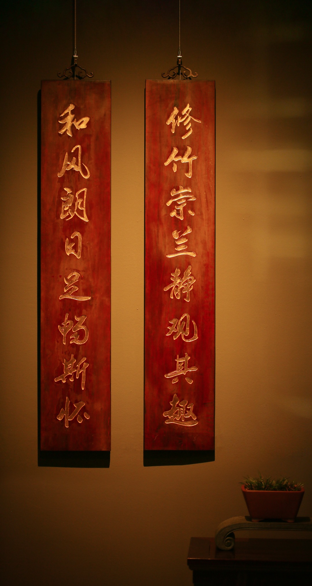 取旧时老板料,手工阴刻对联,金箔漆绘,原皮壳沉着古朴,悬于空间,深得意象真趣,人生理趣,为文房雅室佳选。