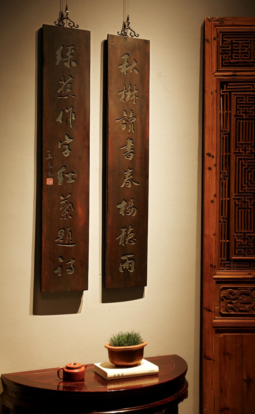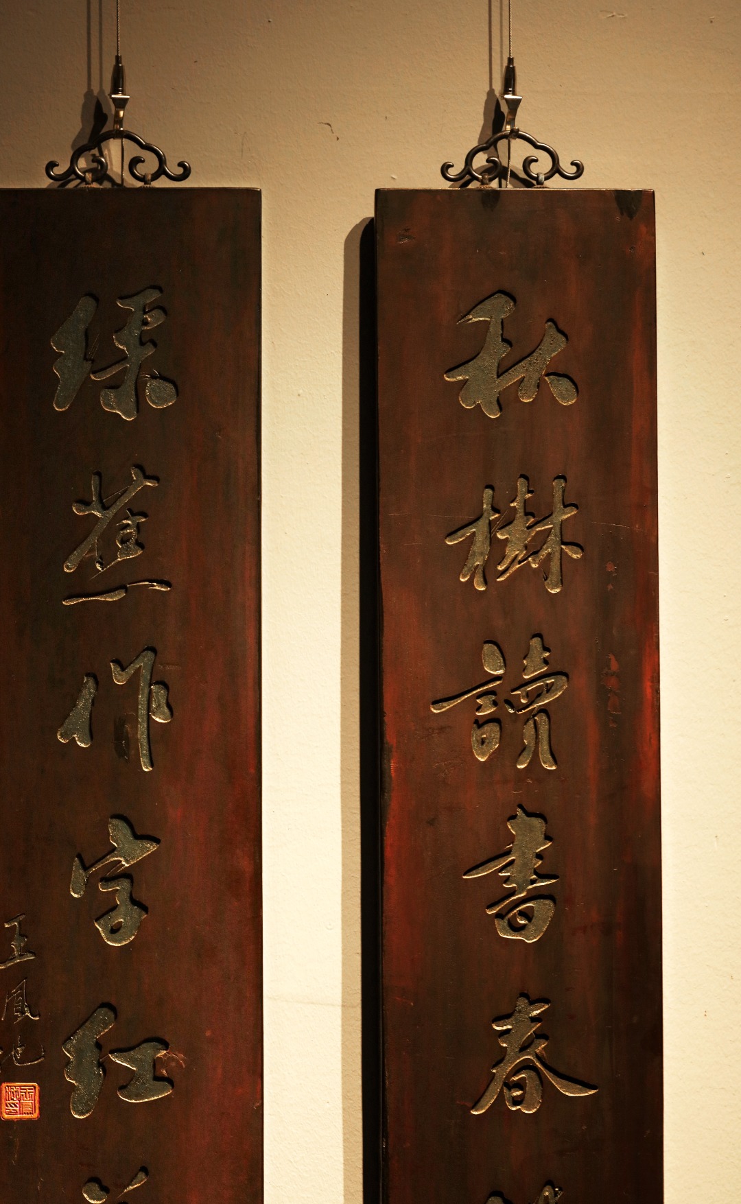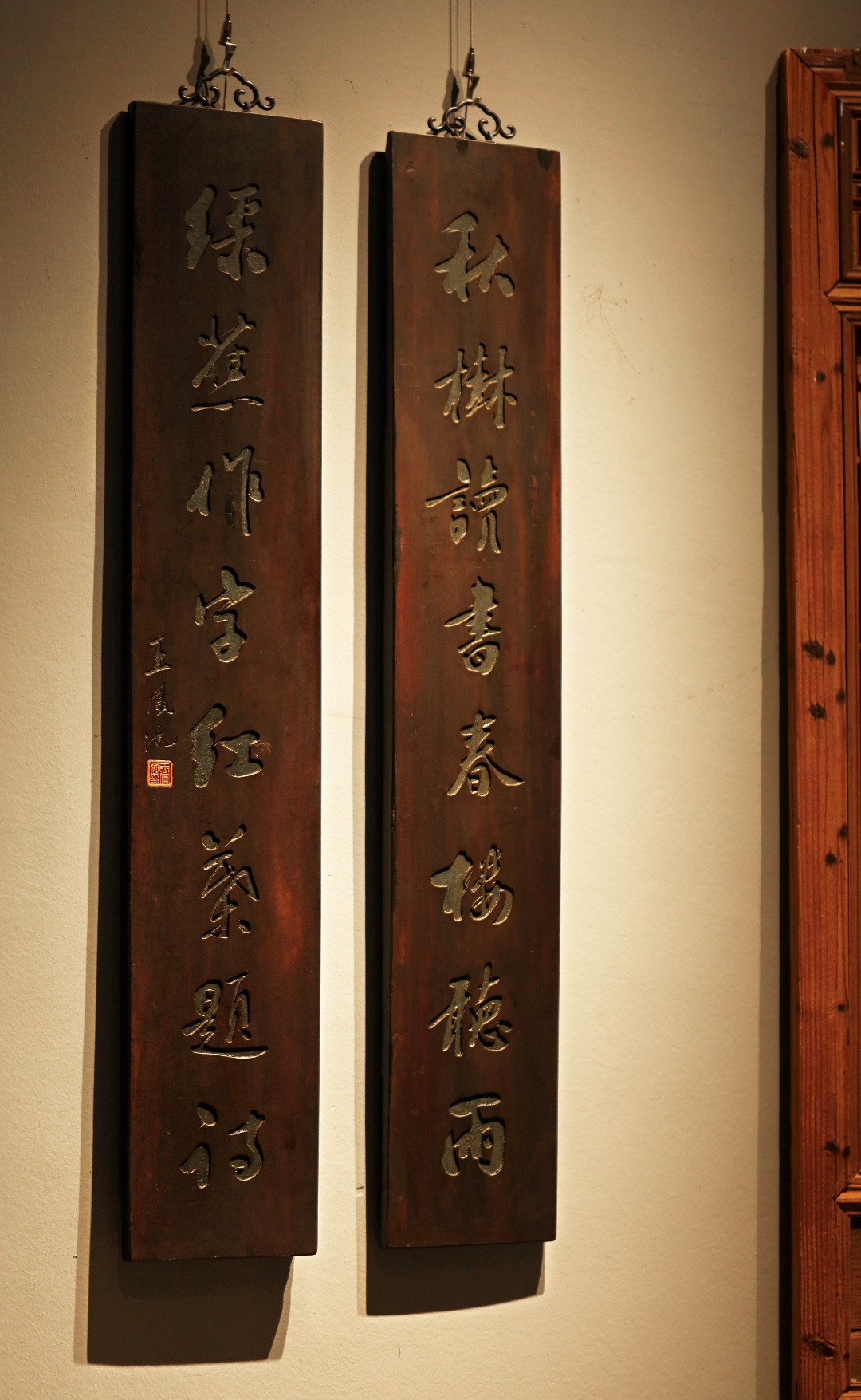 取旧时老板料,手刻对联,矿彩漆绘,原皮壳沉着古朴,悬于空间,深得意象真趣,人生理趣,为文房雅室佳选。