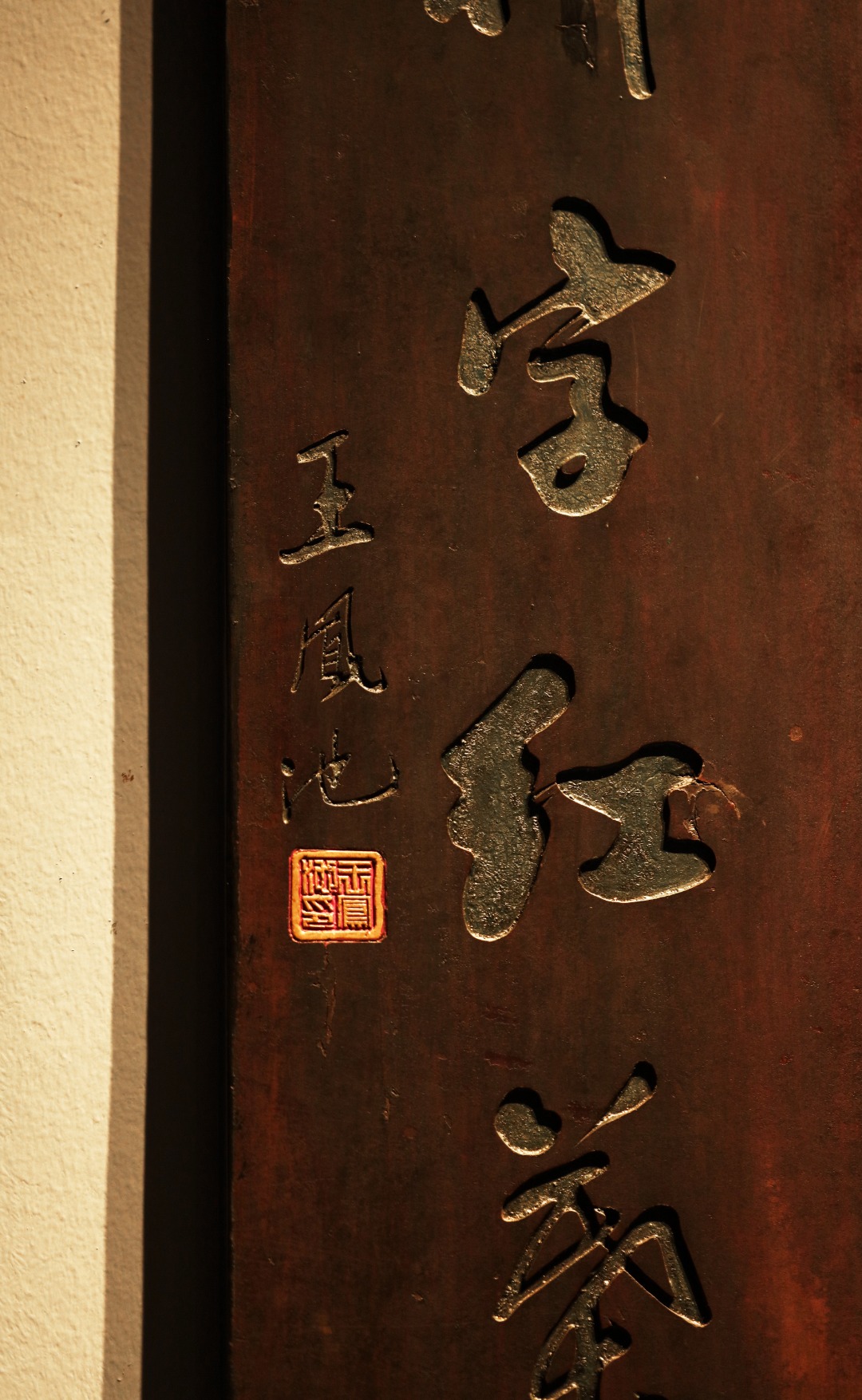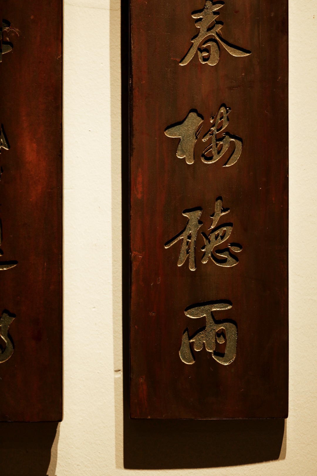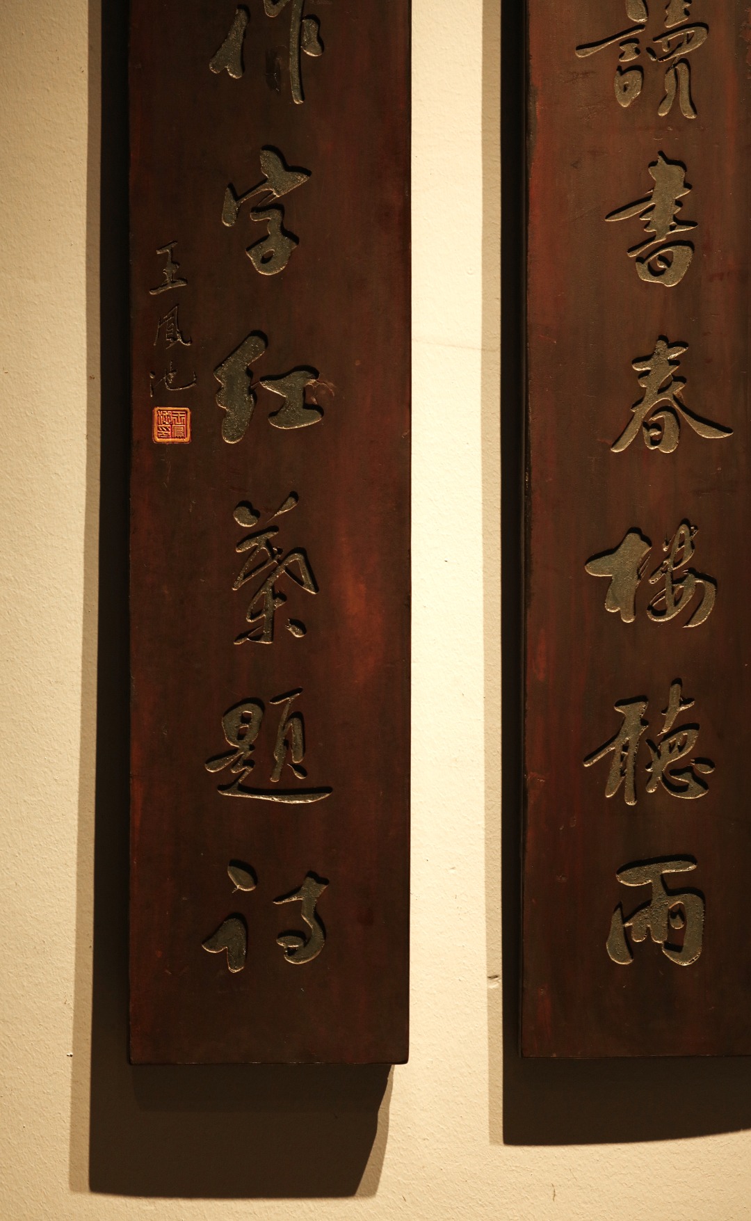取旧时老板料,手刻对联,矿彩漆绘,原皮壳沉着古朴,悬于空间,深得意象真趣,人生理趣,为文房雅室佳选。