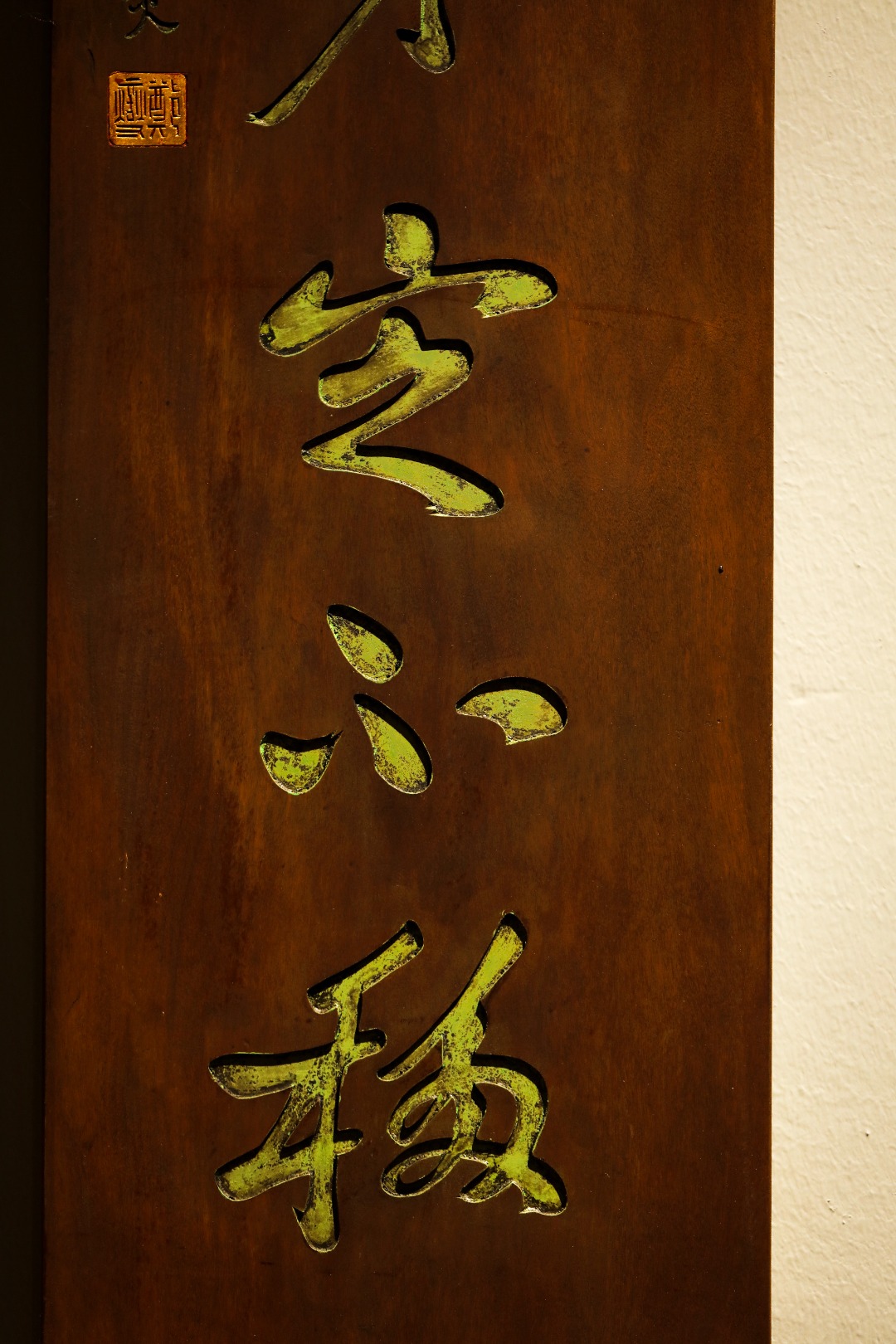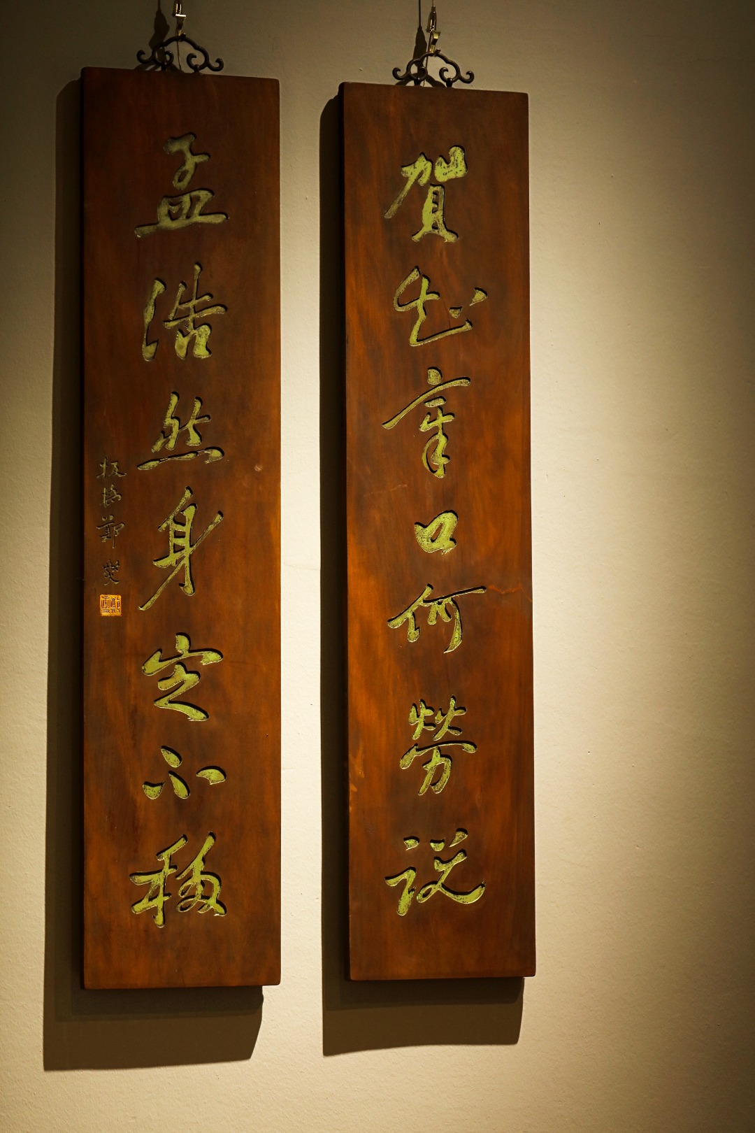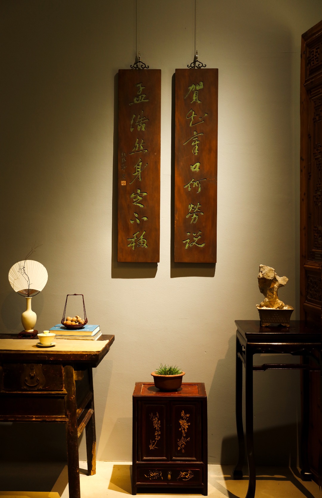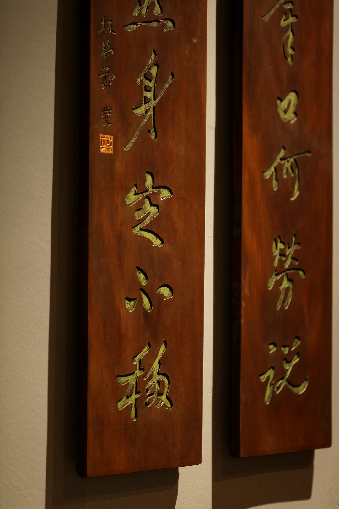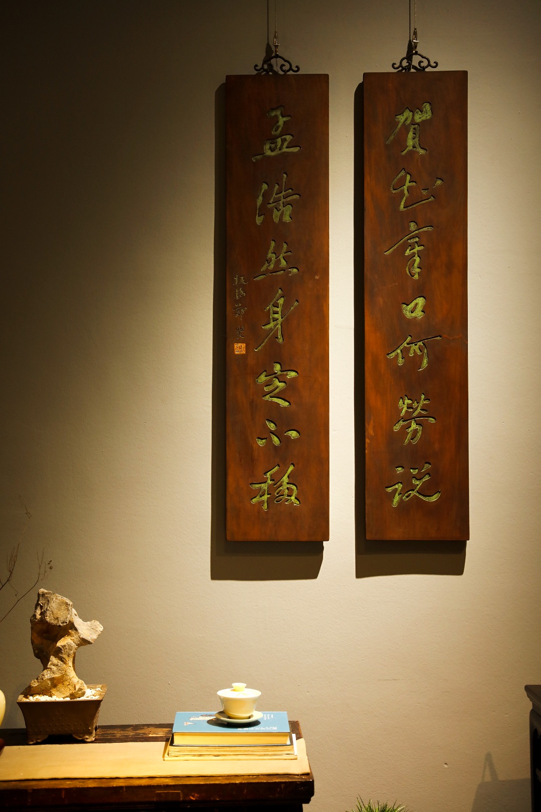 取旧时楠木老板料,手工刻画对联,矿彩漆绘,原皮壳沉着古朴,悬于空间,深得意象真趣,人生理趣,为文房雅室佳选。
