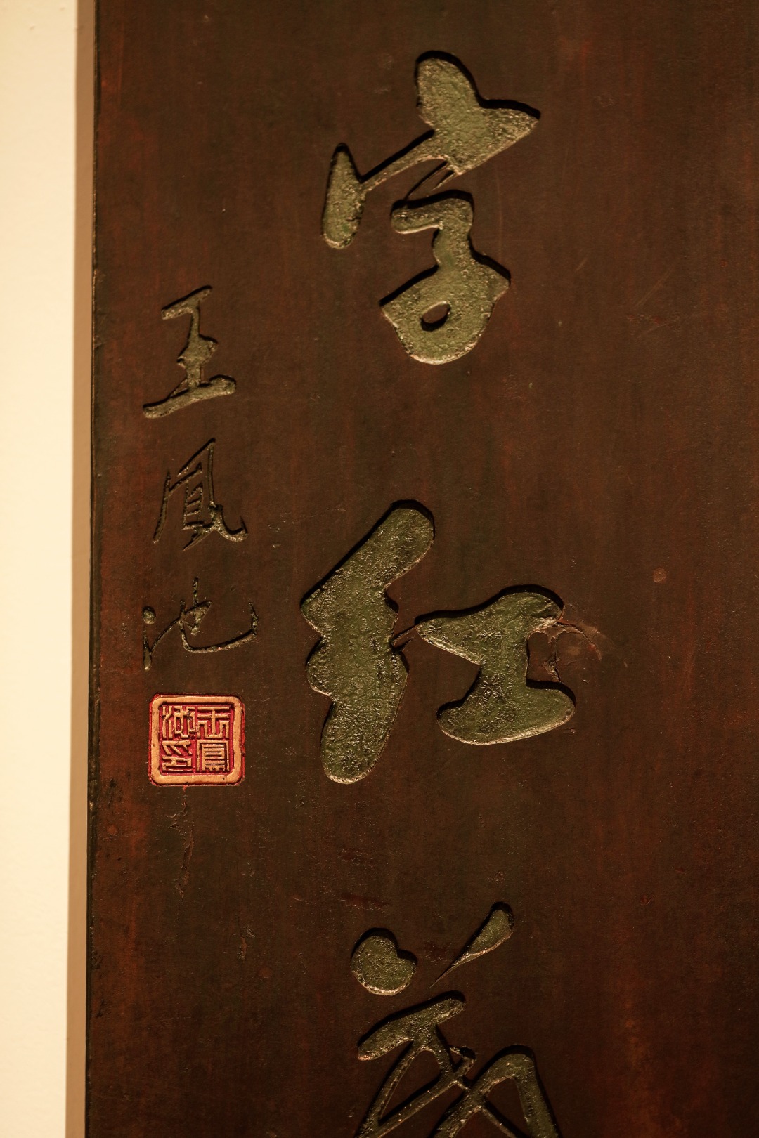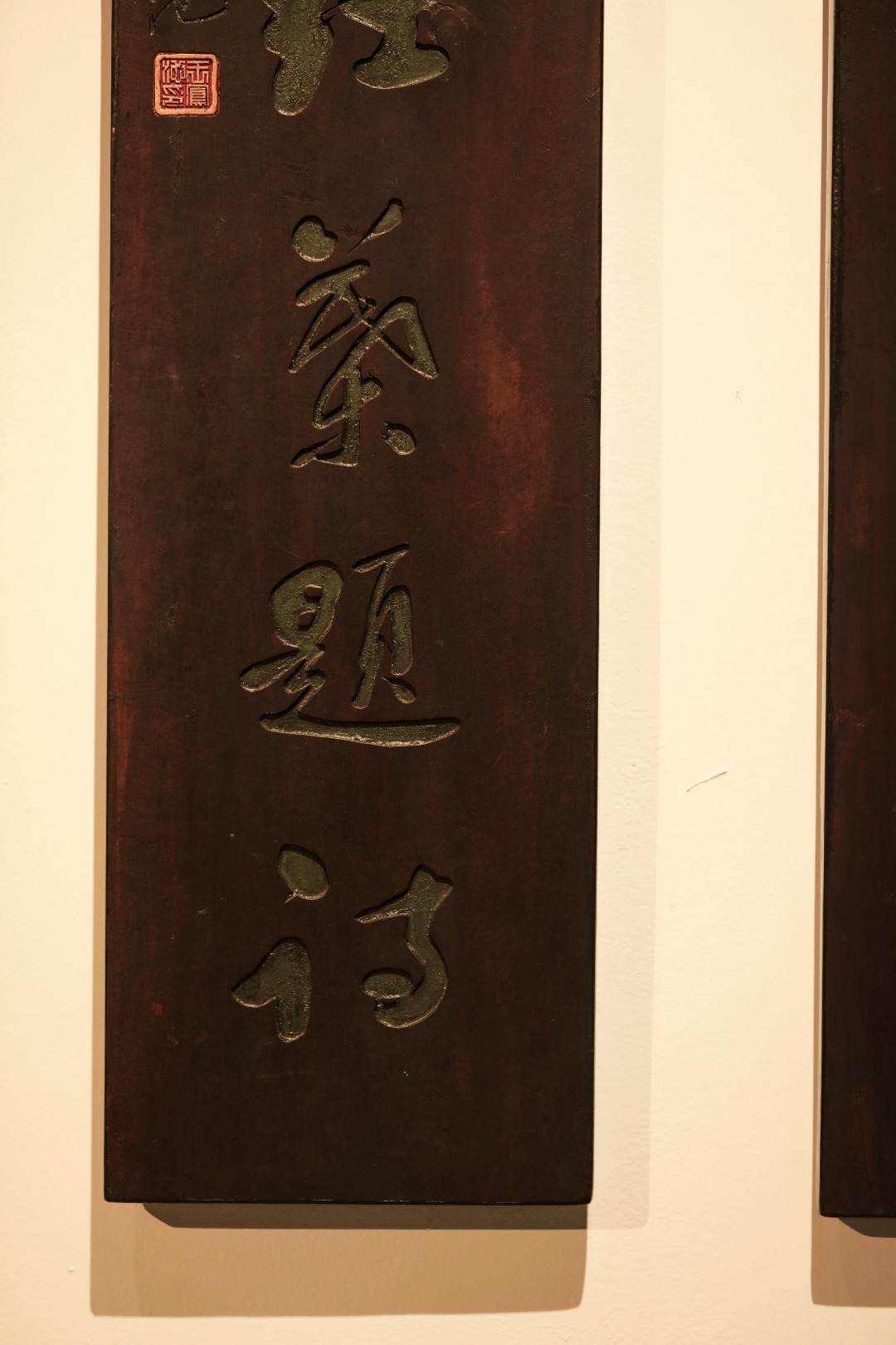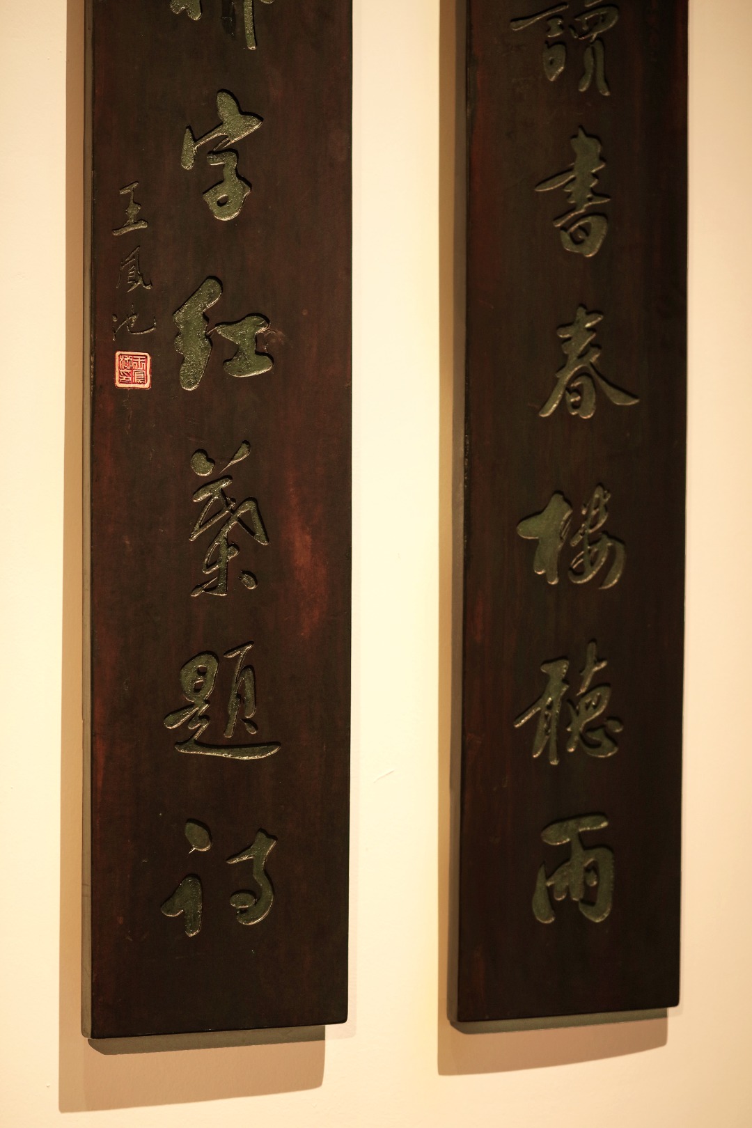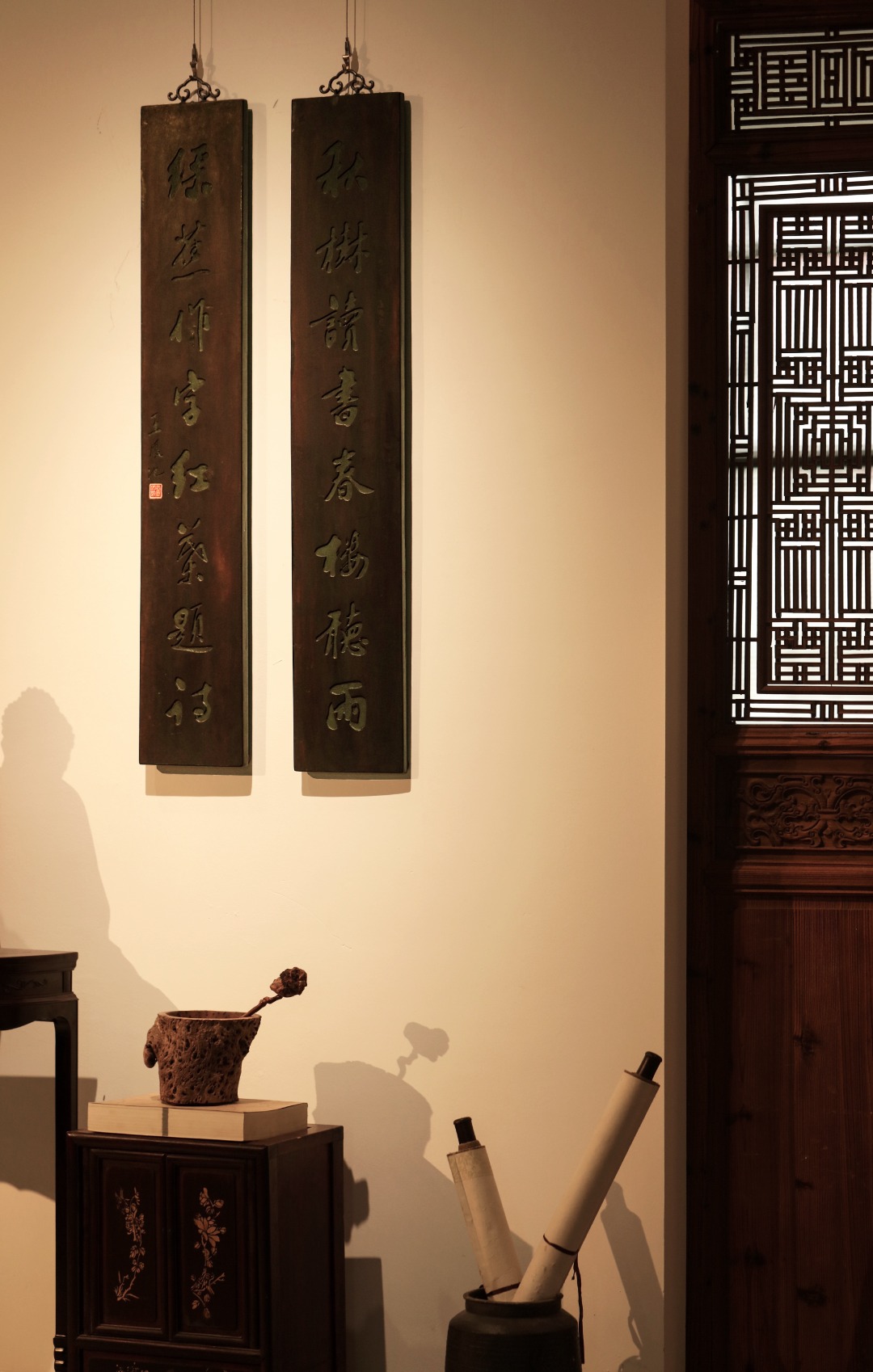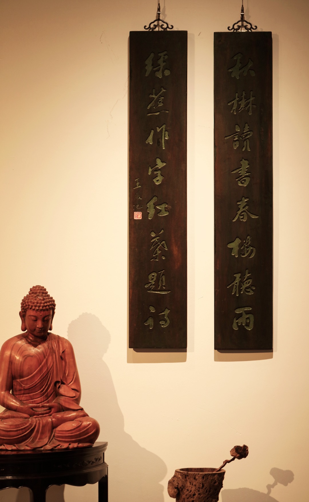 取旧时老板料,手刻对联,矿彩漆绘,原皮壳沉着古朴,悬于空间,深得意象真趣,人生理趣,为文房雅室佳选。