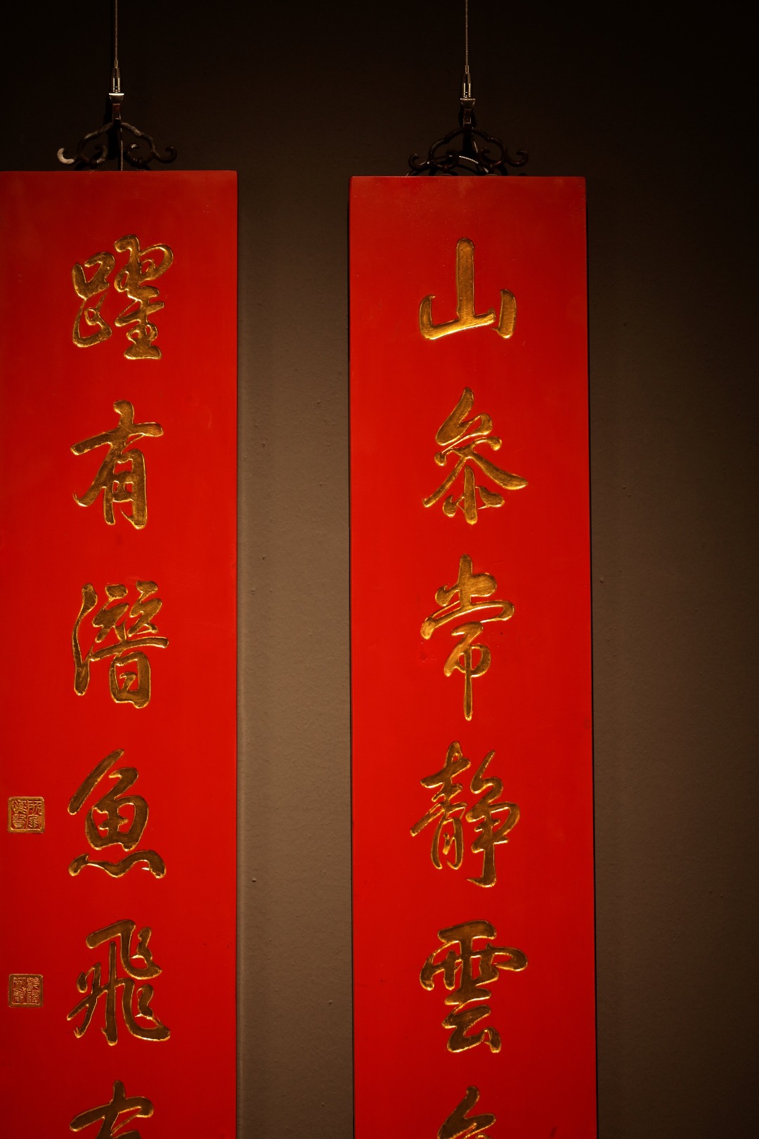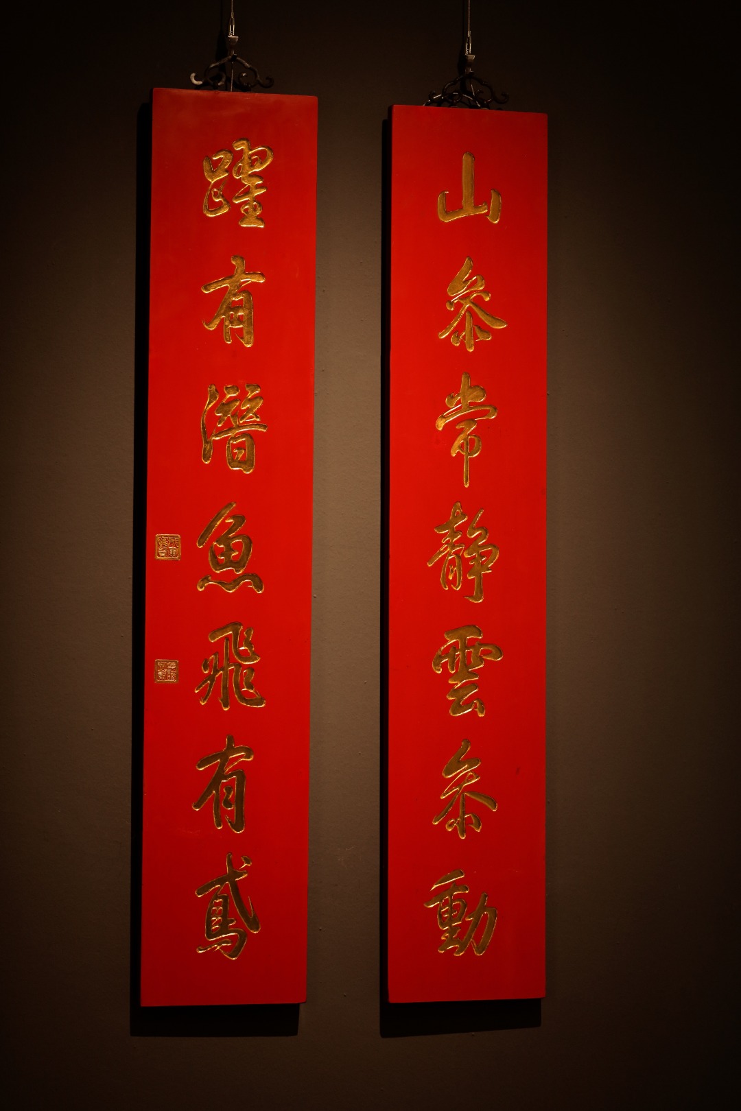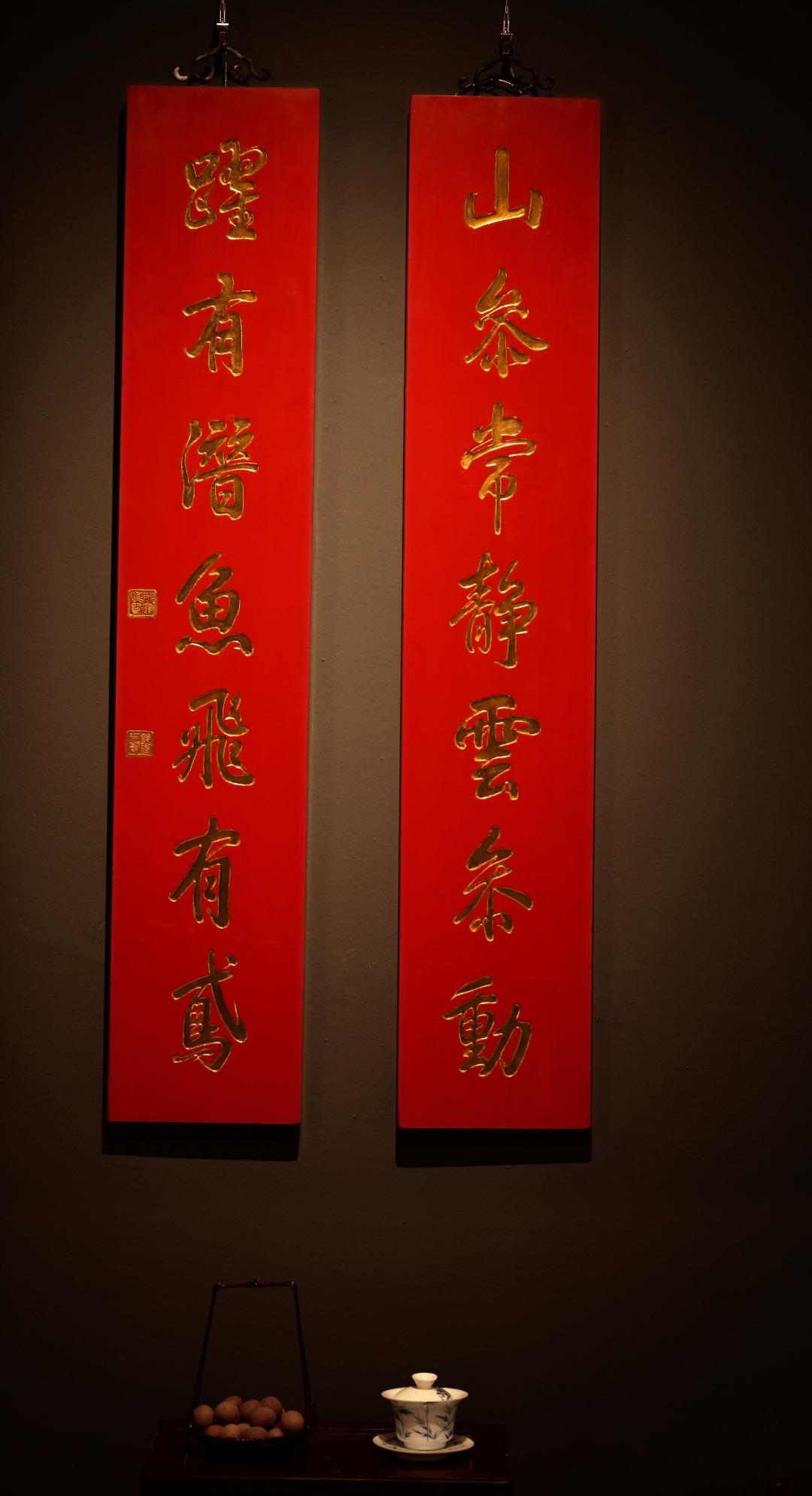 取旧时老板料,手刻对联,金箔描绘,面髹朱漆,沉着古朴,悬于空间,深得意象真趣,人生理趣,为文房雅室佳选。