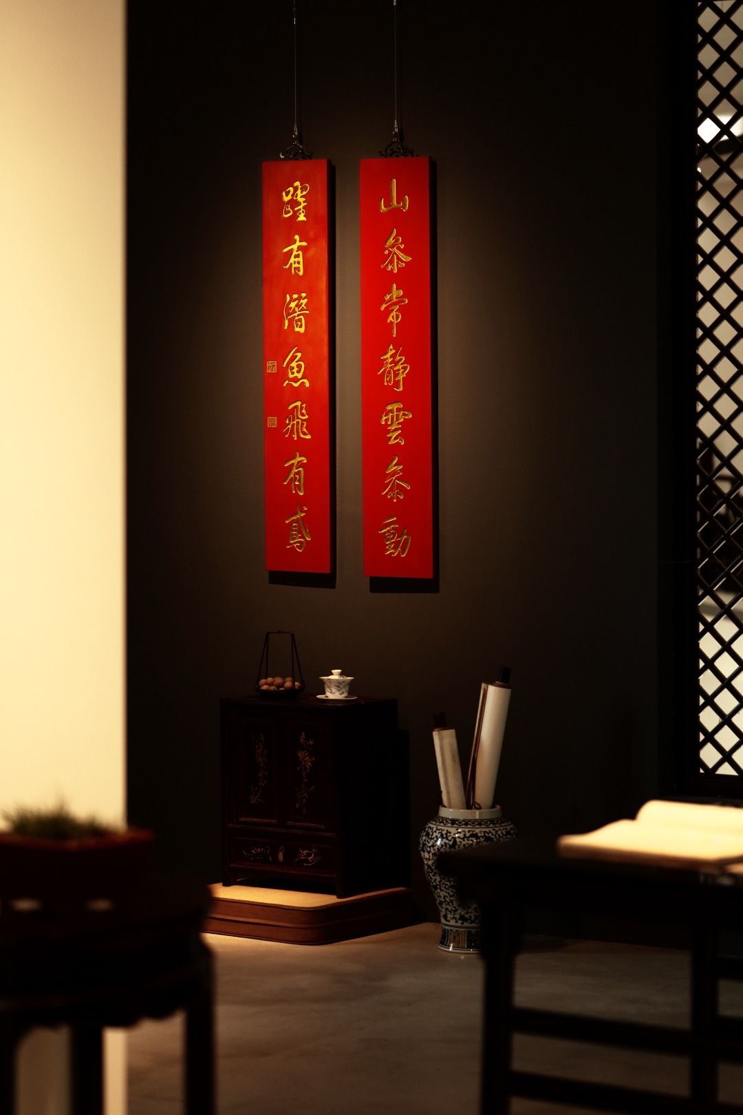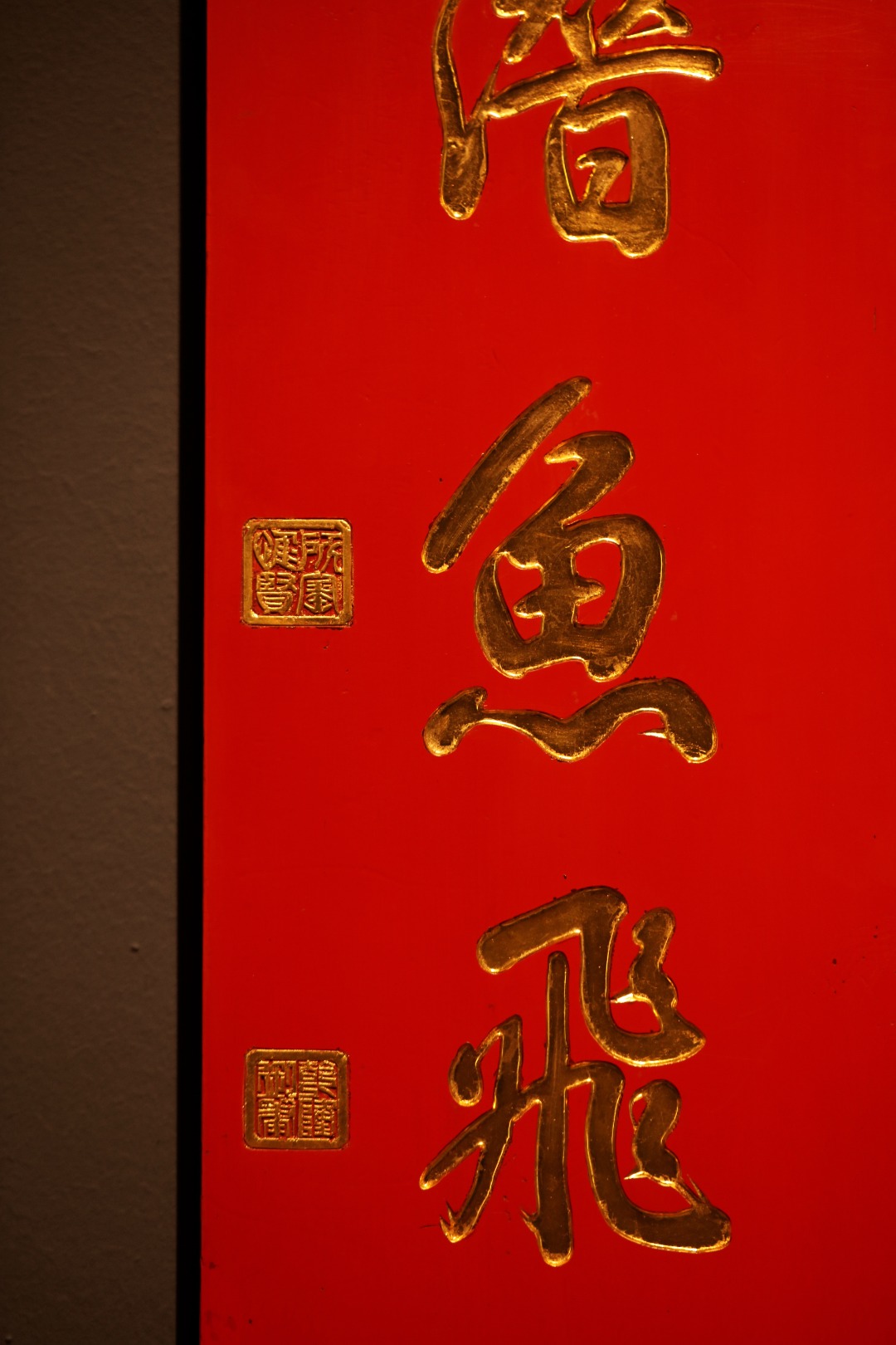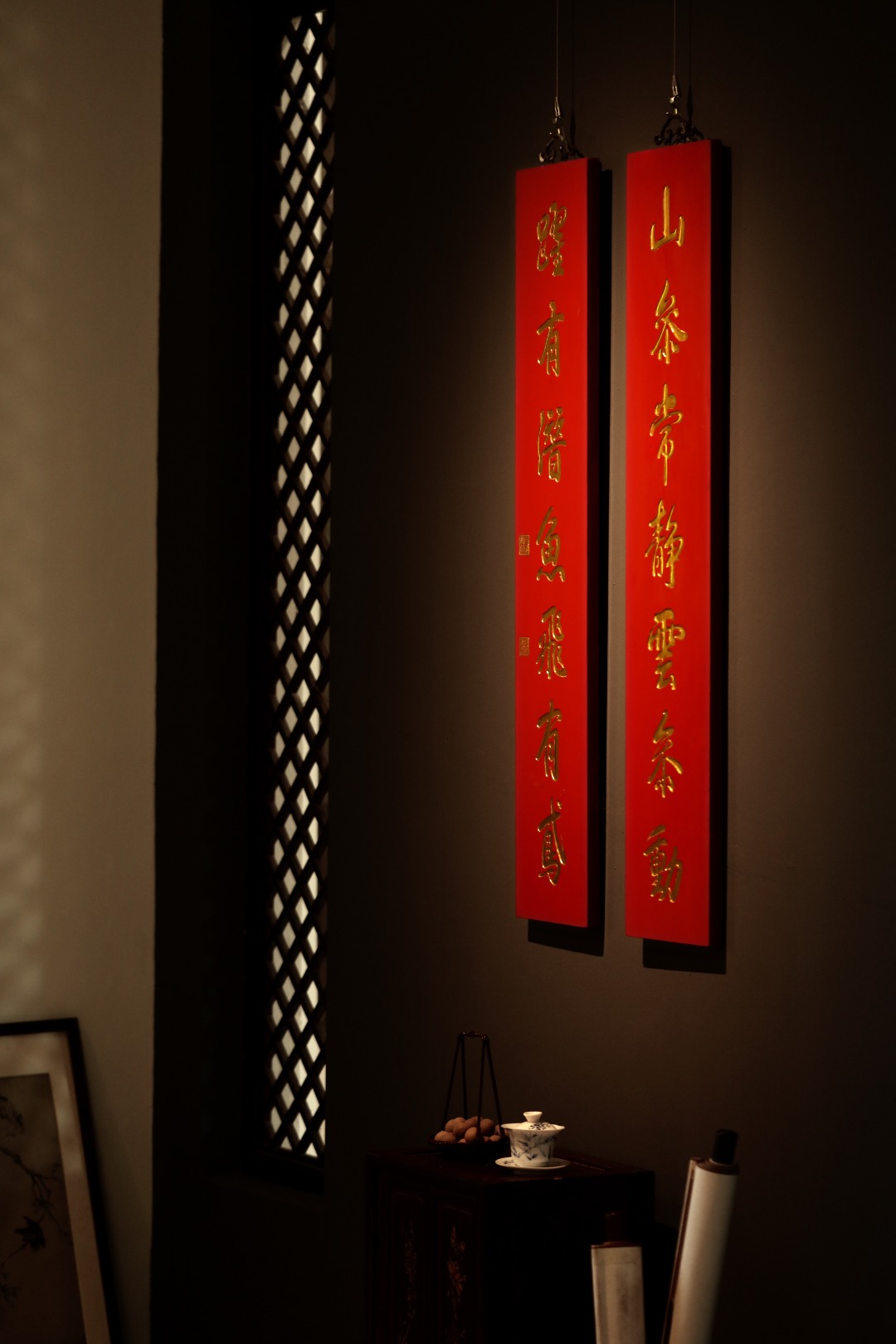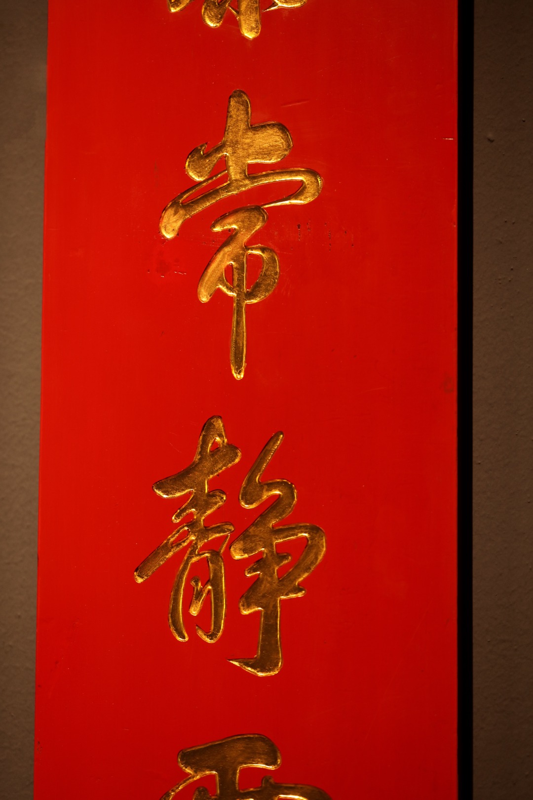 取旧时老板料,手刻对联,金箔描绘,面髹朱漆,沉着古朴,悬于空间,深得意象真趣,人生理趣,为文房雅室佳选。
