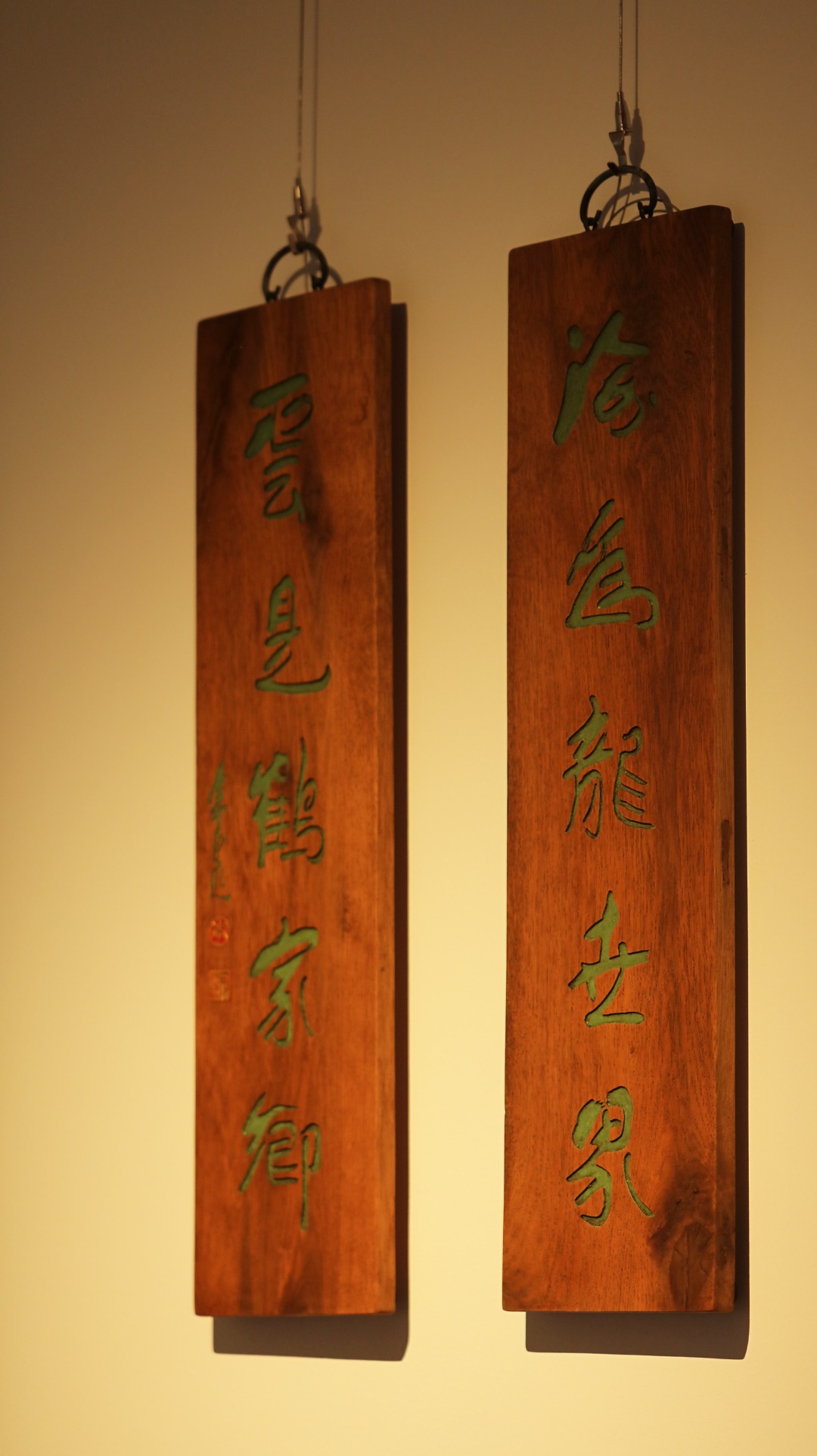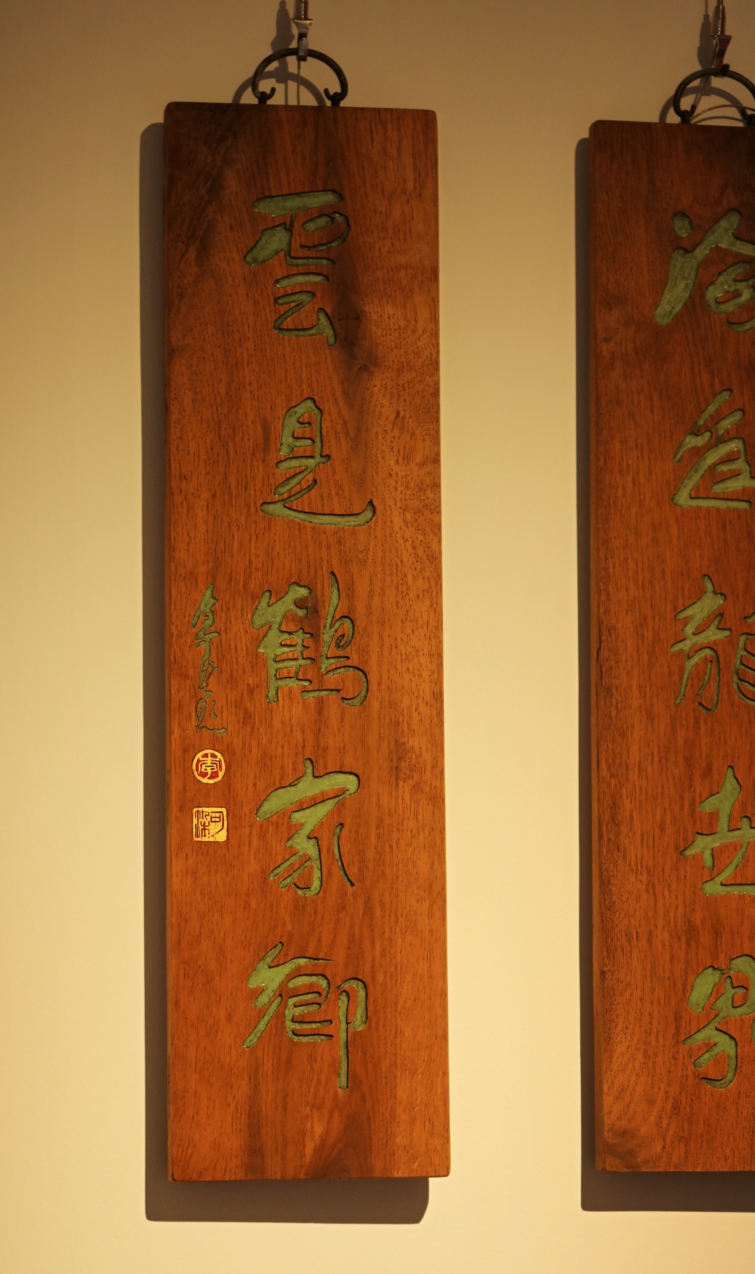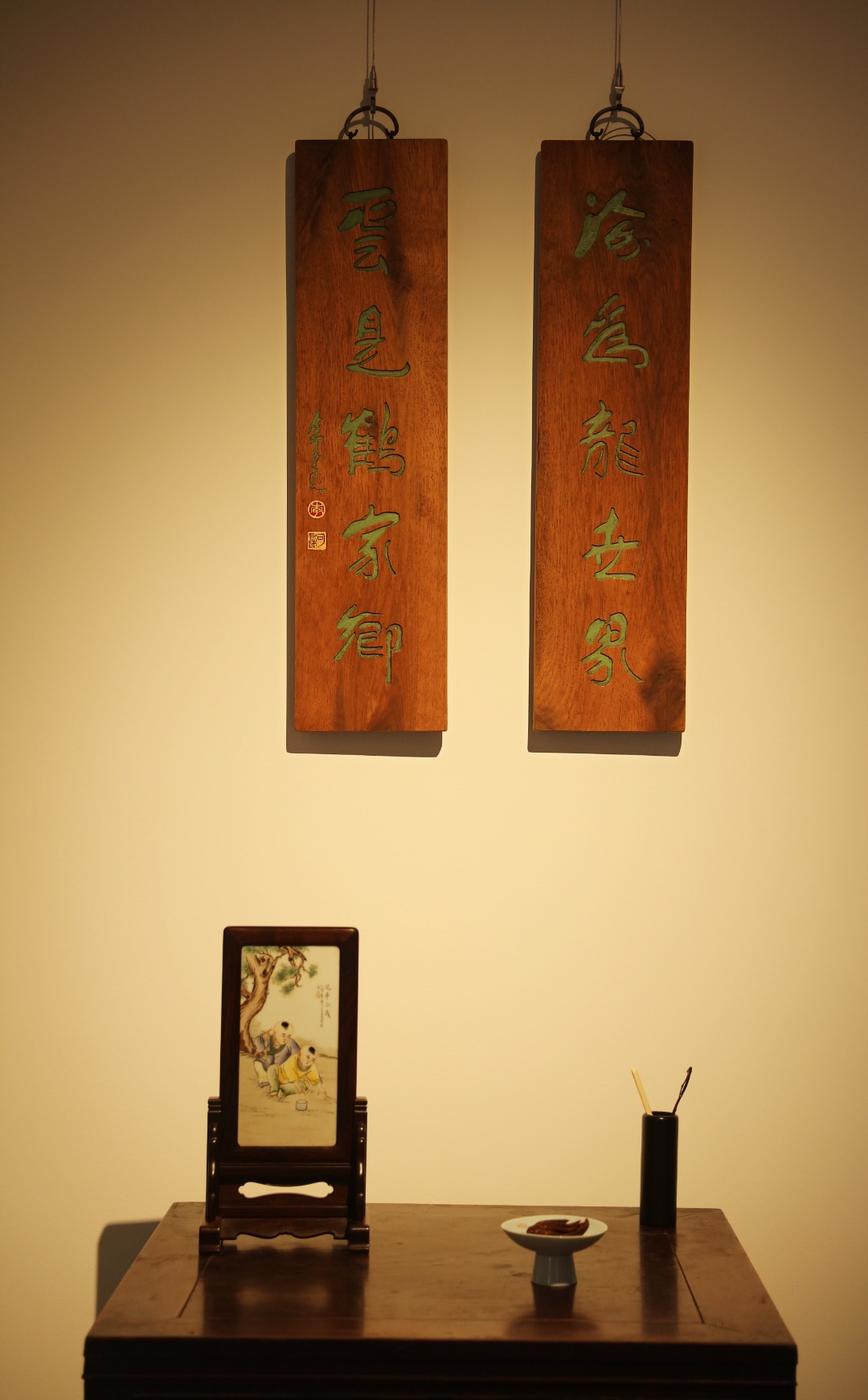 取旧时老板料,手工阴刻对联,矿彩漆绘,原皮壳沉着古朴,悬于空间,深得意象真趣,人生理趣,为文房雅室佳选。