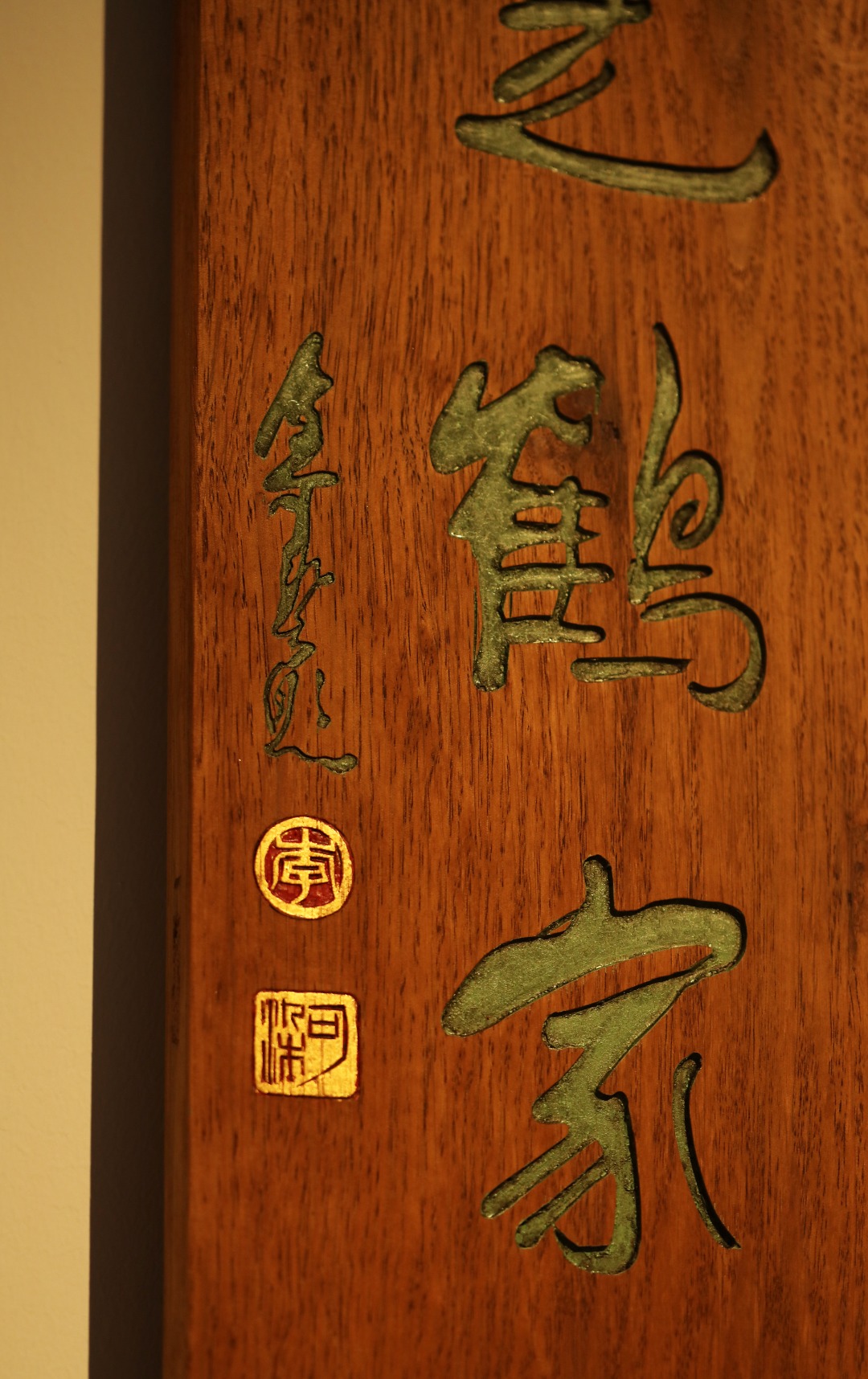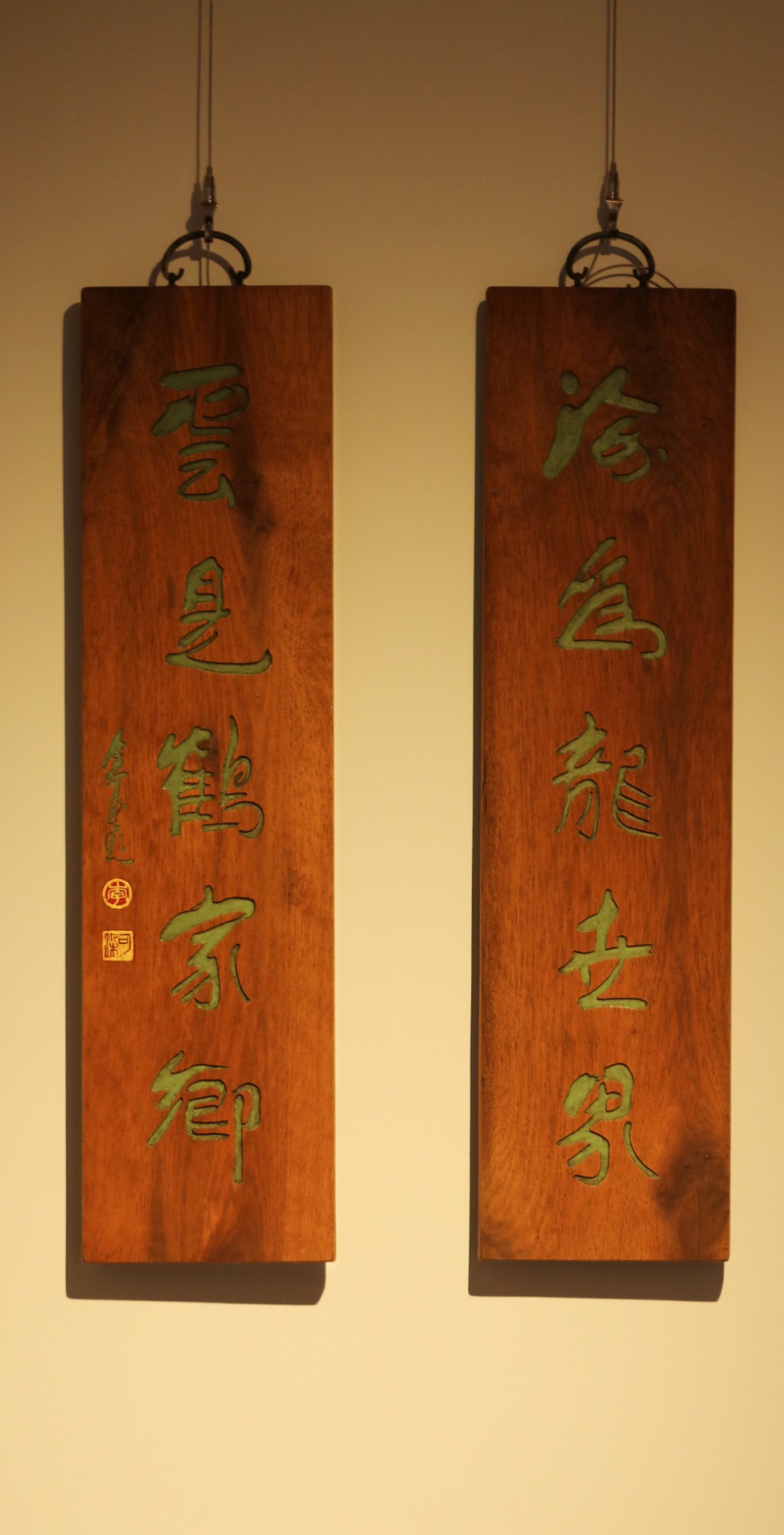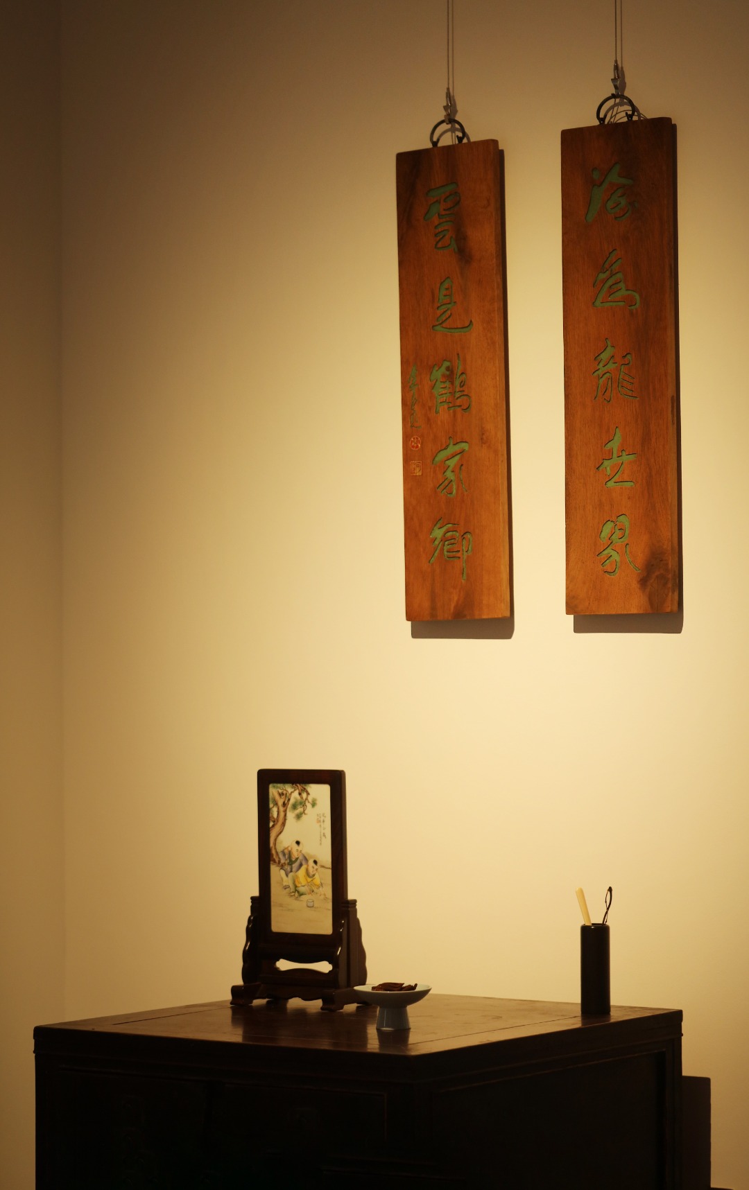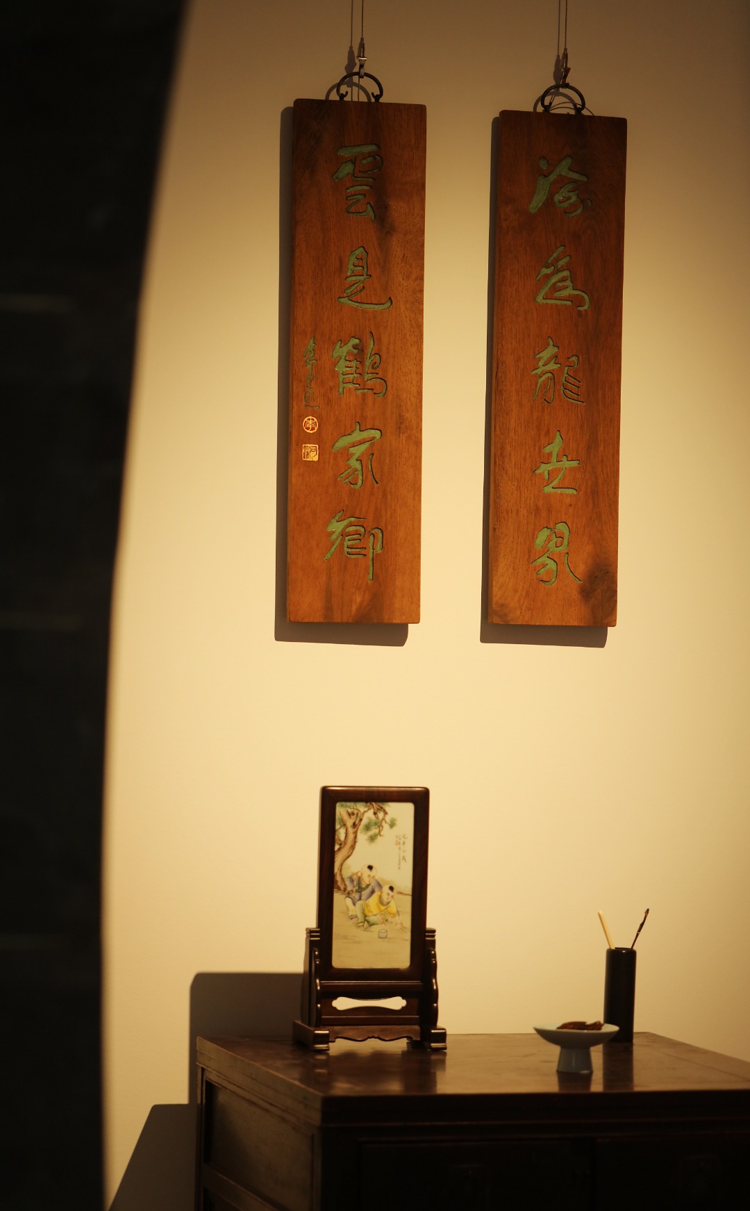 取旧时老板料,手工阴刻对联,矿彩漆绘,原皮壳沉着古朴,悬于空间,深得意象真趣,人生理趣,为文房雅室佳选。