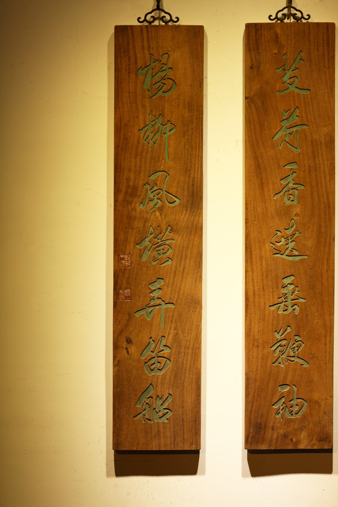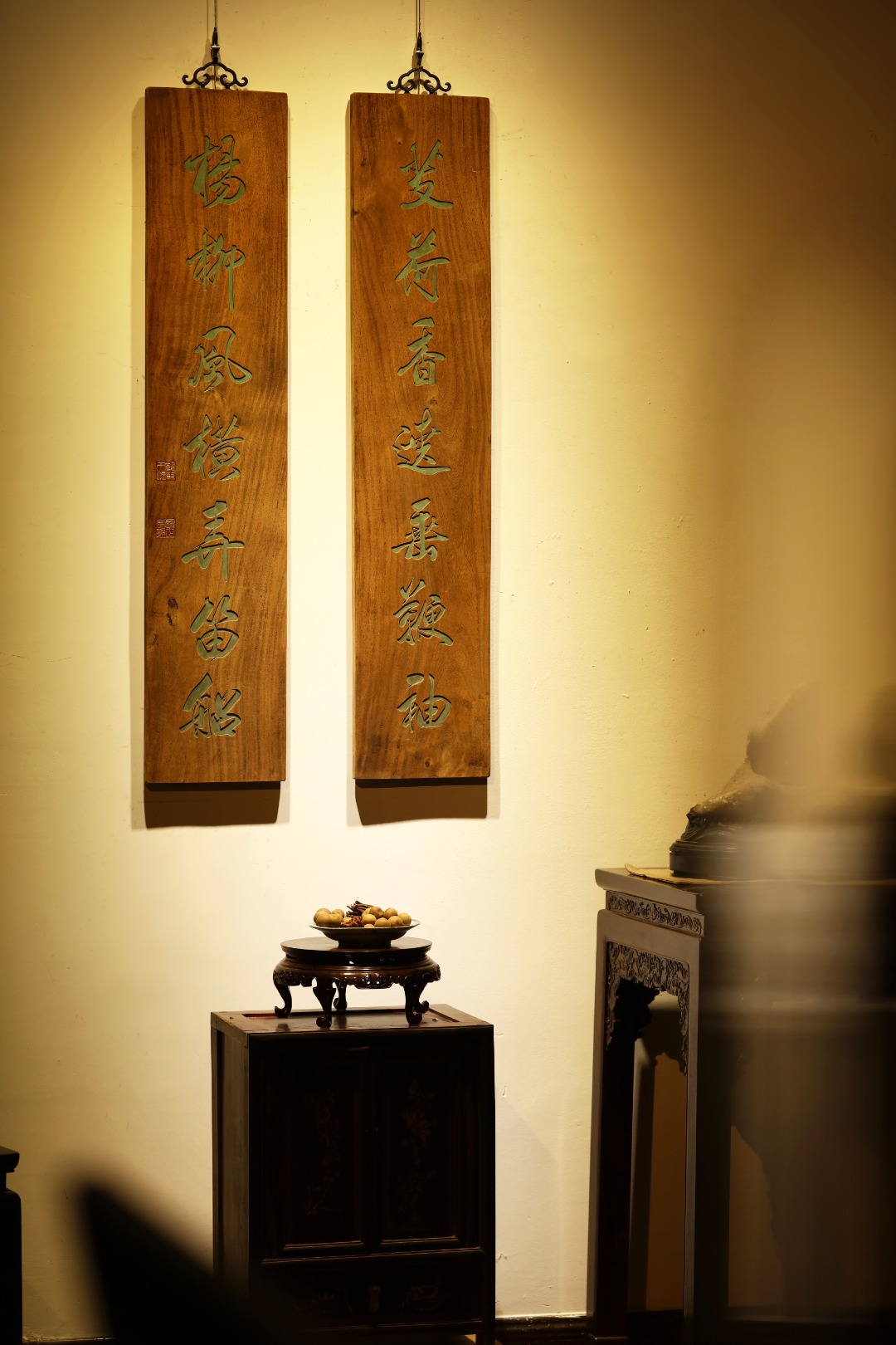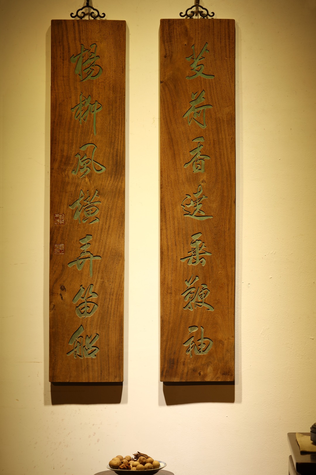 取旧时老板料,手刻对联,大漆描绘,原皮壳沉着古朴,悬于空间,深得意象真趣,人生理趣,为文房雅室佳选。