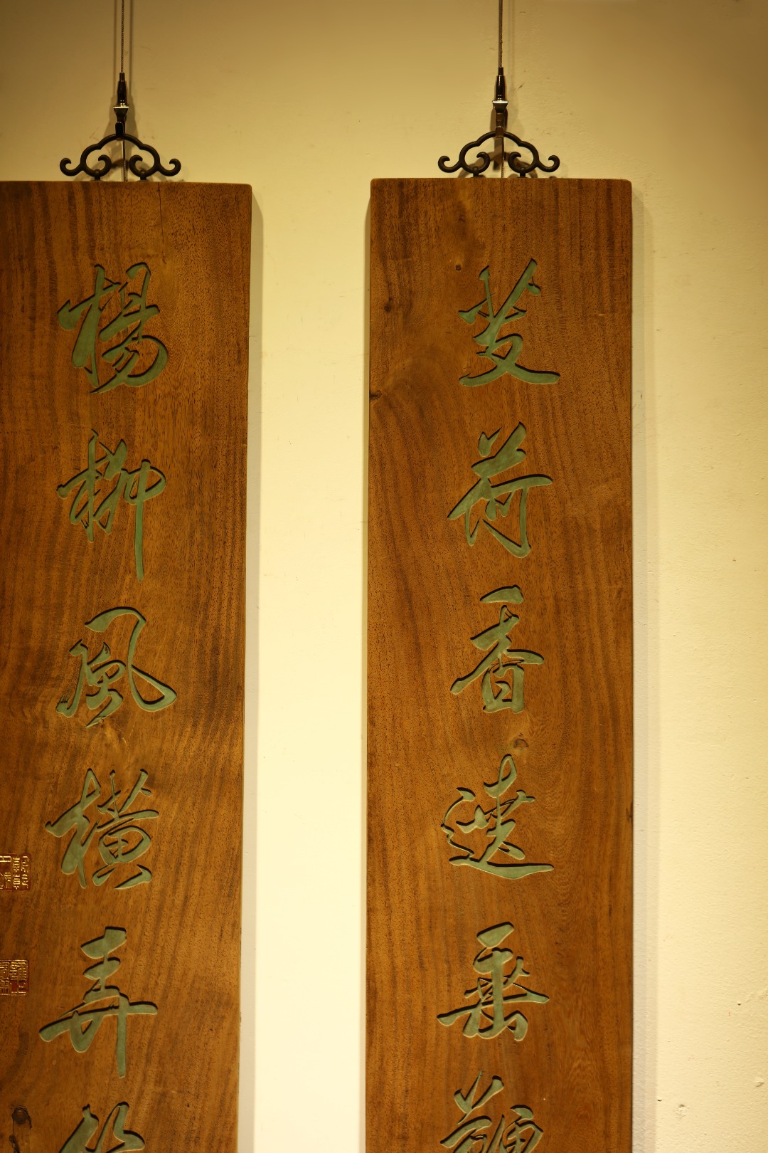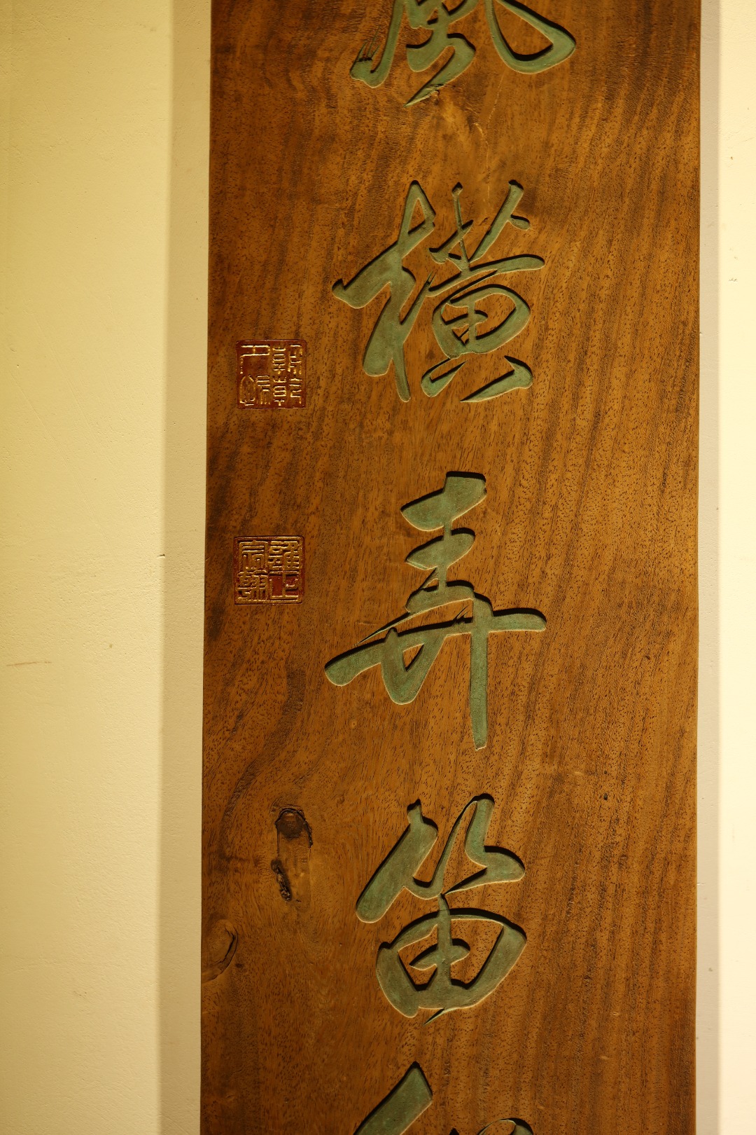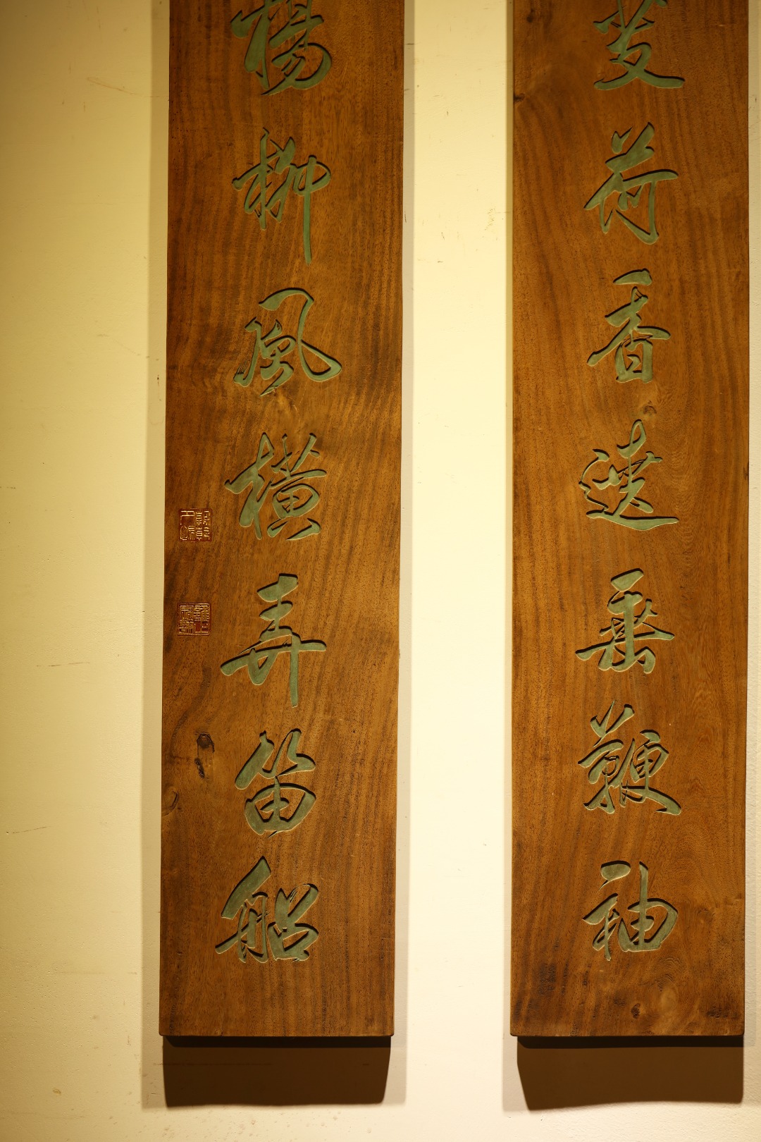 取旧时老板料,手刻对联,大漆描绘,原皮壳沉着古朴,悬于空间,深得意象真趣,人生理趣,为文房雅室佳选。