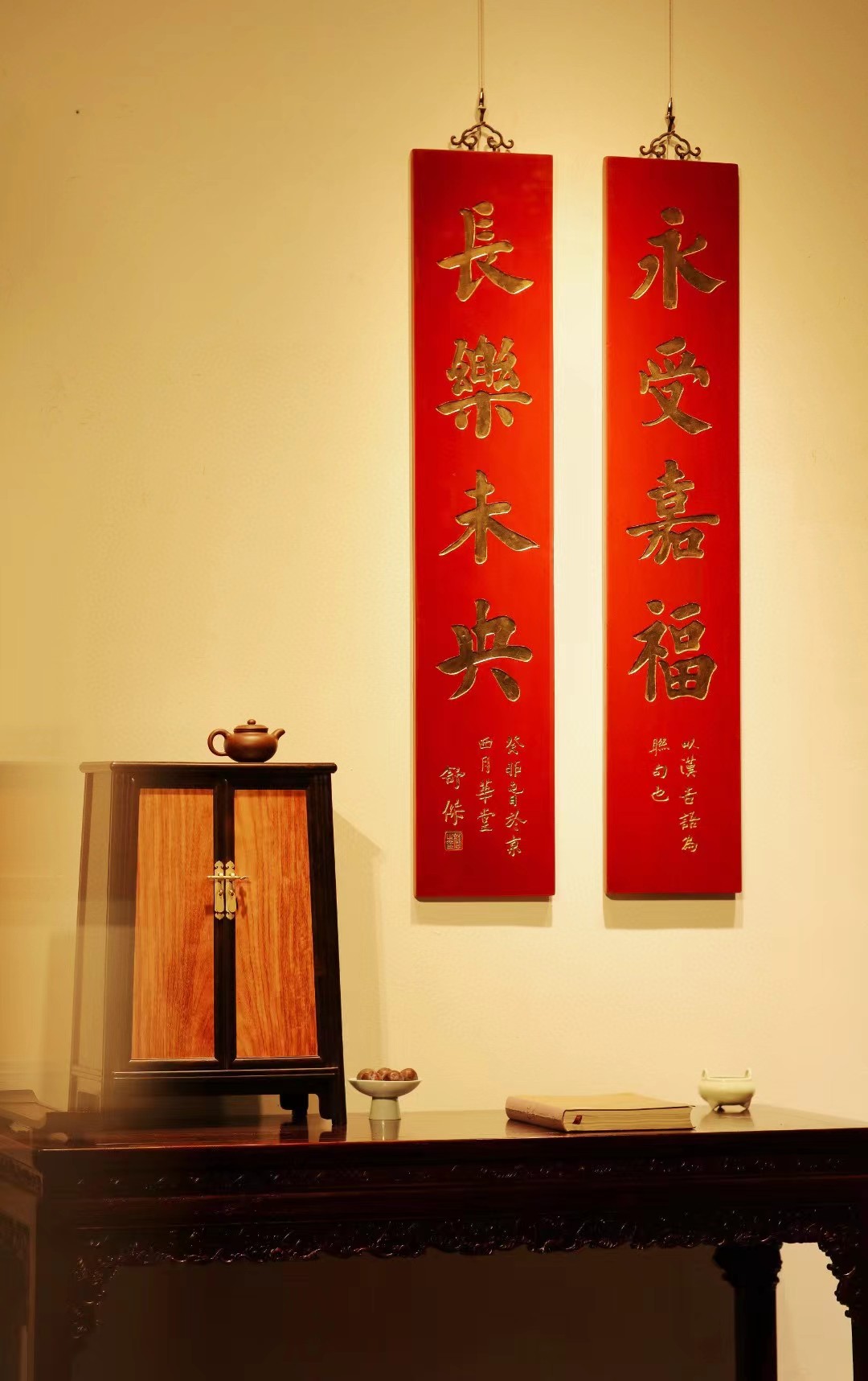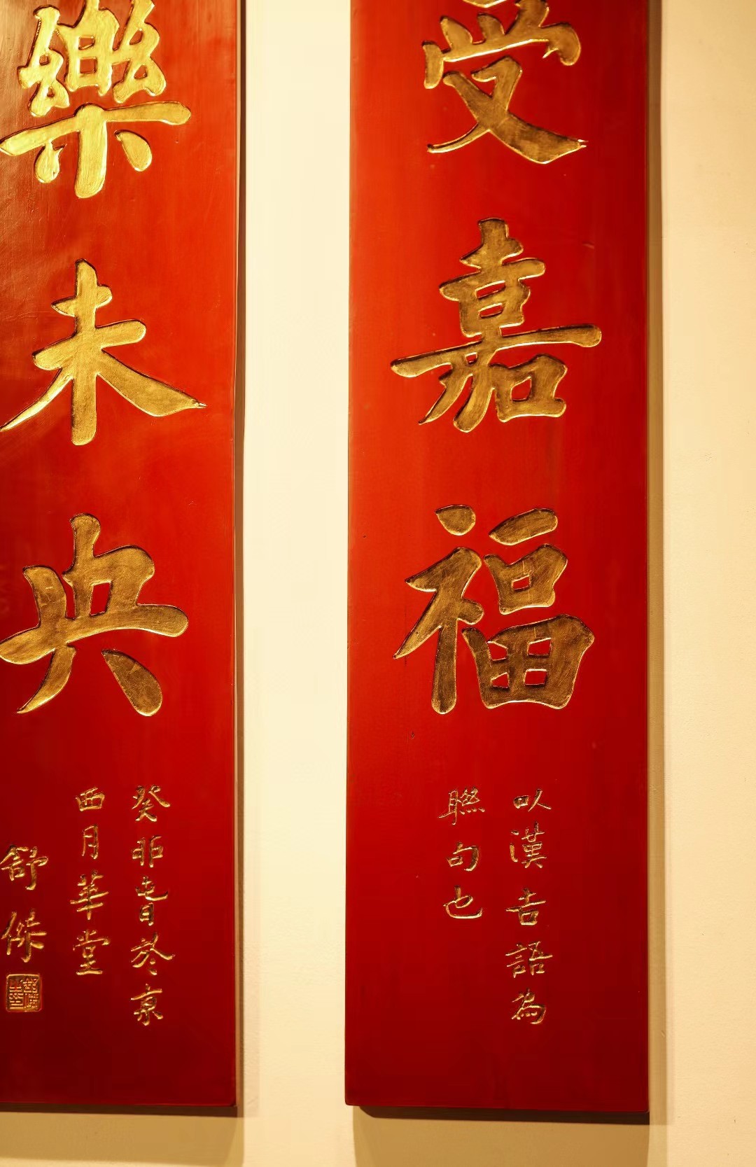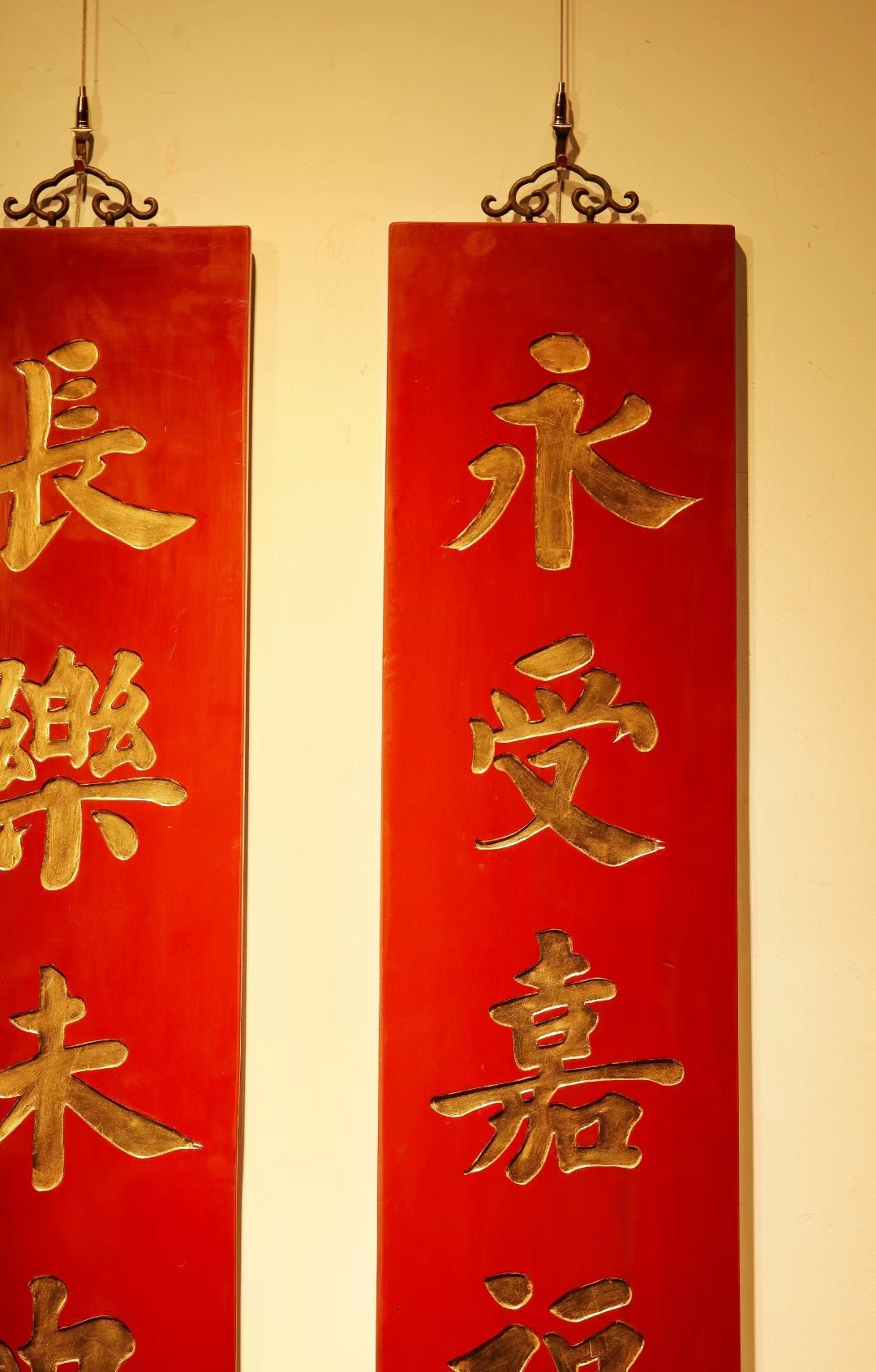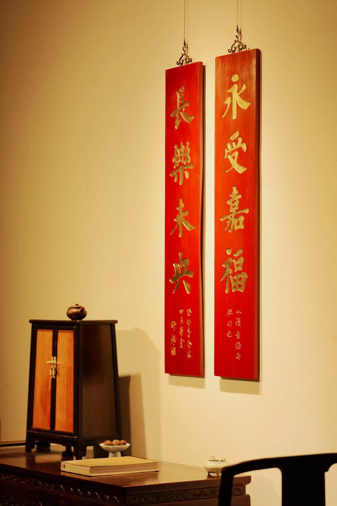 取旧时老楠木板料,质地古朴,手刻对联,真金箔贴就。深得意象真趣,人生理趣,为文房雅室佳选。