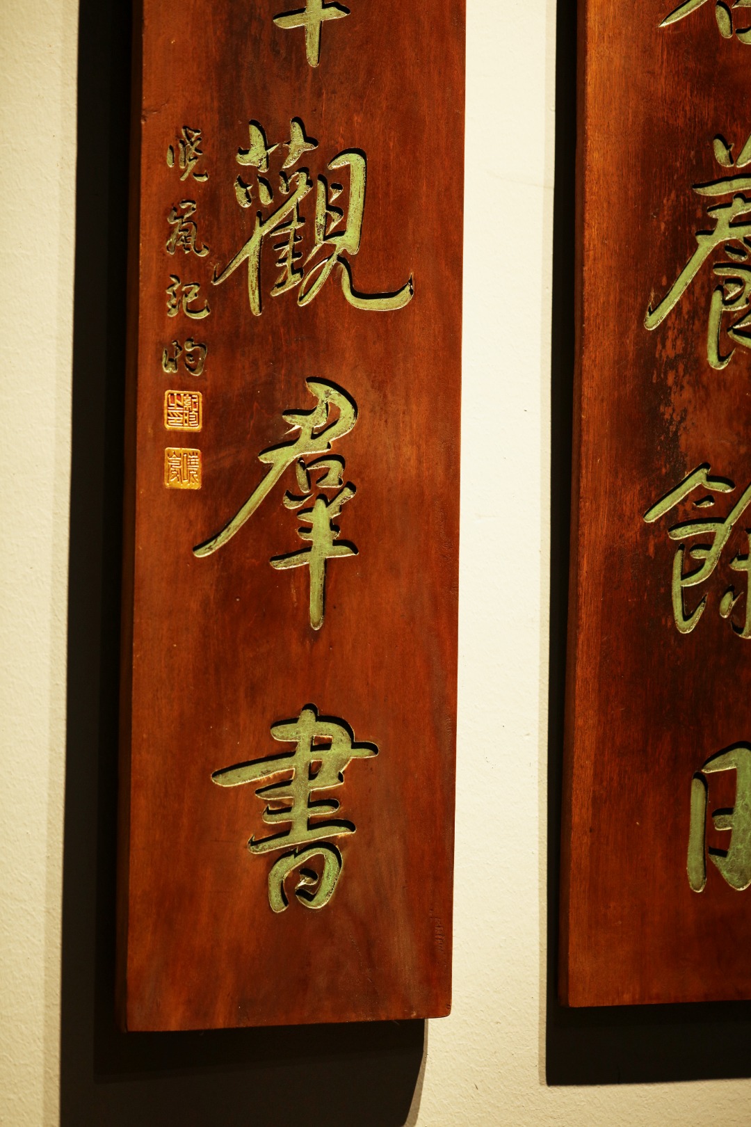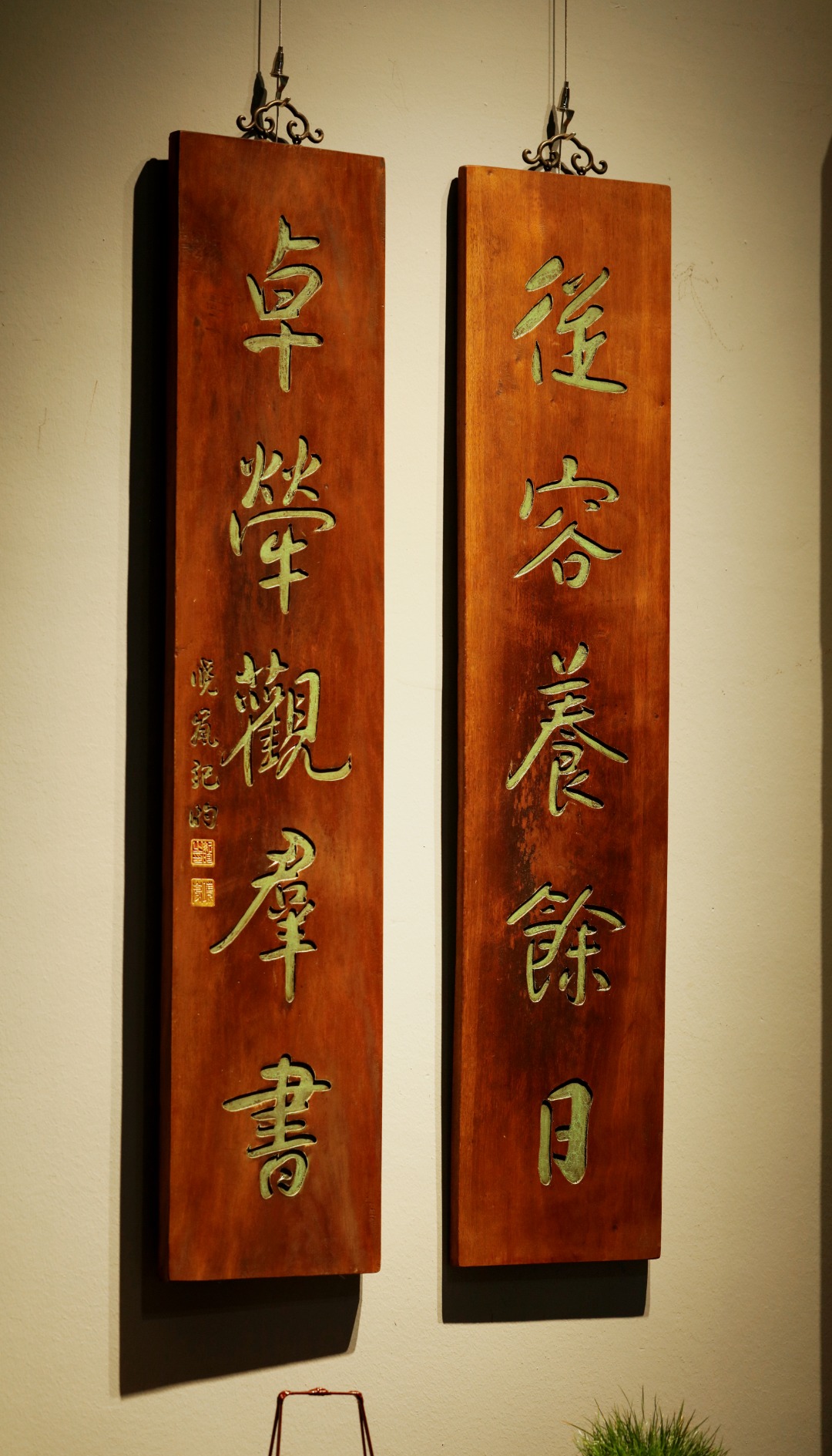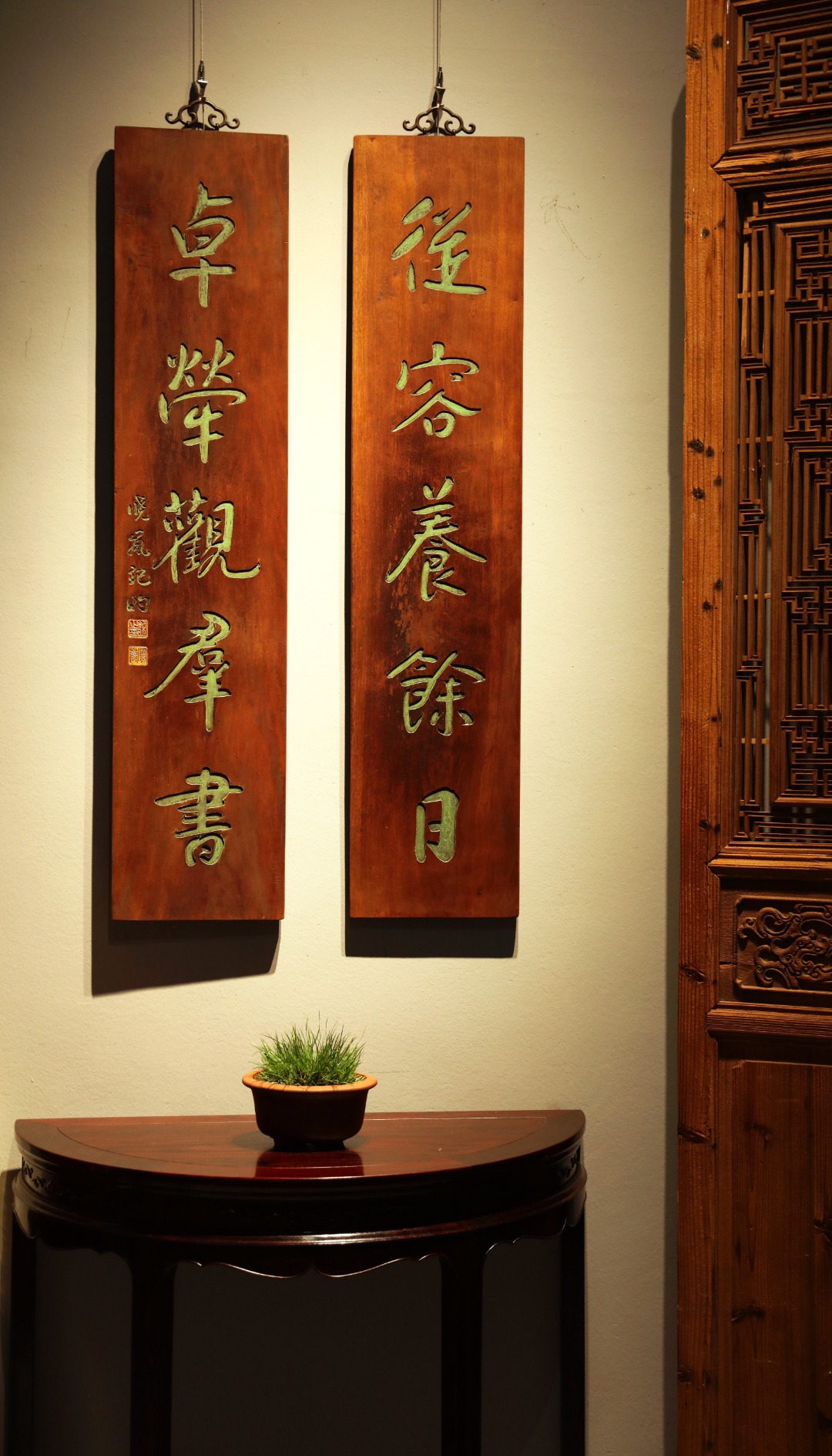 取旧时老板料,手刻对联,矿彩漆绘,原皮壳沉着古朴,悬于空间,深得意象真趣,人生理趣,为文房雅室佳选。