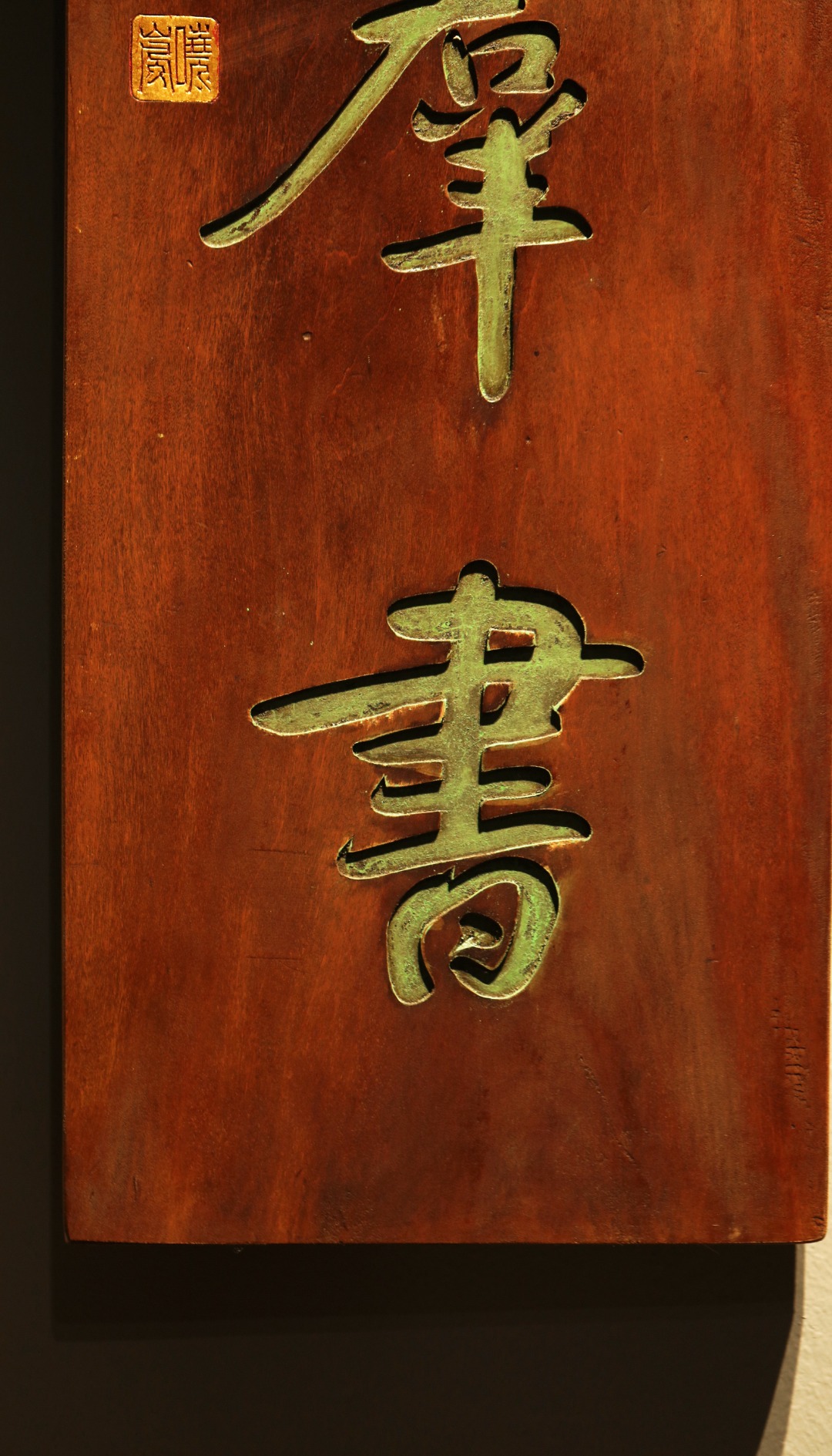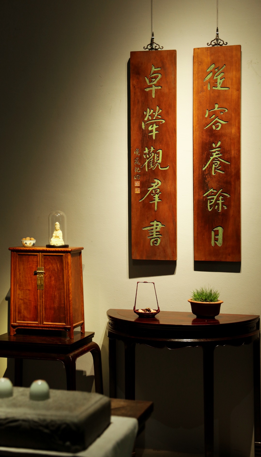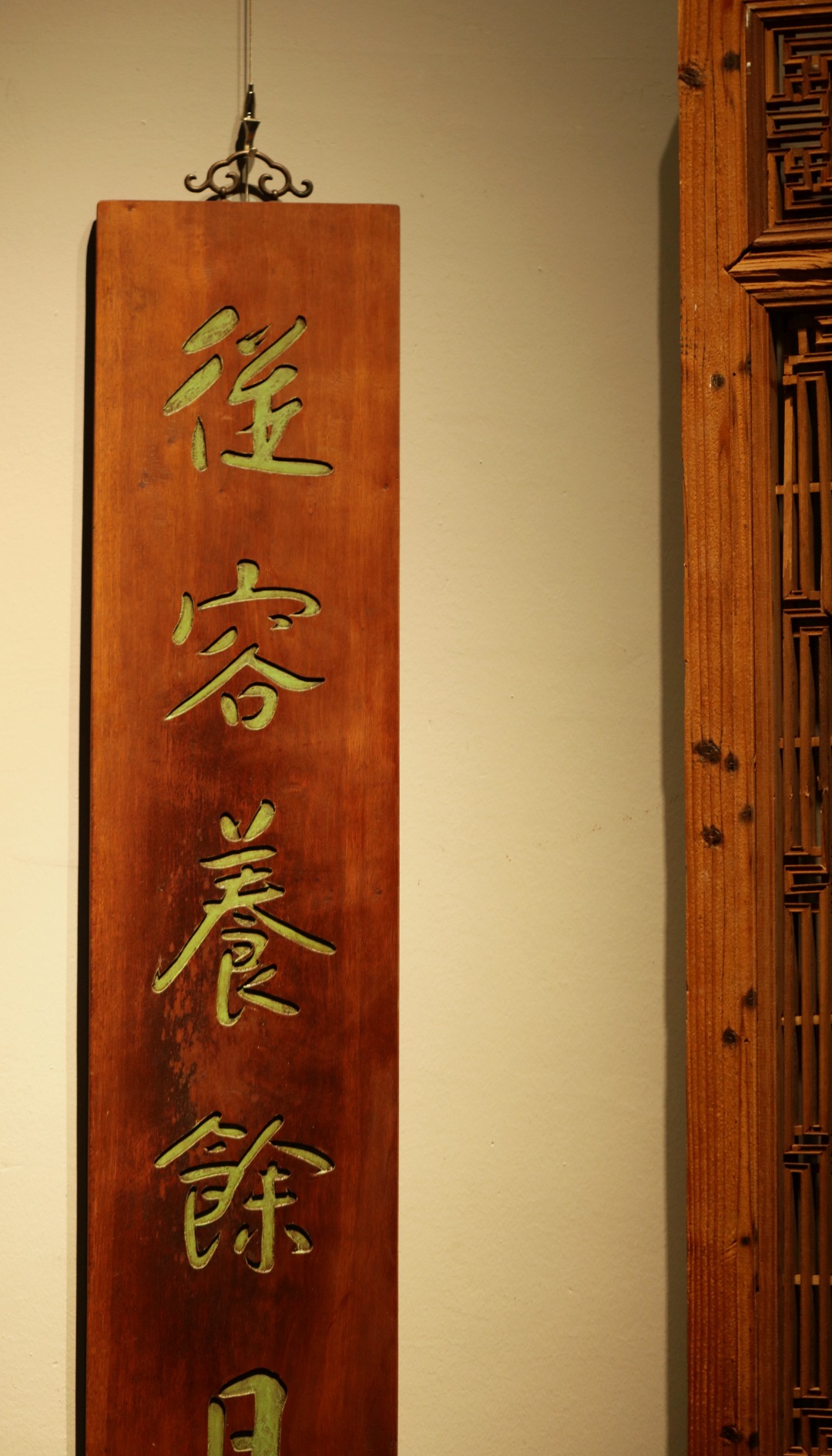 取旧时老板料,手刻对联,矿彩漆绘,原皮壳沉着古朴,悬于空间,深得意象真趣,人生理趣,为文房雅室佳选。