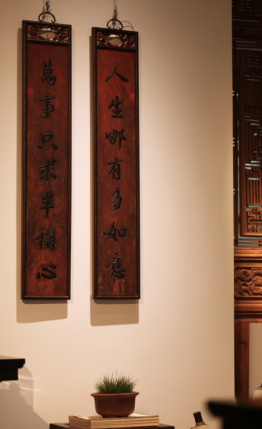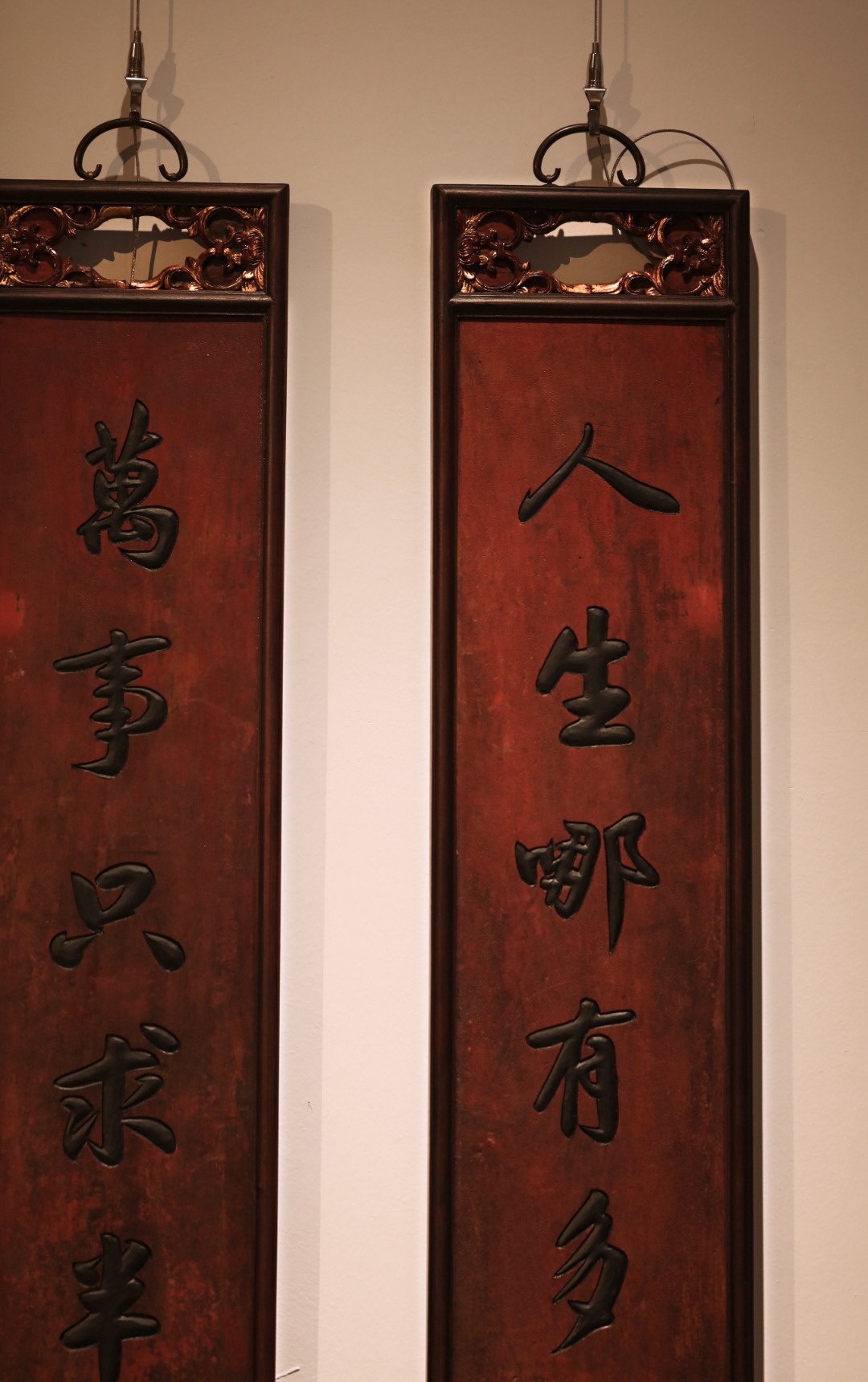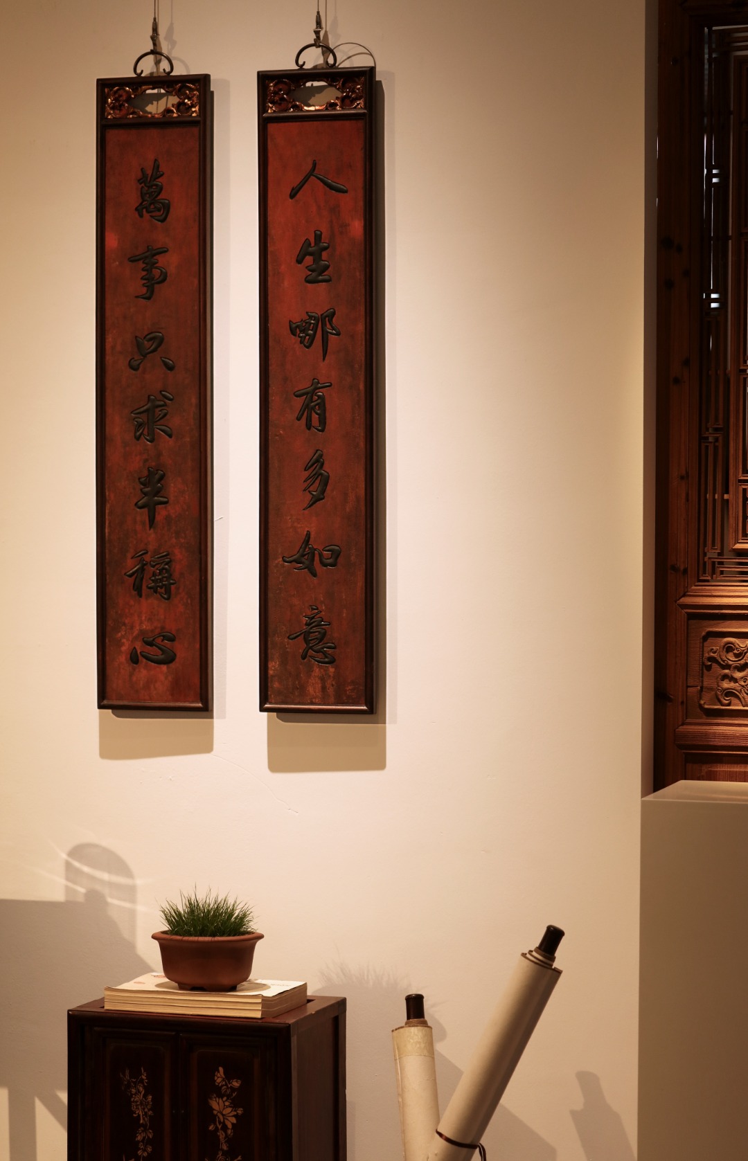 取旧时老板料,手工阳刻对联,矿彩漆绘,原皮壳沉着古朴,悬于空间,深得意象真趣,人生理趣,为文房雅室佳选。