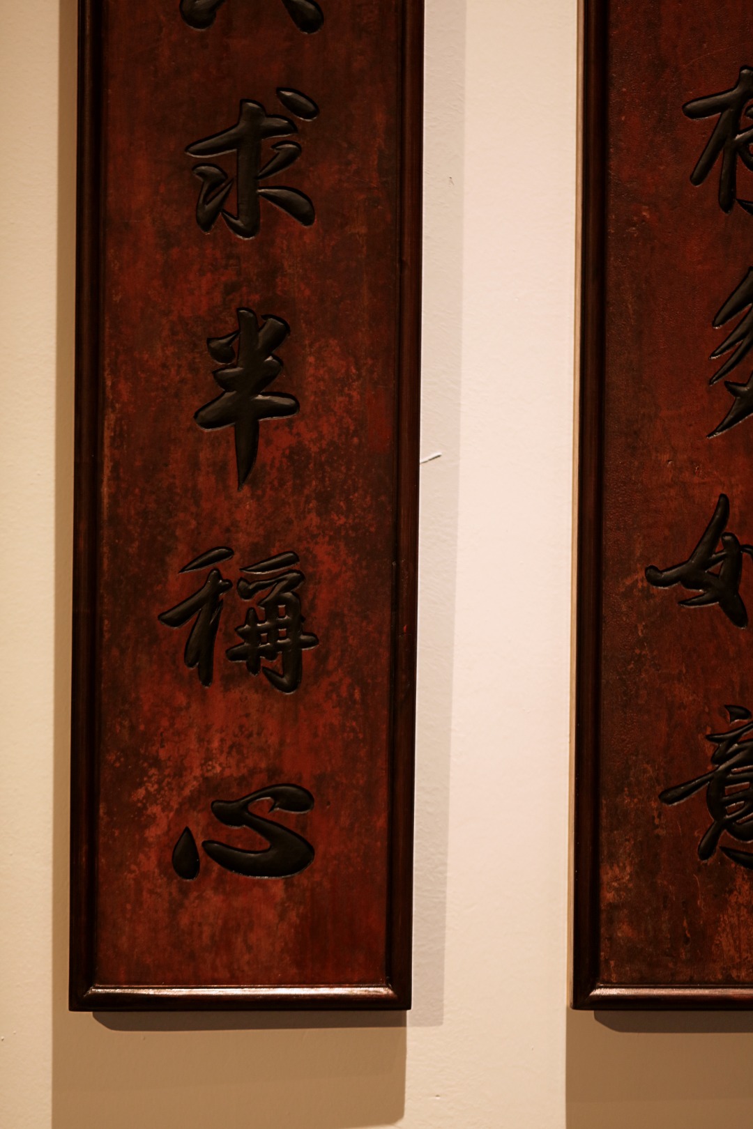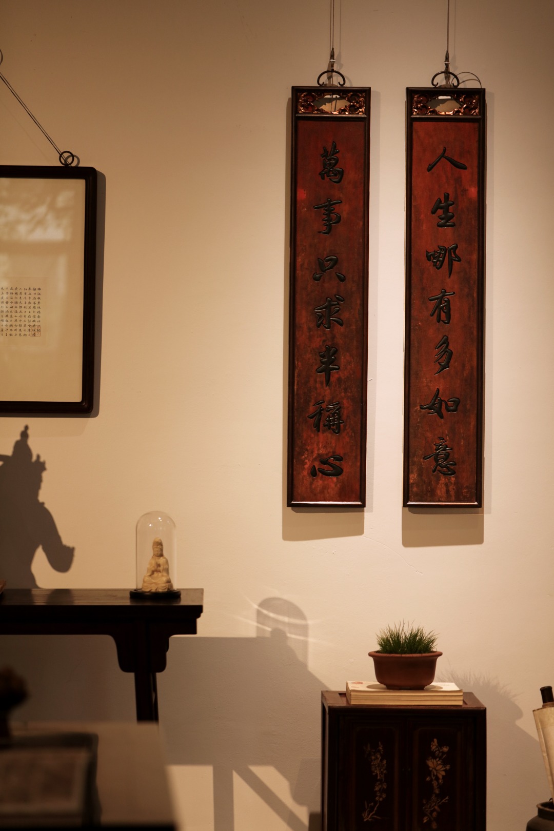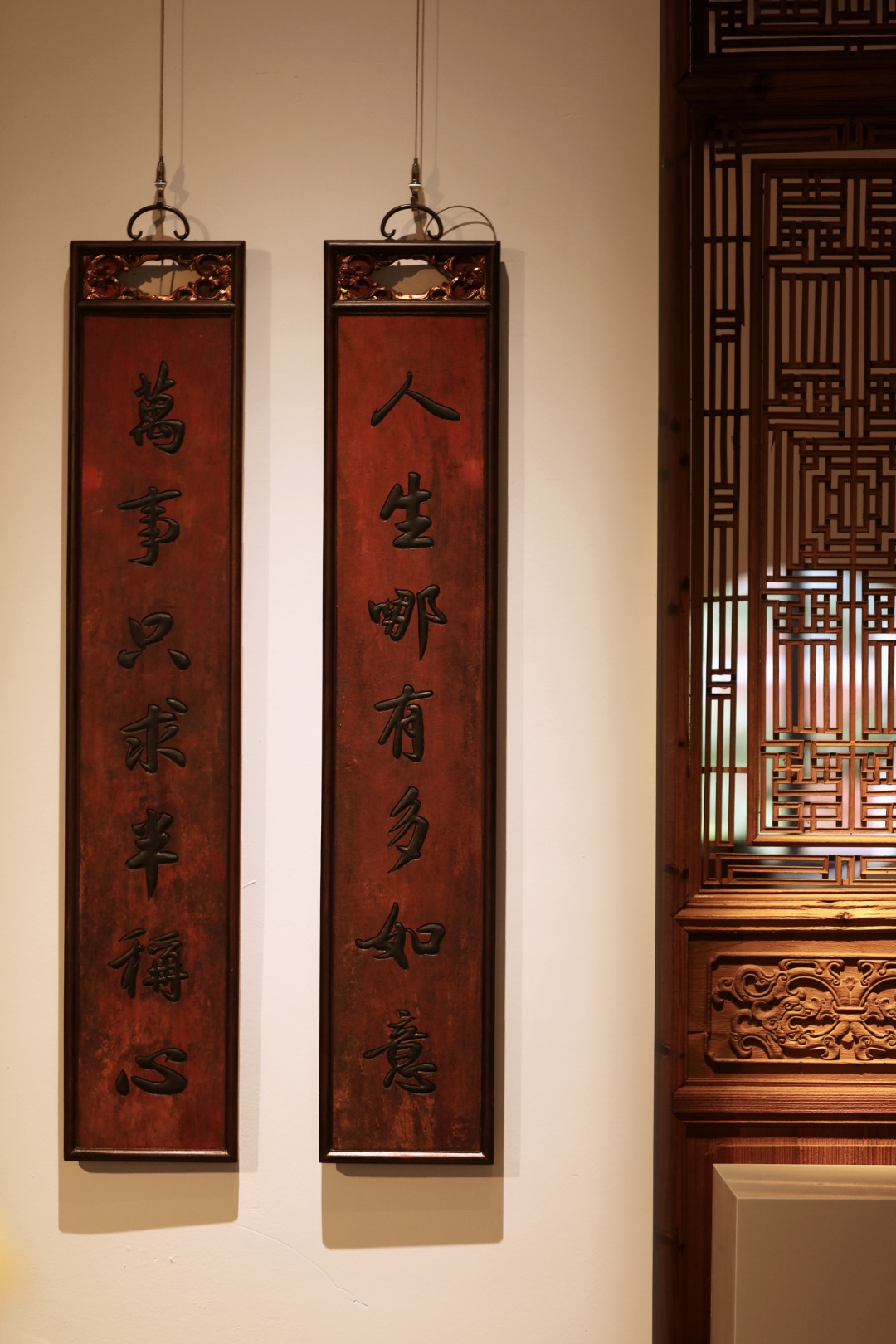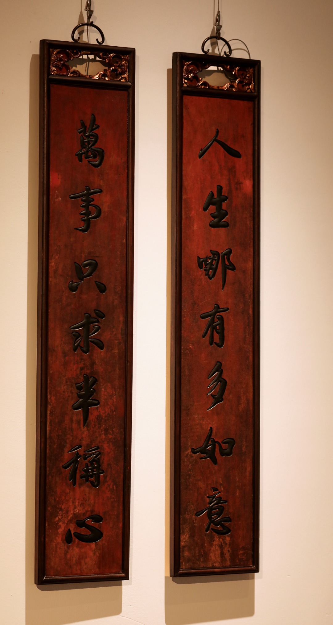 取旧时老板料,手工阳刻对联,矿彩漆绘,原皮壳沉着古朴,悬于空间,深得意象真趣,人生理趣,为文房雅室佳选。