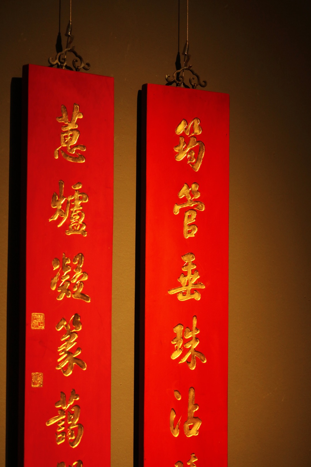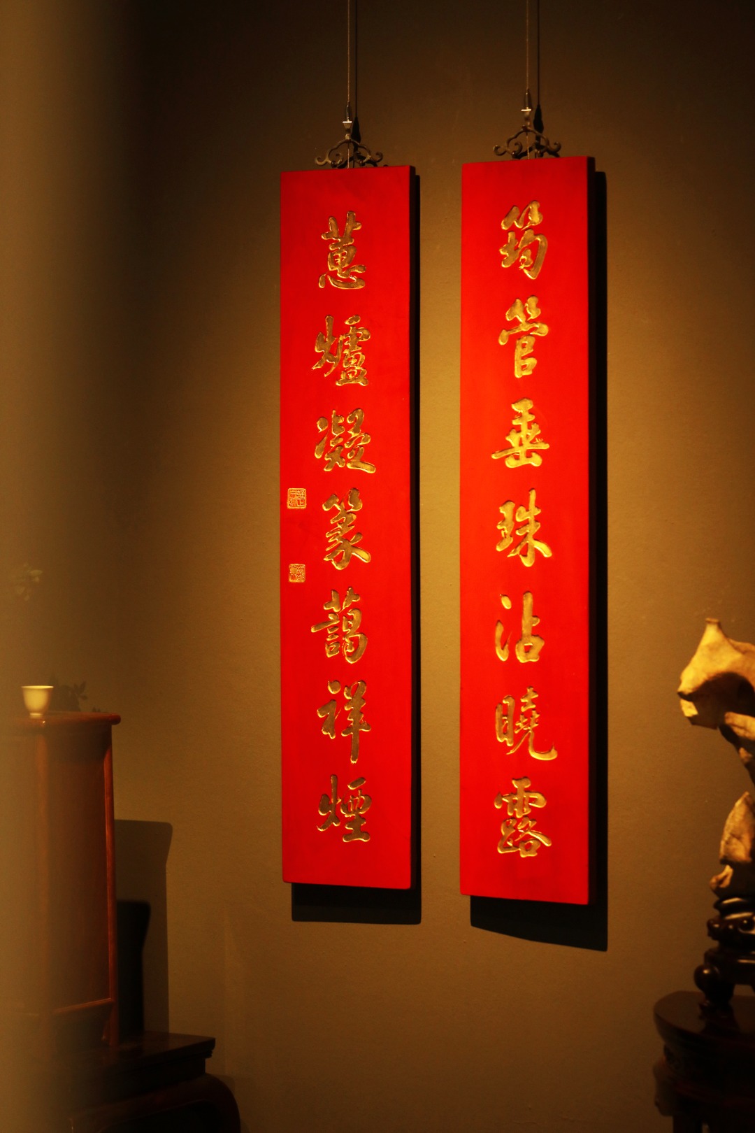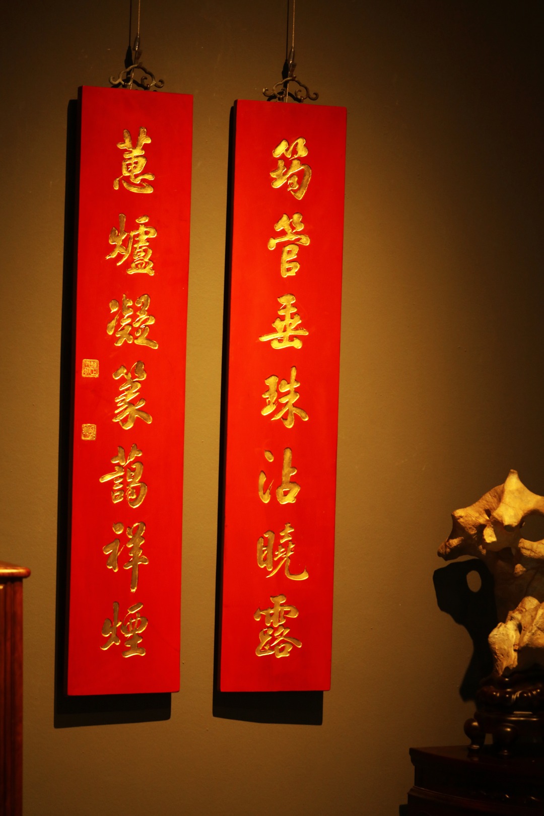 取旧时老板料,手刻对联,金箔贴就,皮壳沉着古朴,悬于空间,深得意象真趣,人生理趣,为文房雅室佳选。