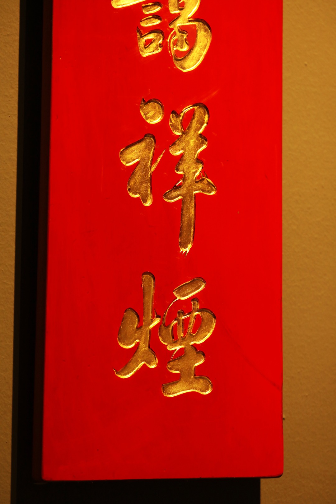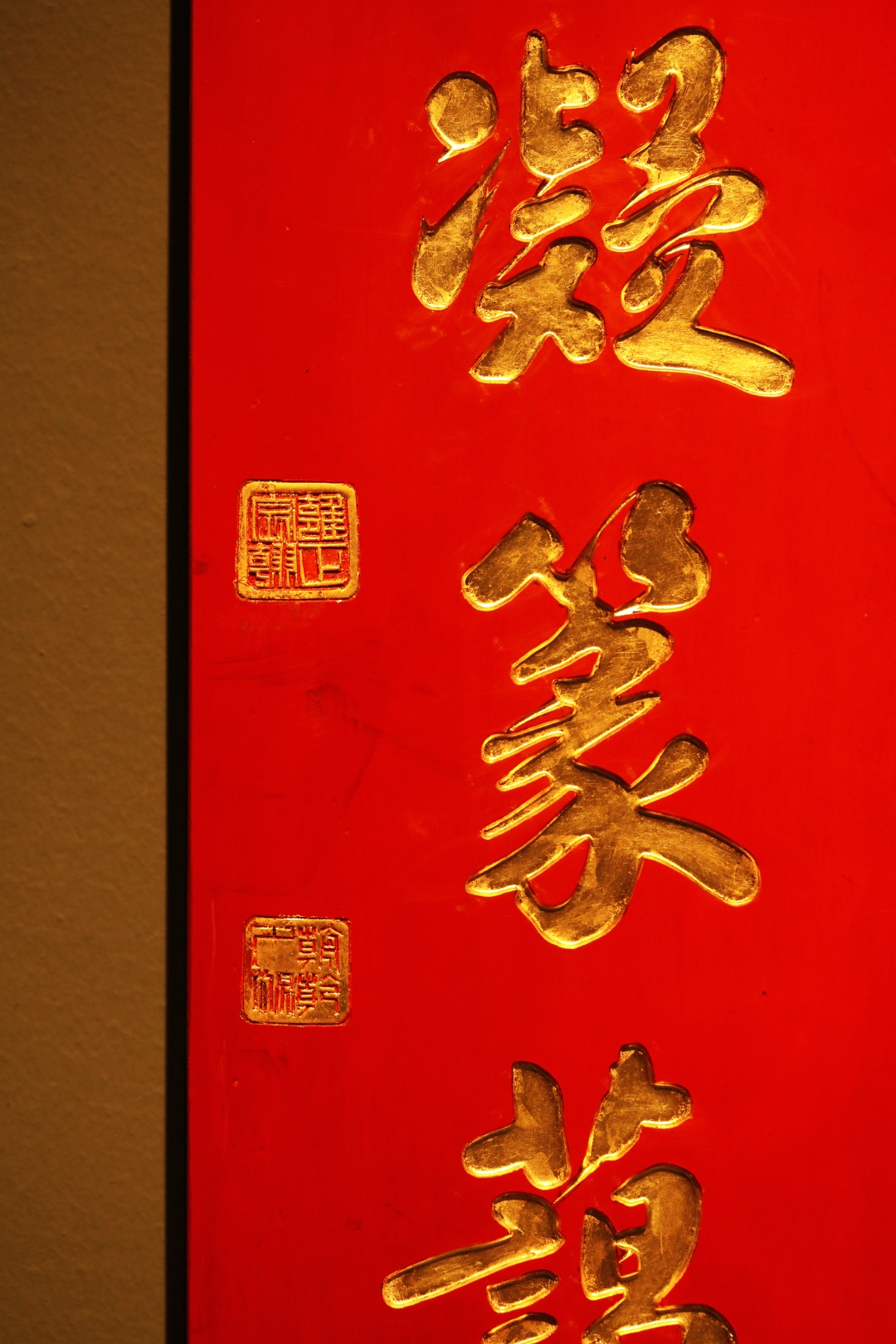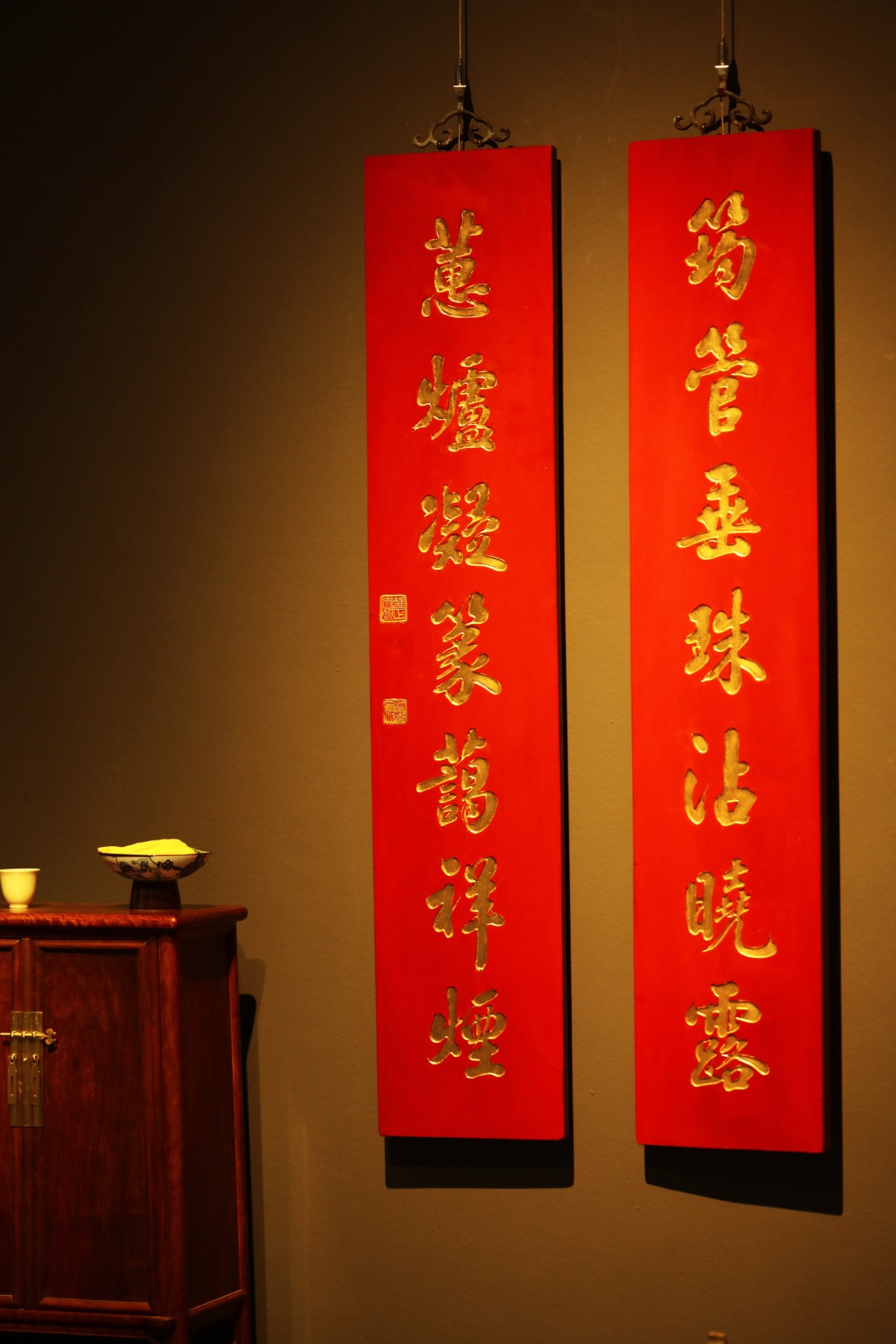 取旧时老板料,手刻对联,金箔贴就,皮壳沉着古朴,悬于空间,深得意象真趣,人生理趣,为文房雅室佳选。