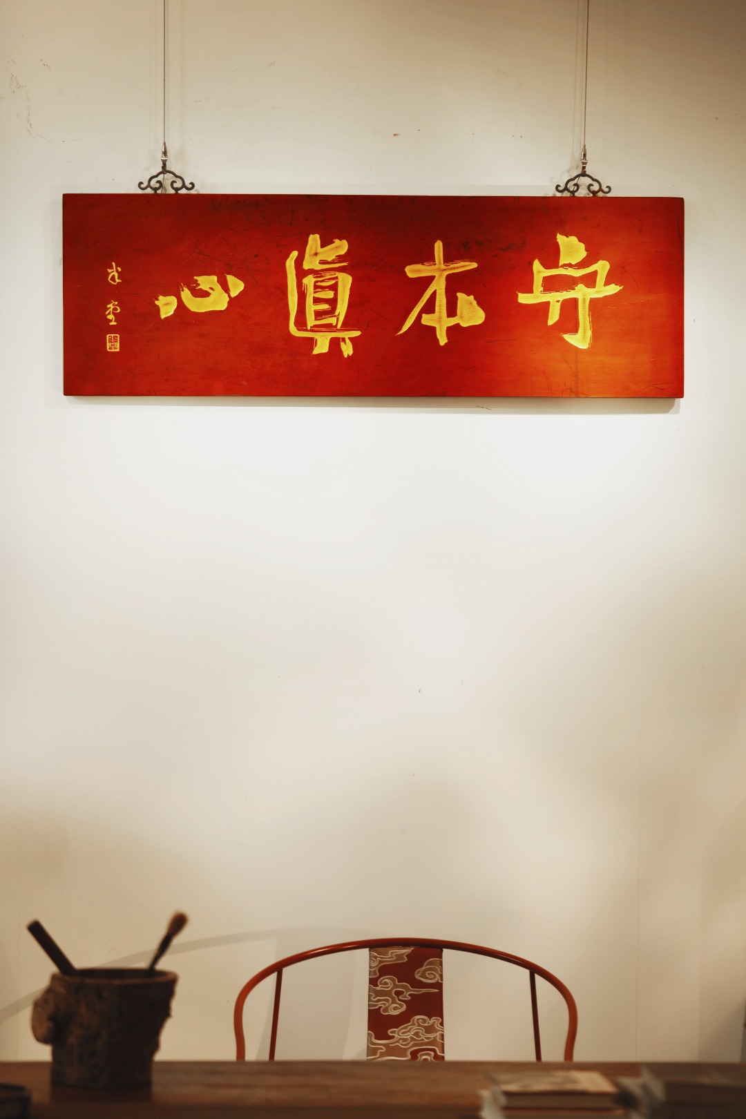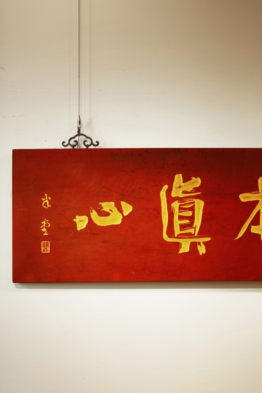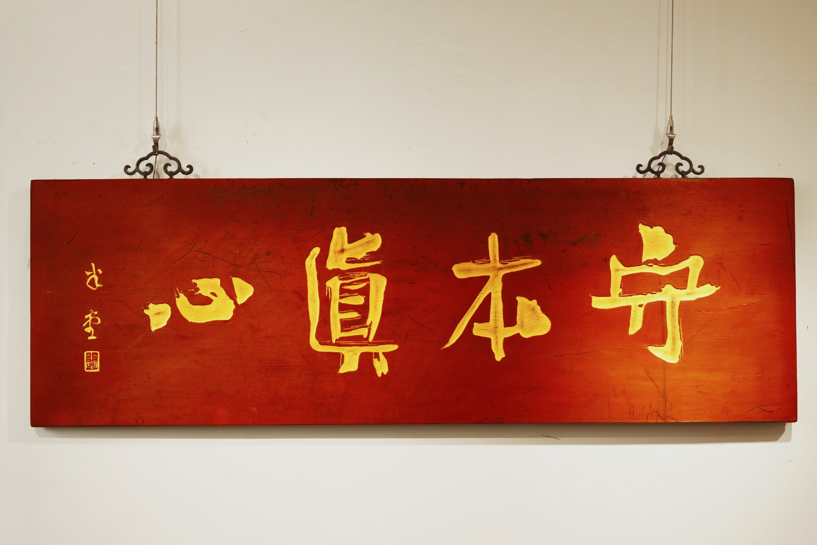 题字“守本真心”,手工贴金箔;