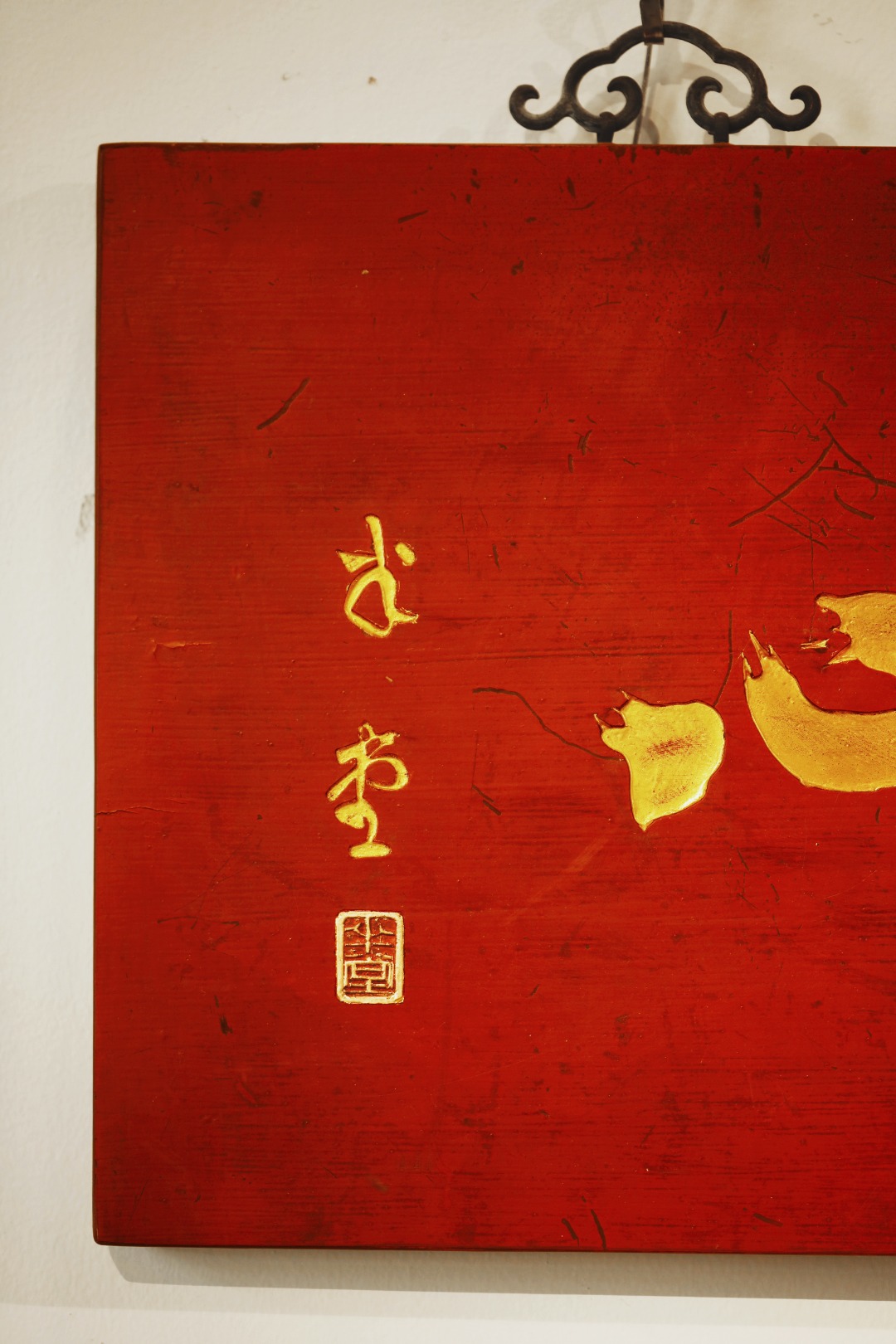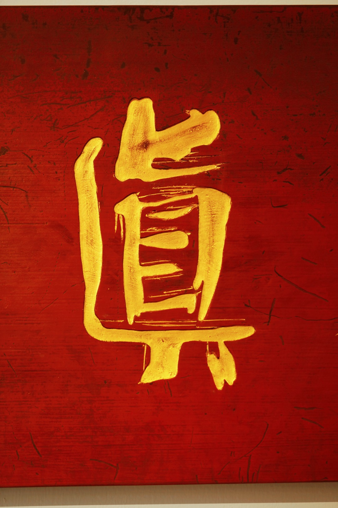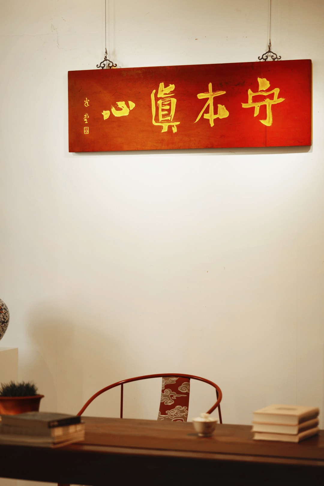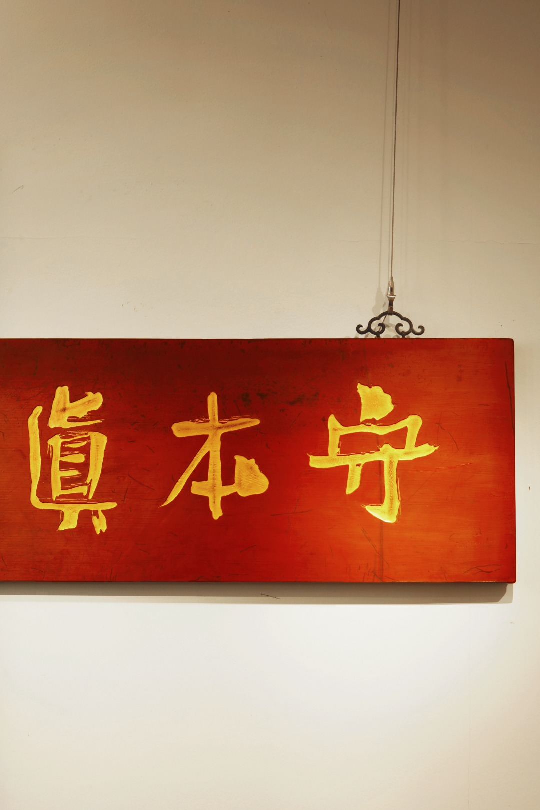 题字“守本真心”,手工贴金箔;