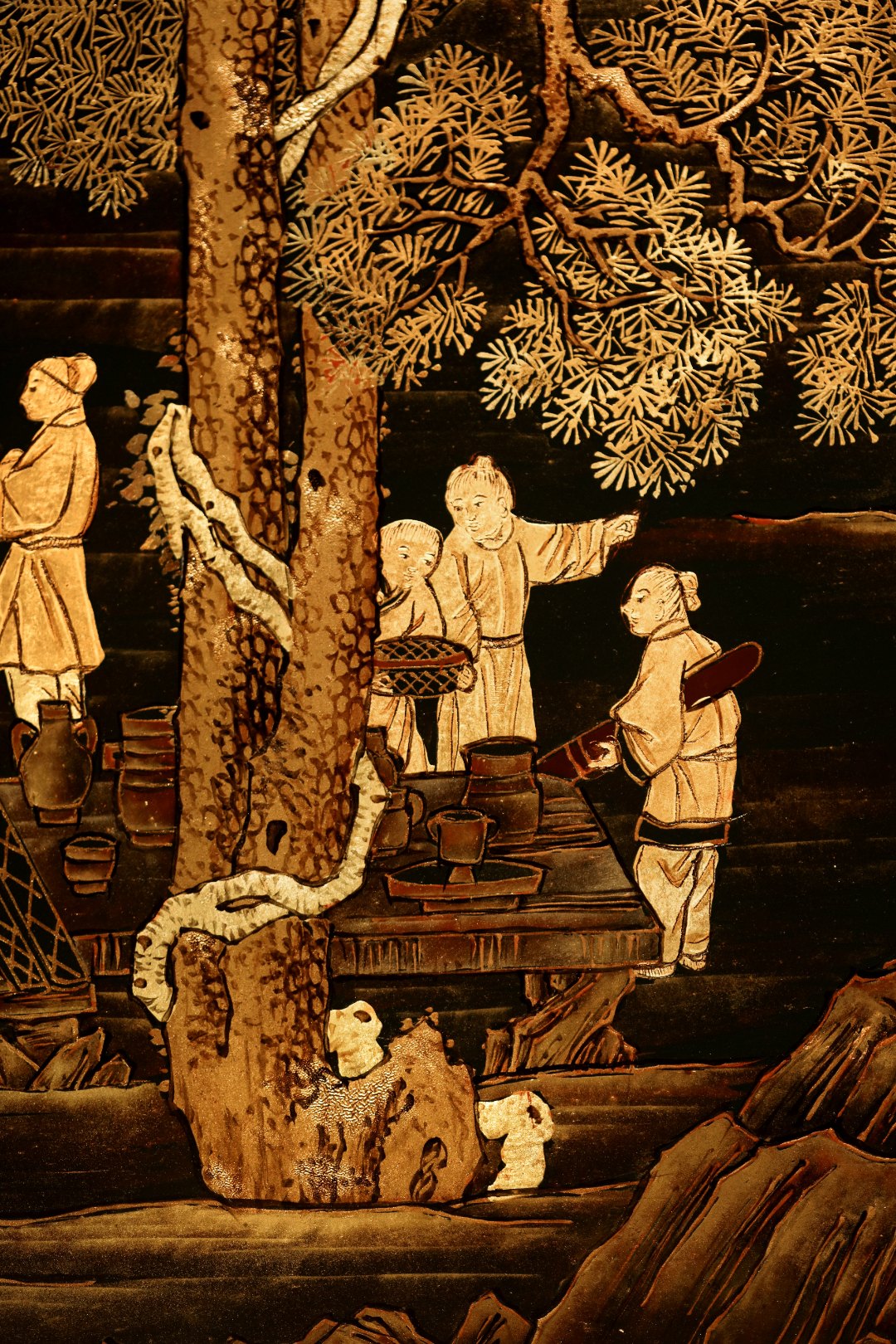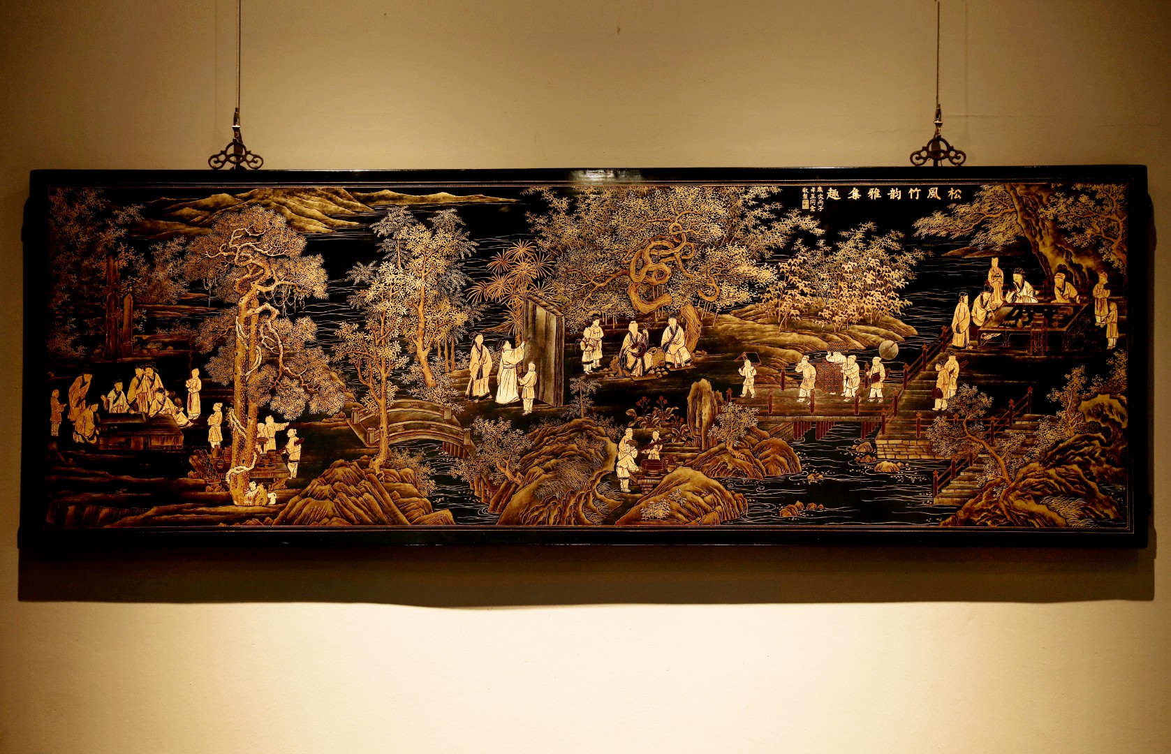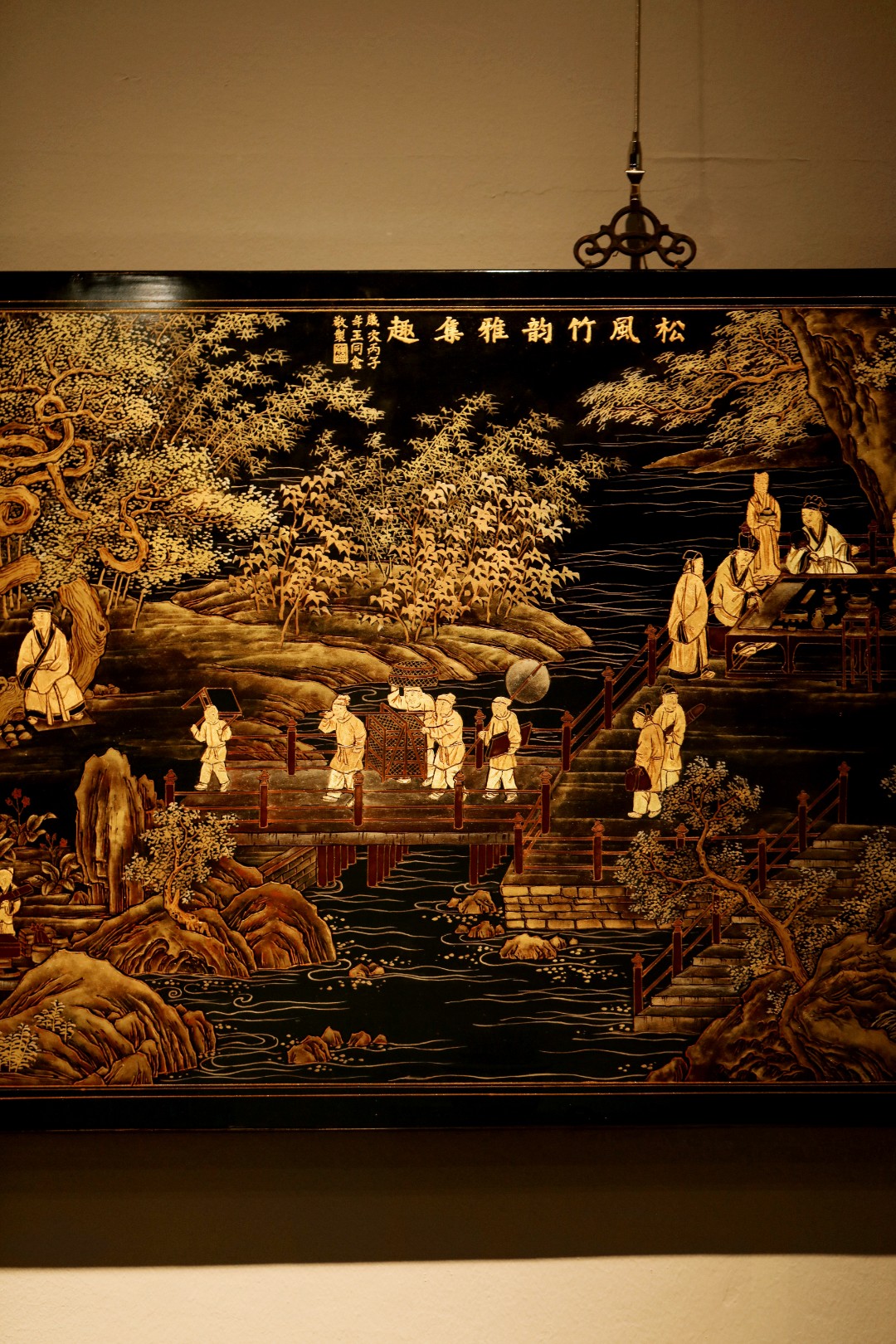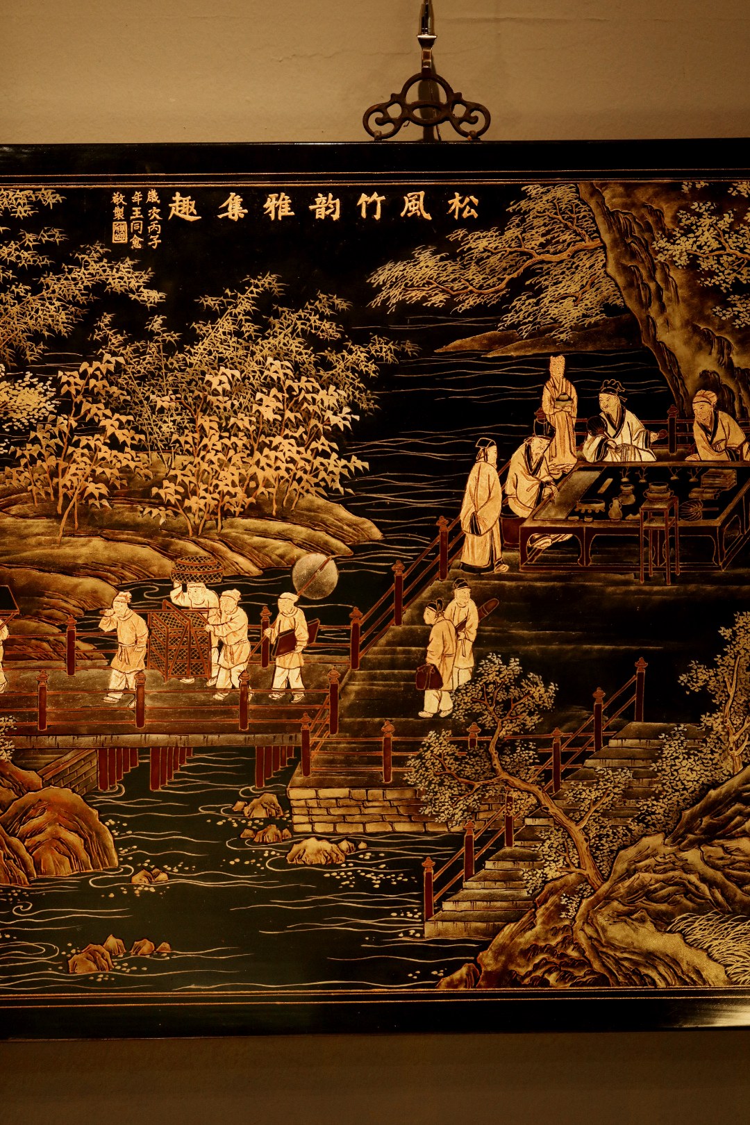 清时期老楠木板新工,古韵新作。板面裱布工艺,髹大漆于面;纯手工描绘金箔漆,题松风竹韵雅集绘制,历久弥新。悬于厅堂书房,可添文史底蕴。