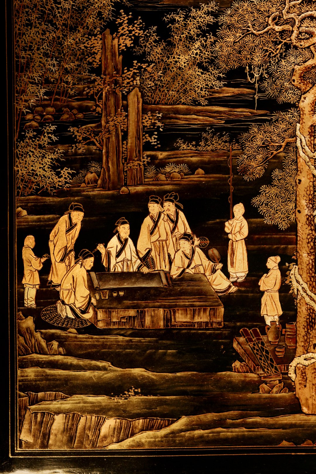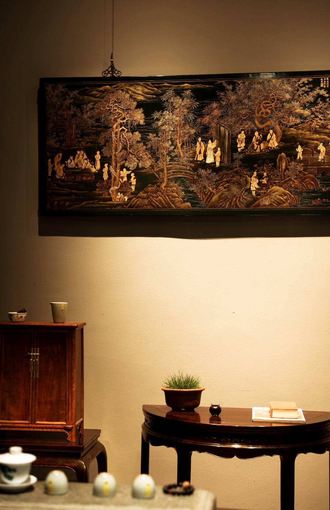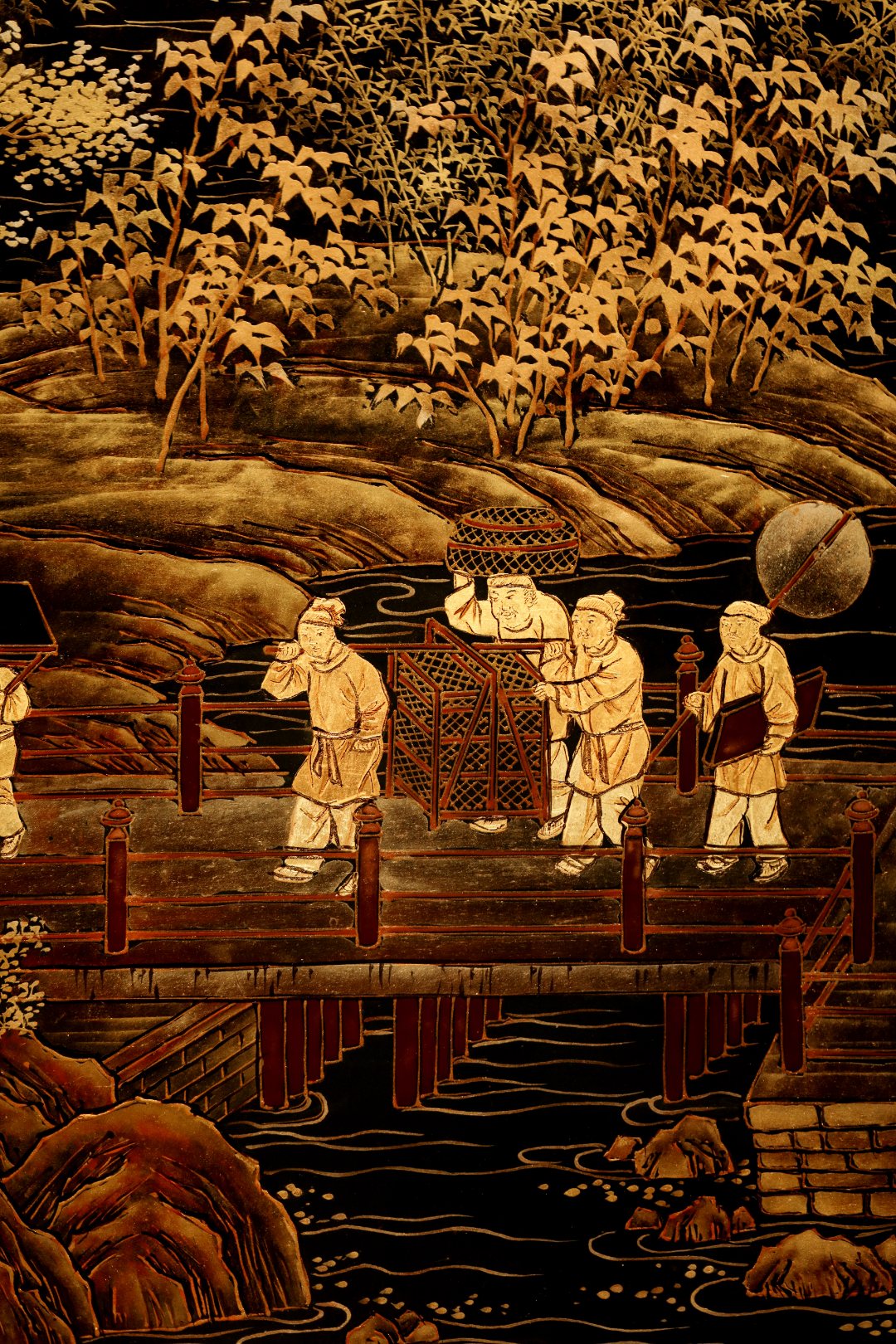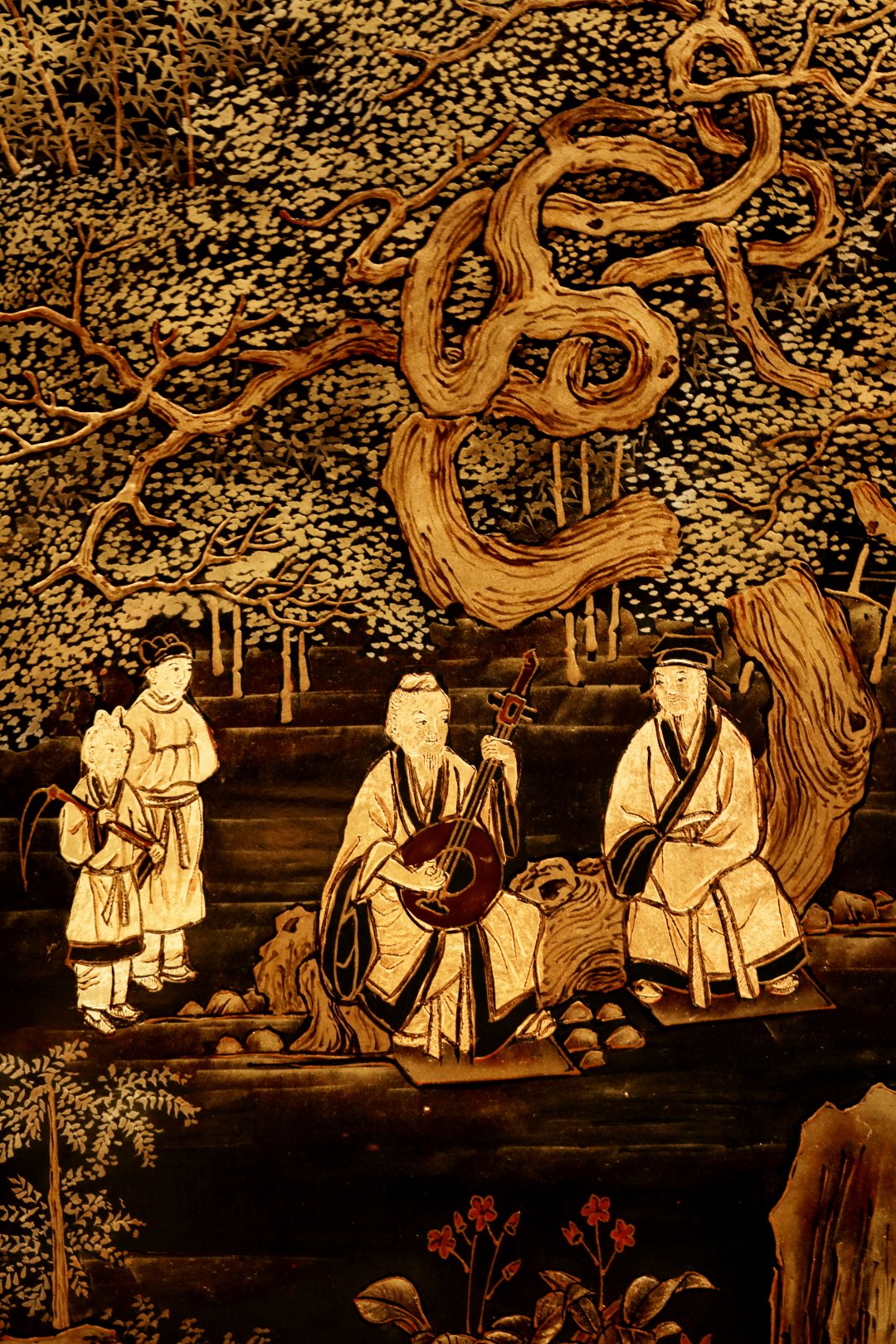 清时期老楠木板新工,古韵新作。板面裱布工艺,髹大漆于面;纯手工描绘金箔漆,题松风竹韵雅集绘制,历久弥新。悬于厅堂书房,可添文史底蕴。