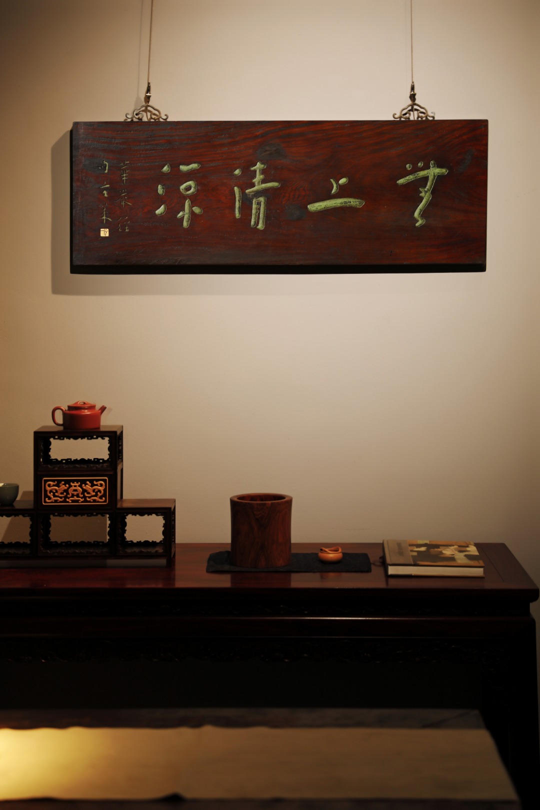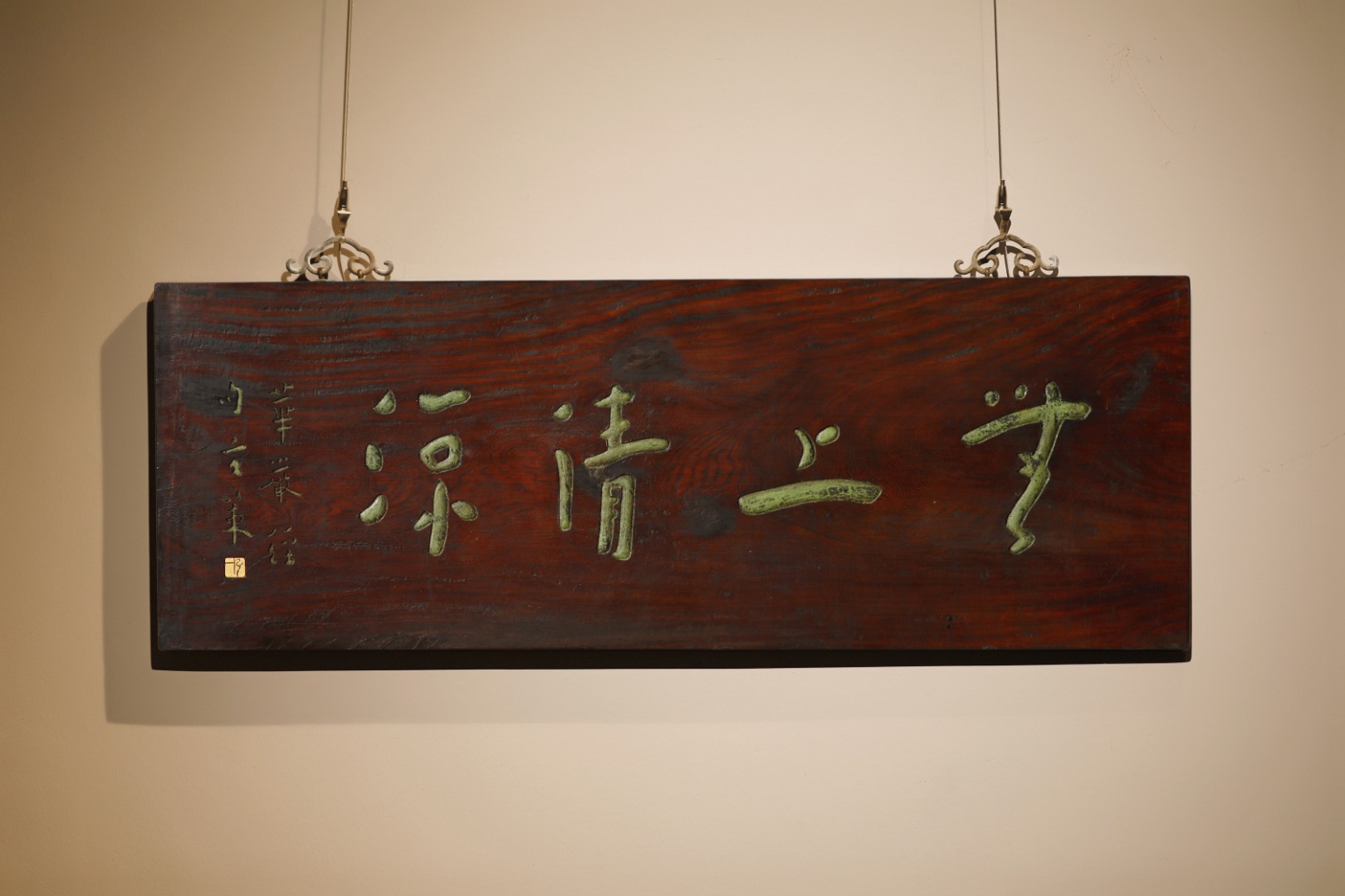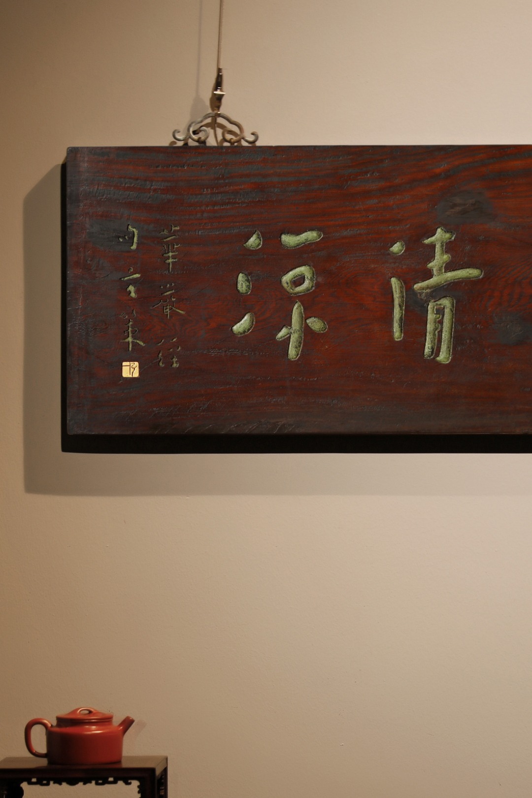 老楠木板新做,原皮壳漆,质地古朴,题字手工刻画,后又矿彩漆绘。悬于厅堂文房,精致有韵。
