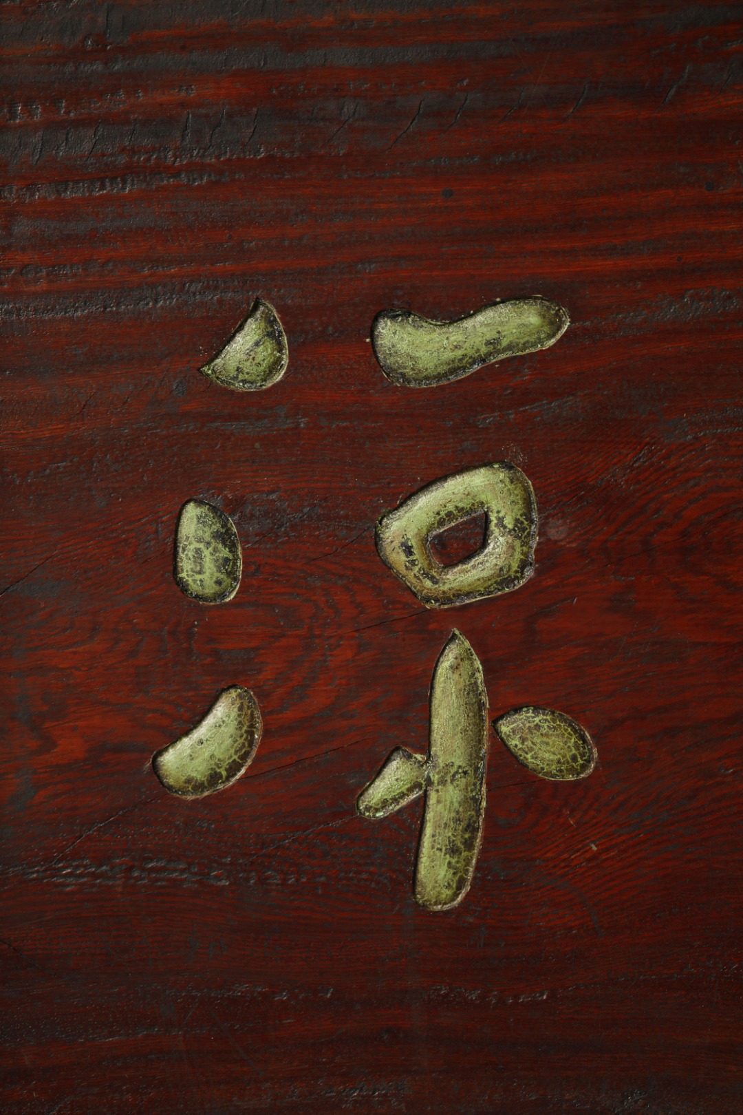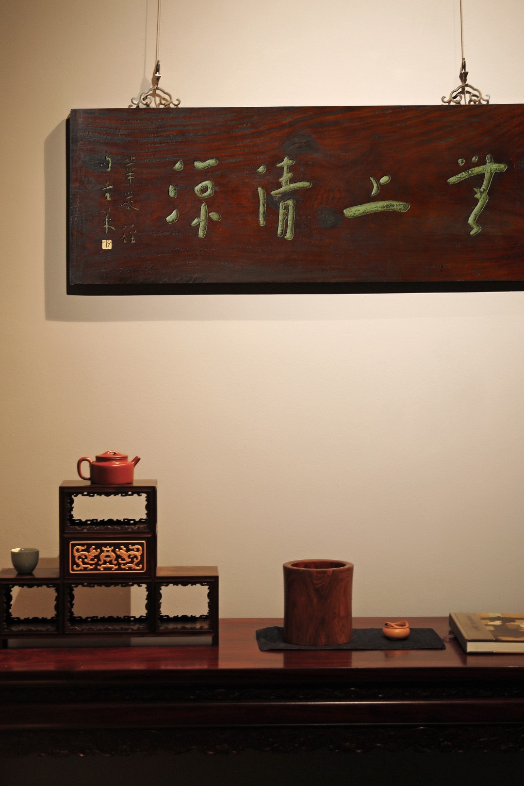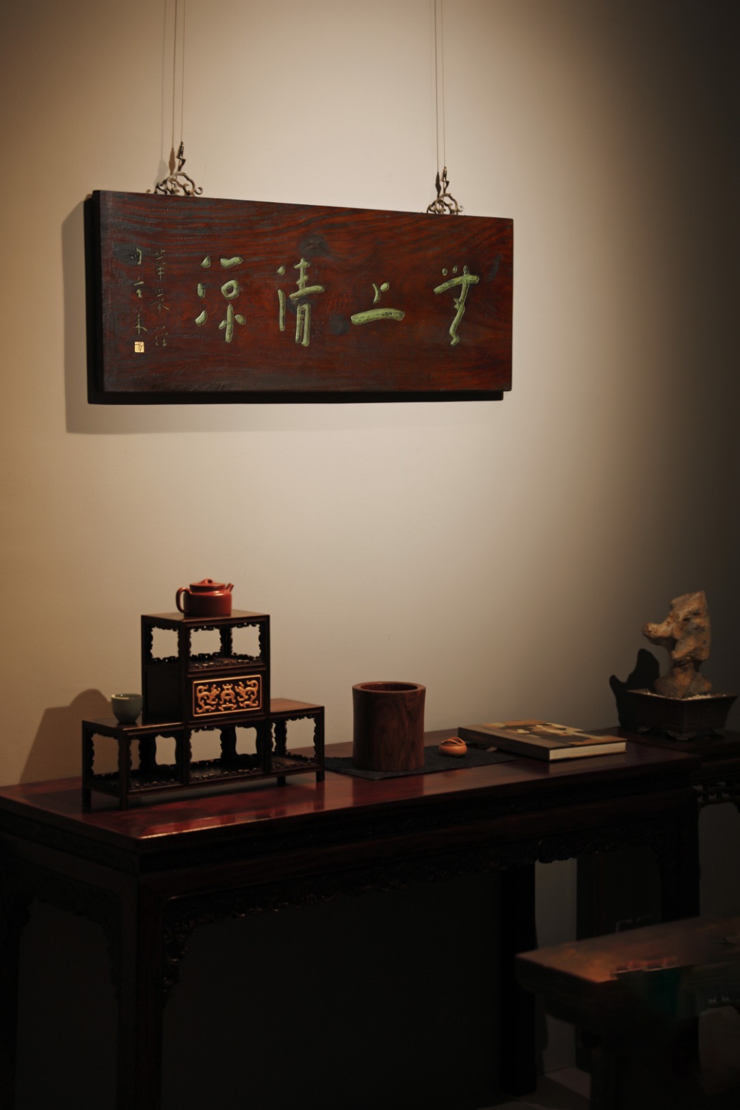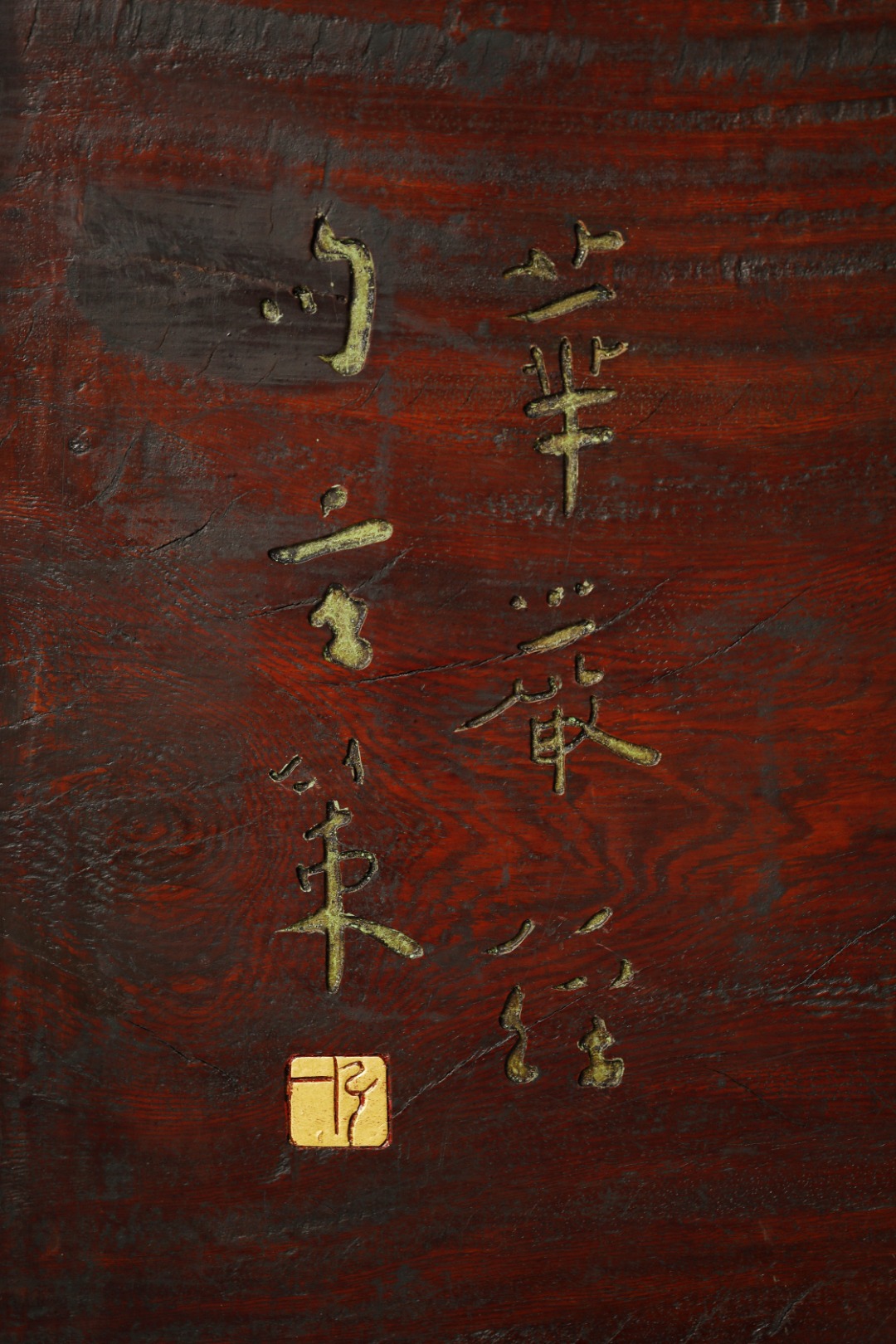 老楠木板新做,原皮壳漆,质地古朴,题字手工刻画,后又矿彩漆绘。悬于厅堂文房,精致有韵。