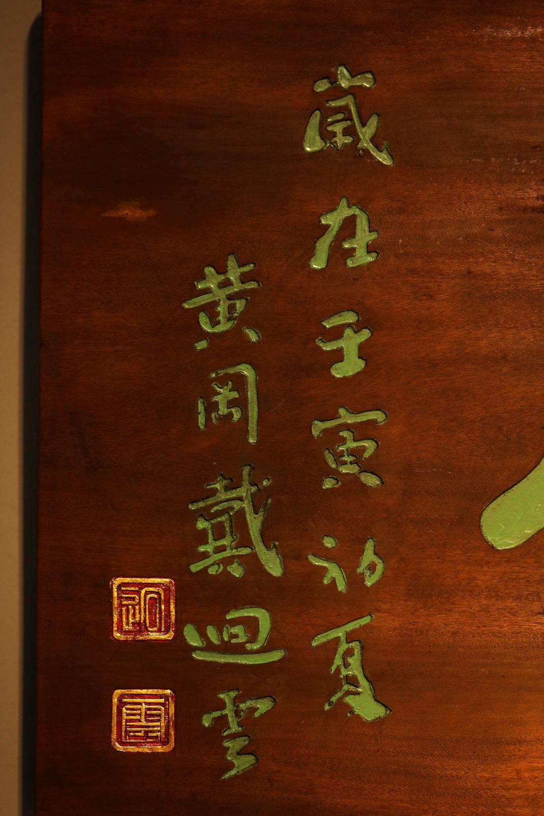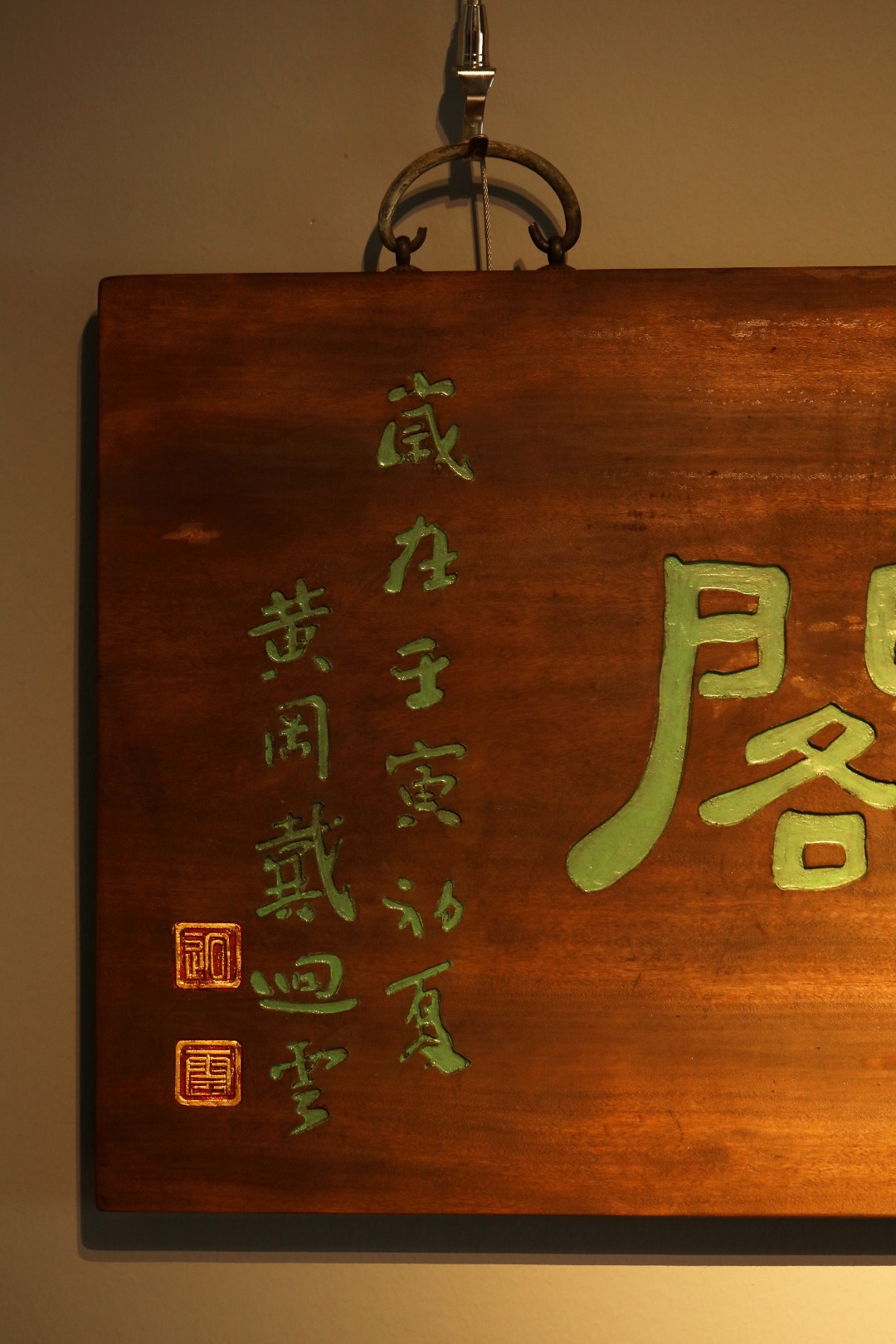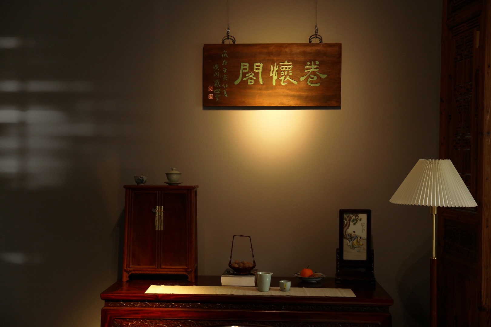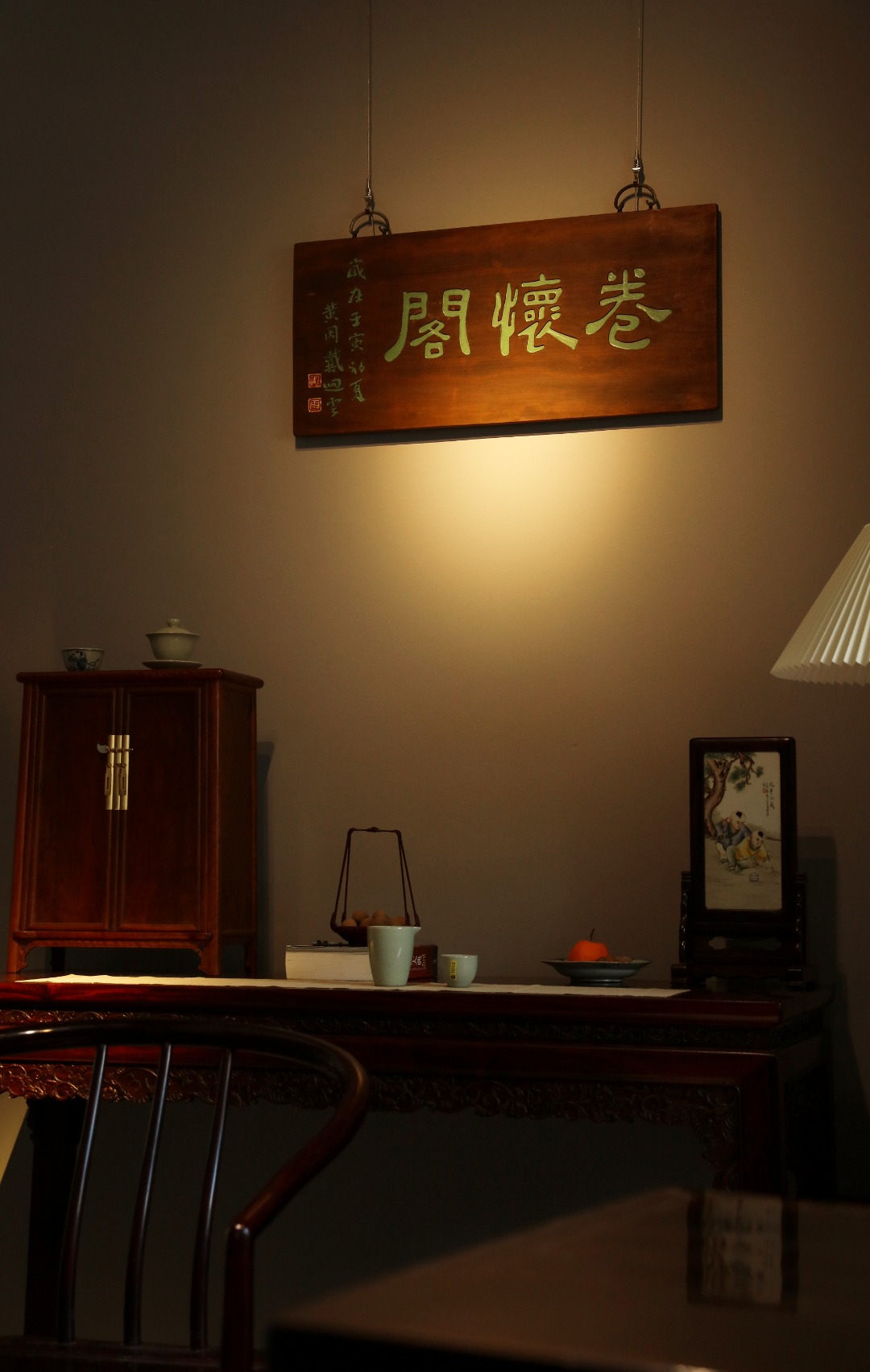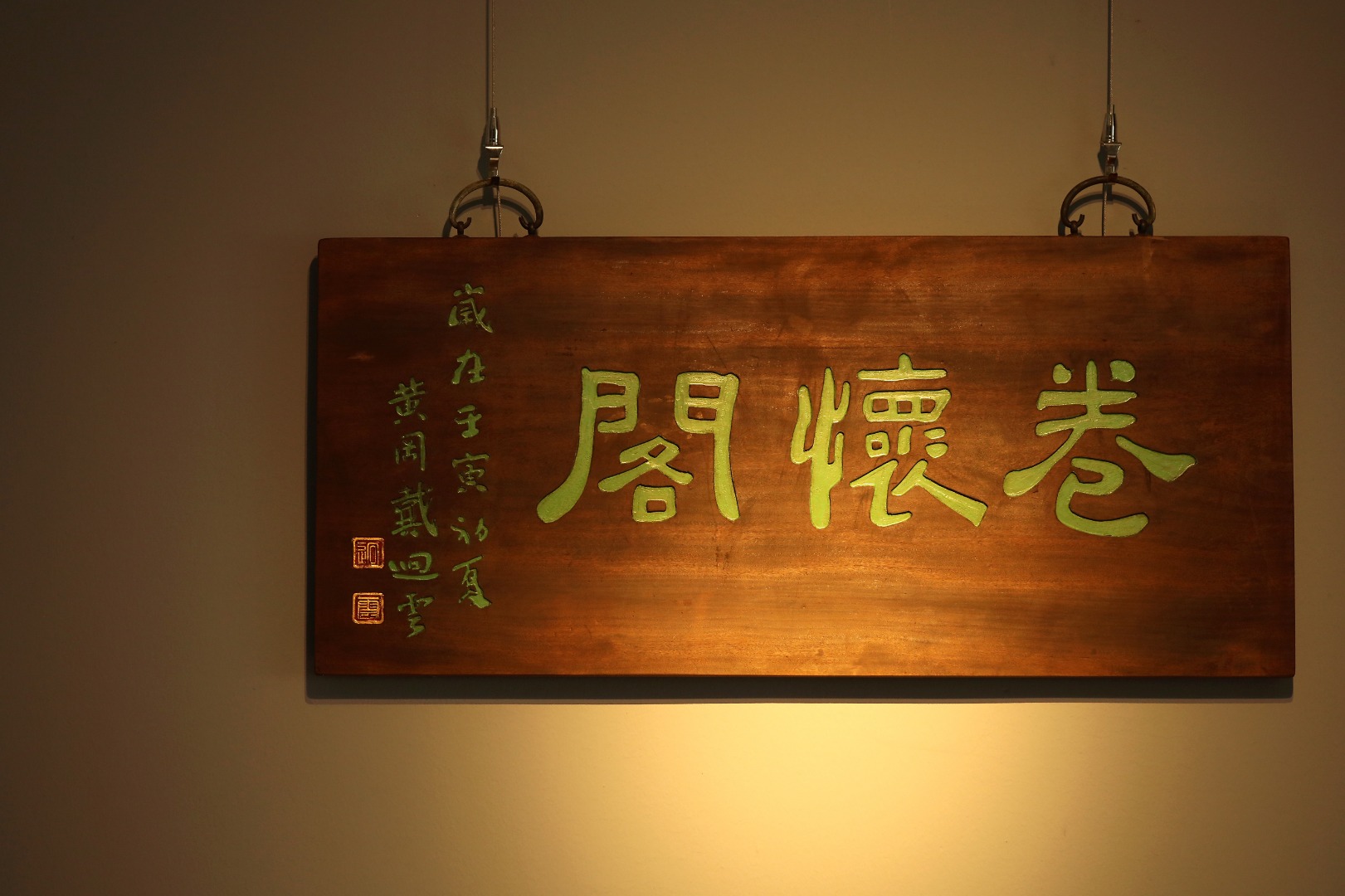 老楠木板新做,原皮壳漆,质地古朴,题字“卷怀阁”手工刻画,后又矿彩漆绘。悬于厅堂文房,精致有韵。