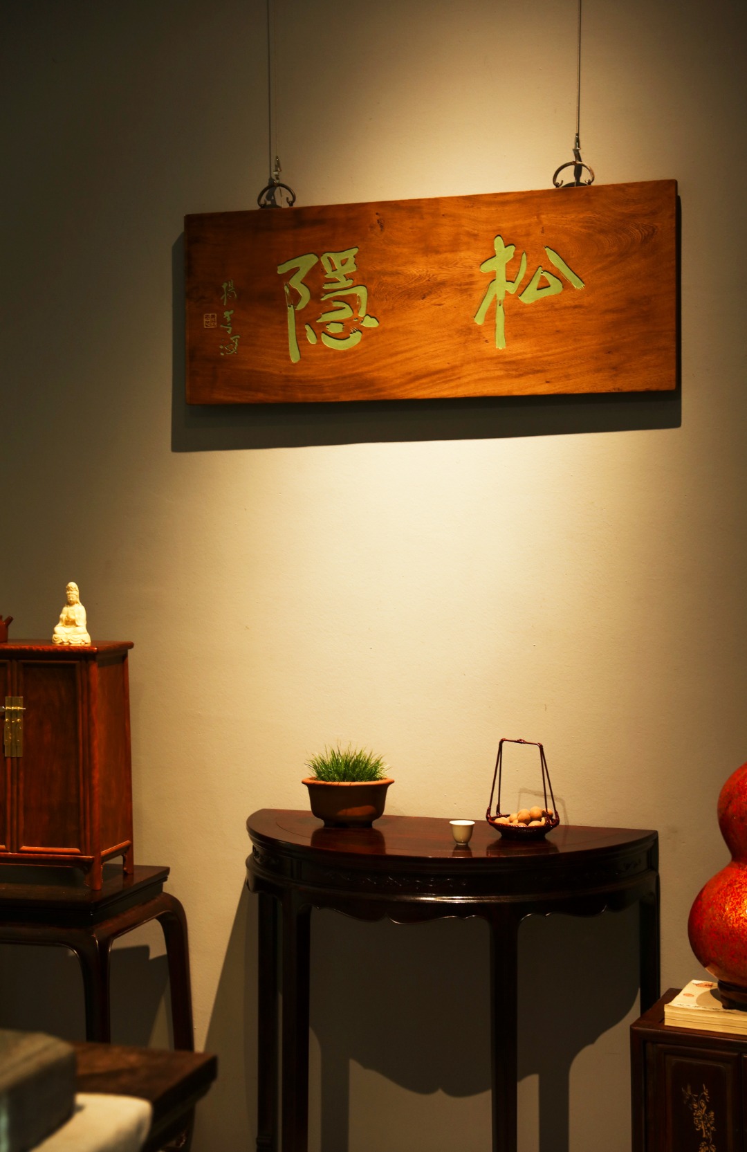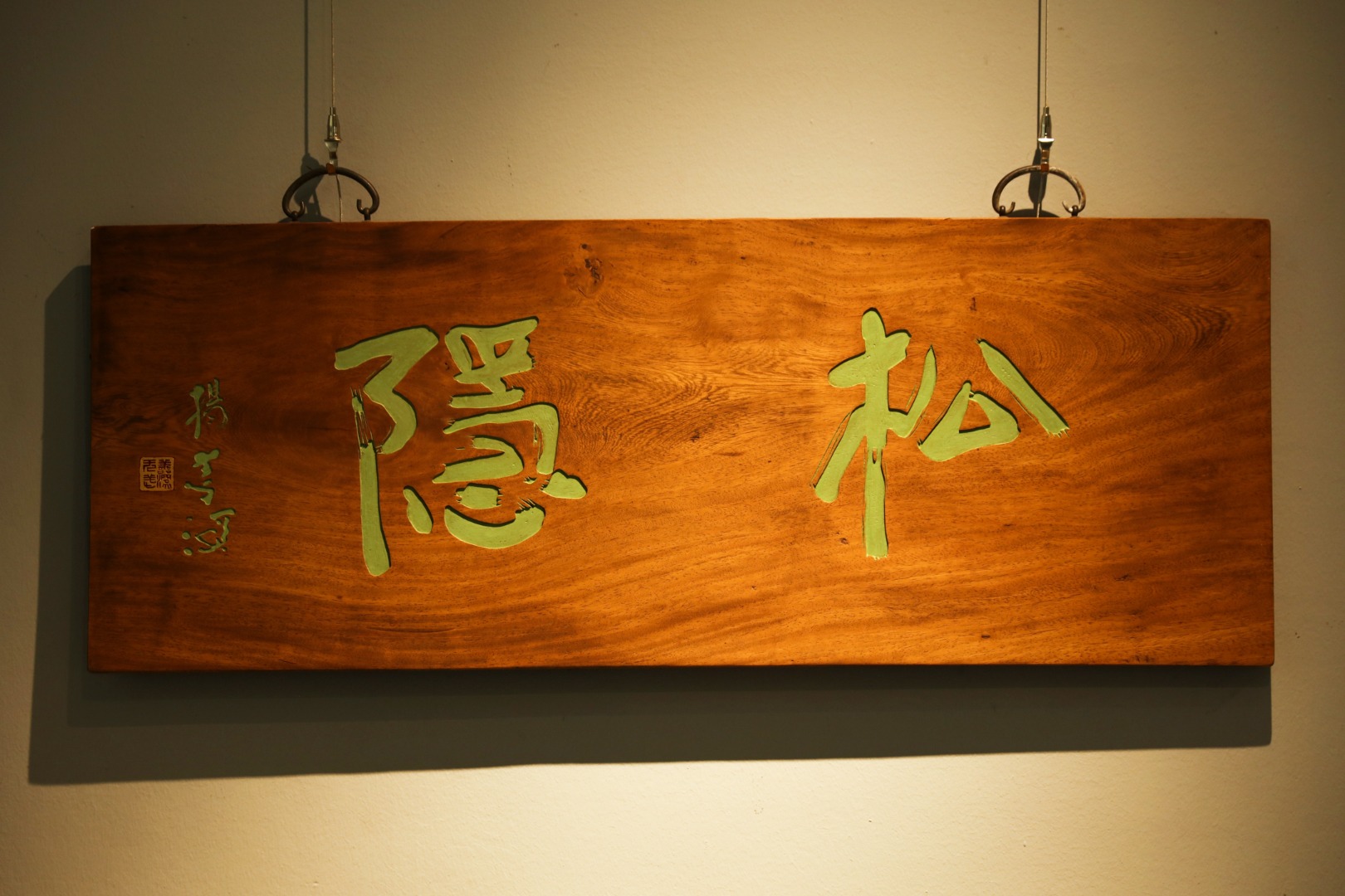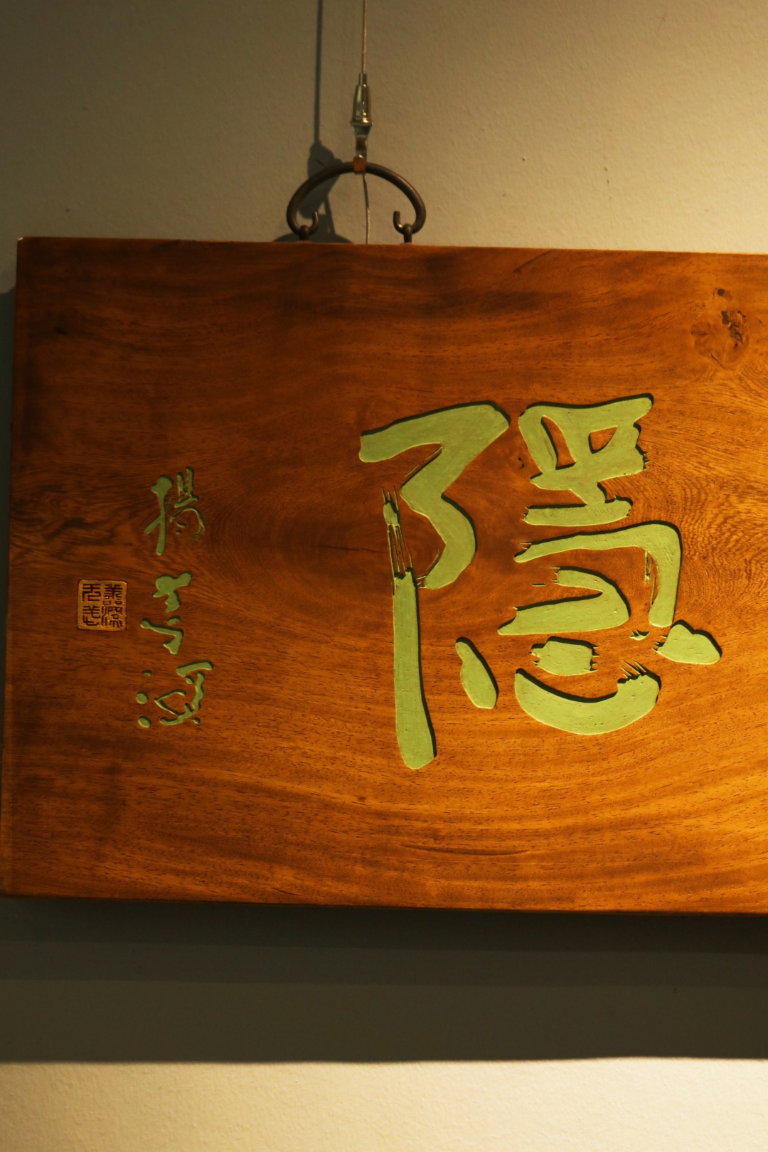 取旧时老板料,手刻对联,大漆描绘,原皮壳沉着古朴,悬于空间,深得意象真趣,人生理趣,为文房雅室佳选。