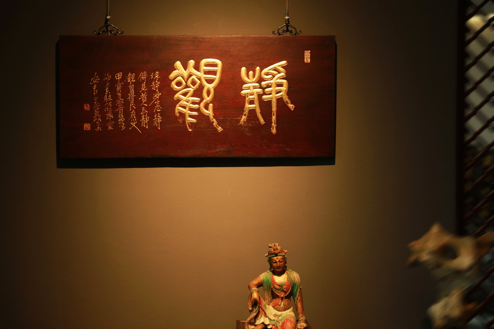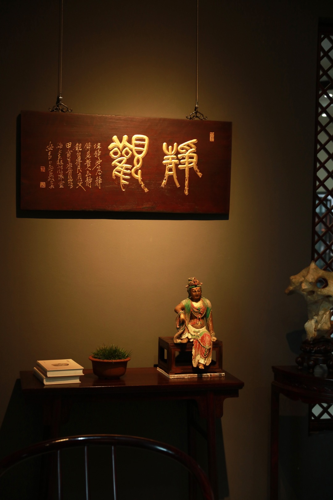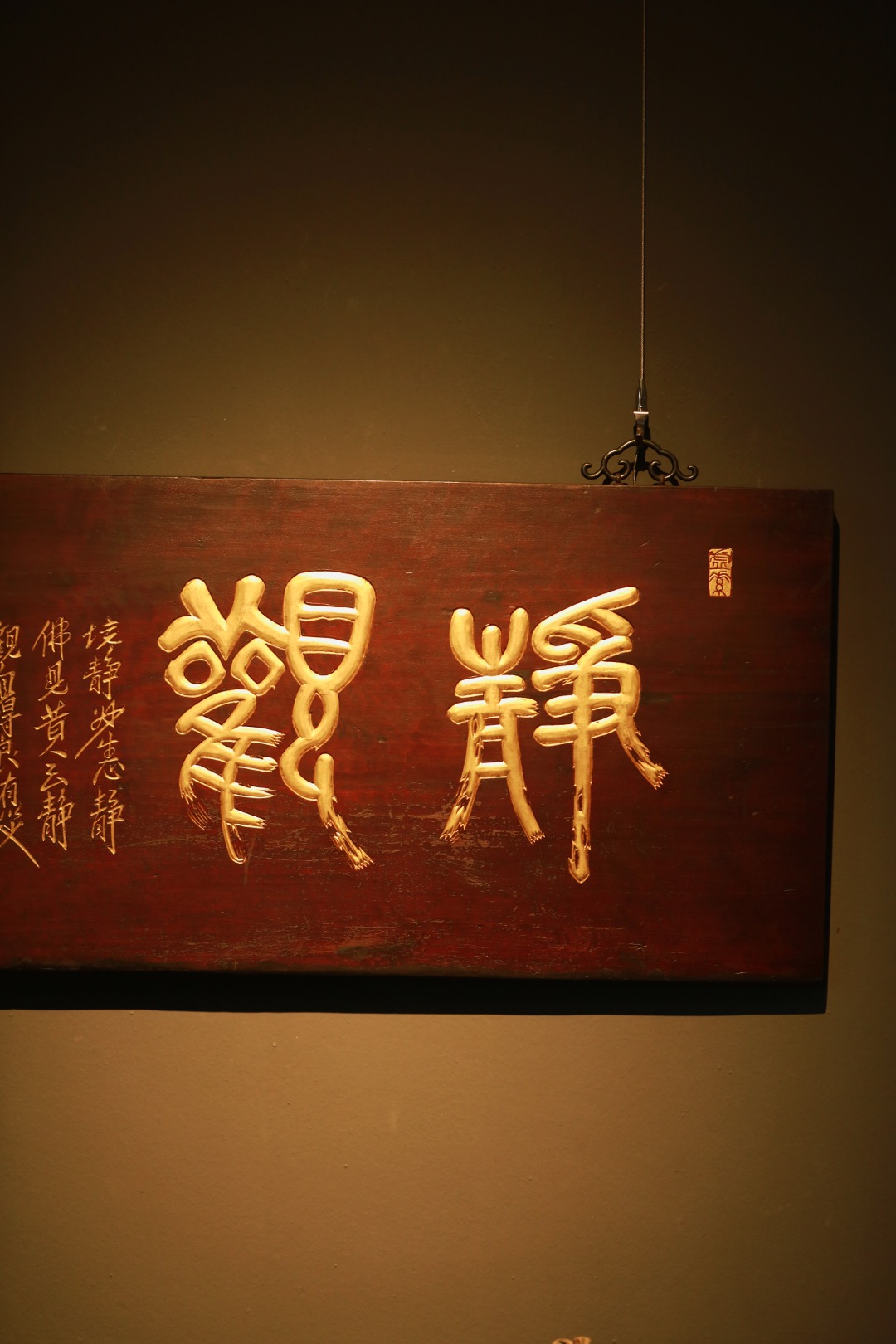 老楠木新作,形制古雅;题字:“静观”纯手工阴阳刻,后贴金箔,悬于文房雅室,可添文史底蕴。