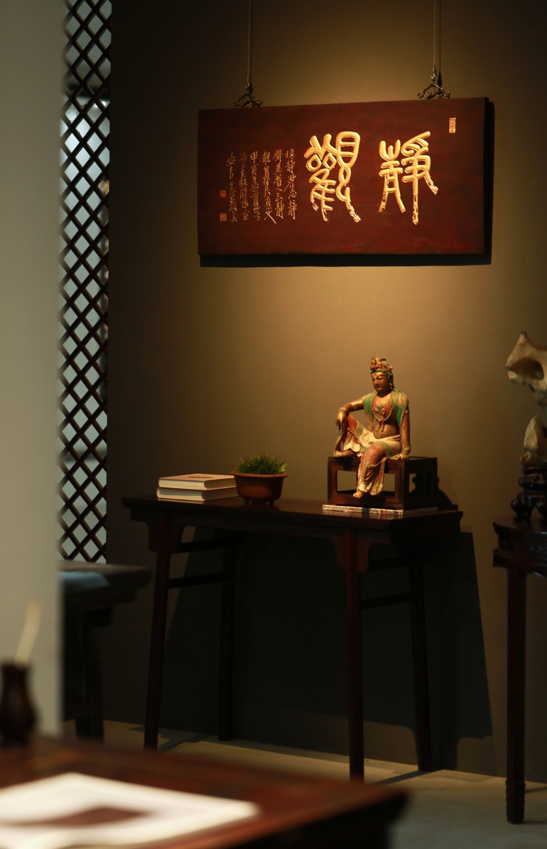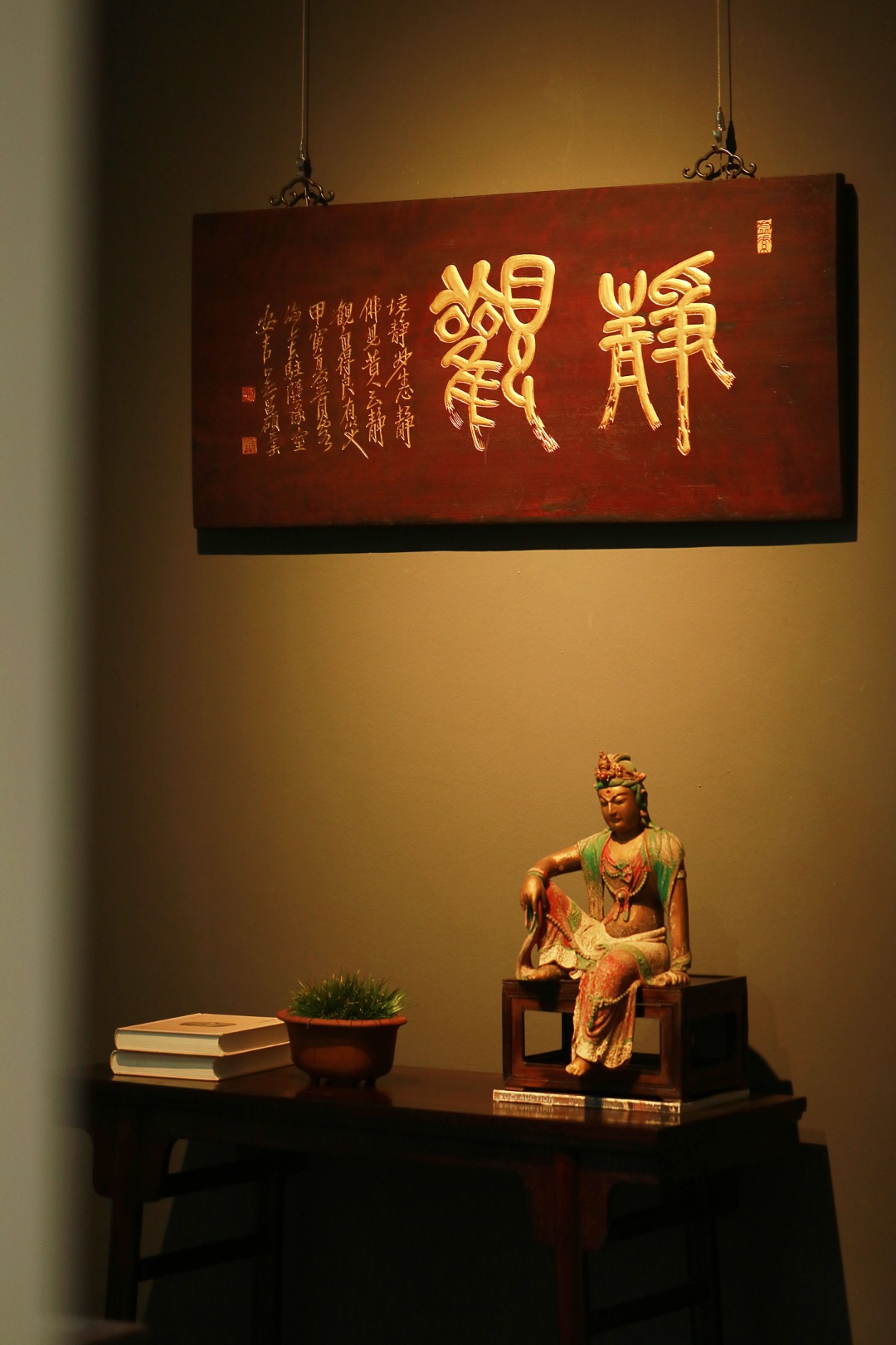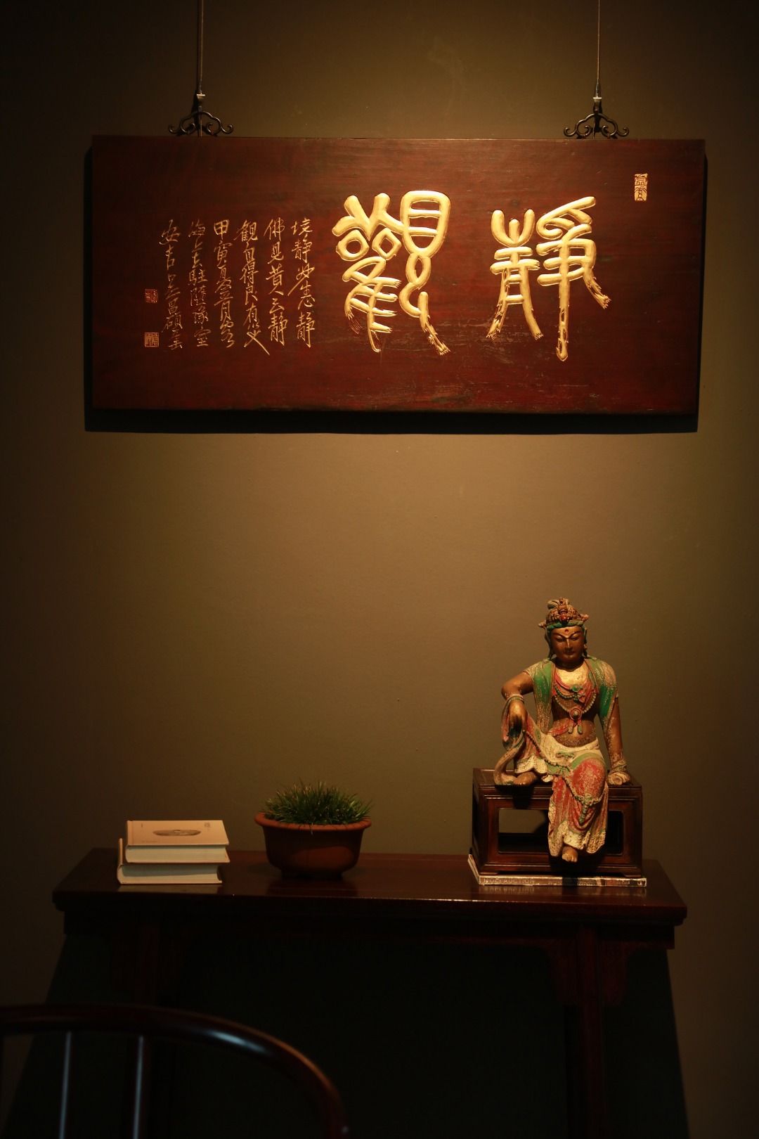老楠木新作,形制古雅;题字:“静观”纯手工阴阳刻,后贴金箔,悬于文房雅室,可添文史底蕴。