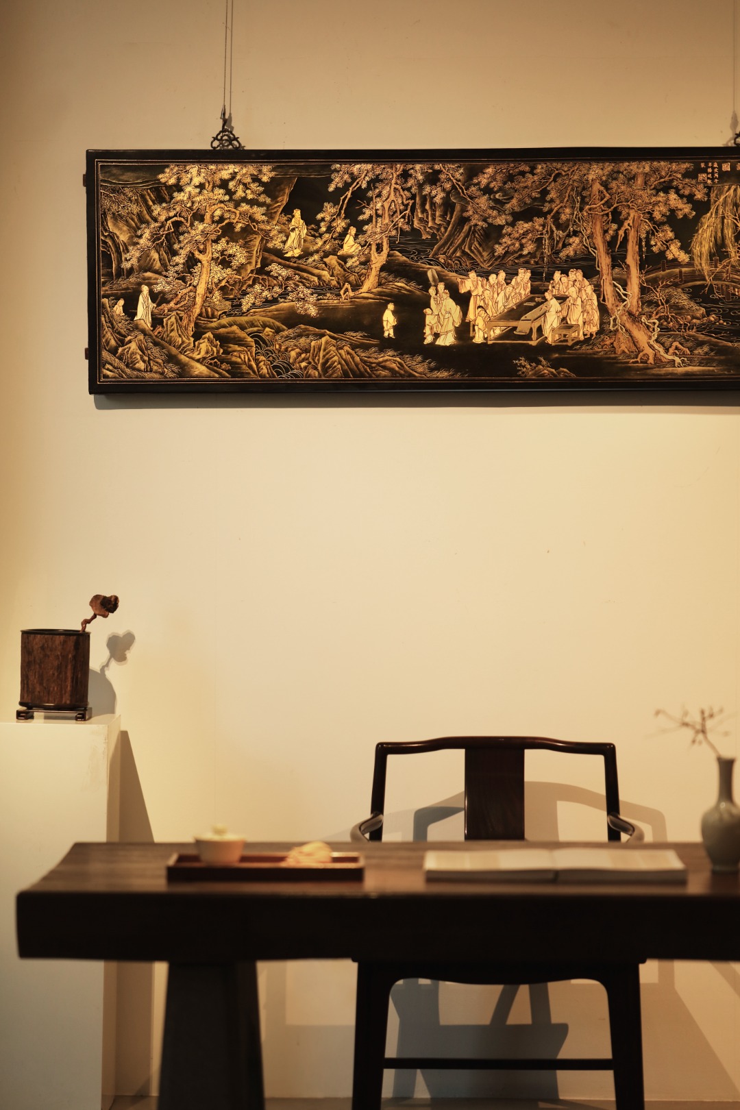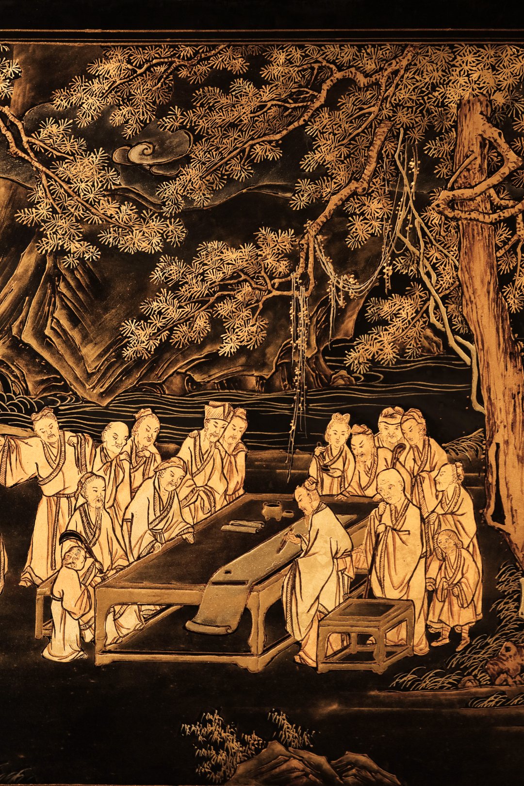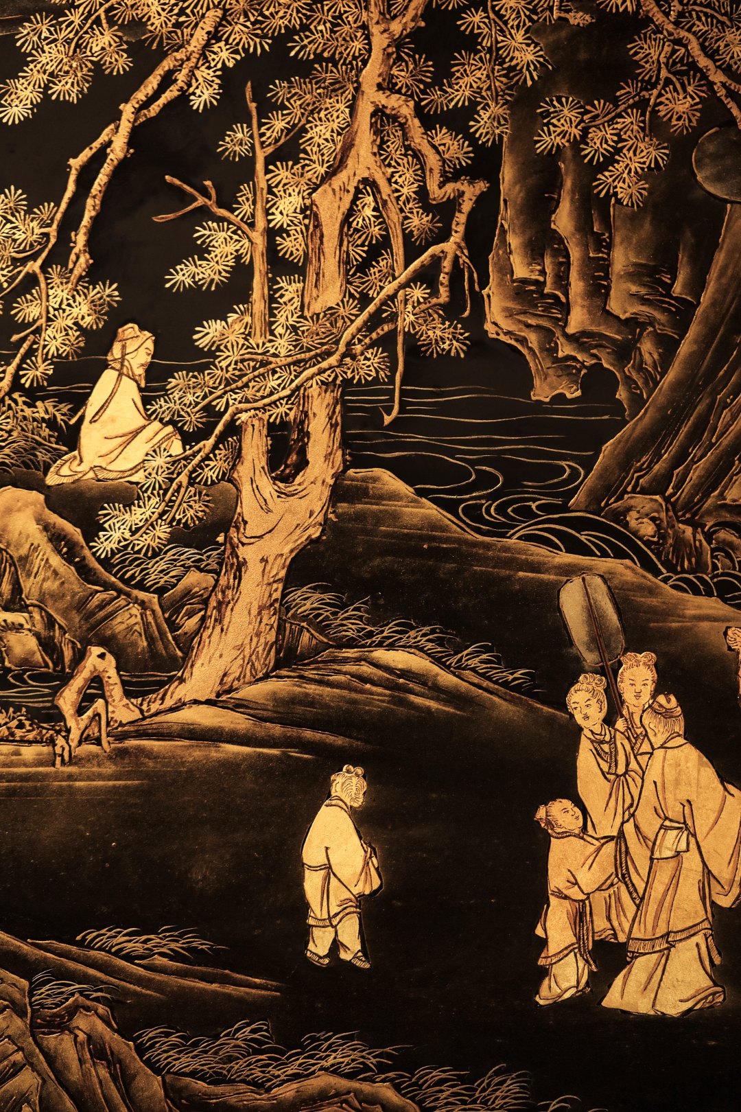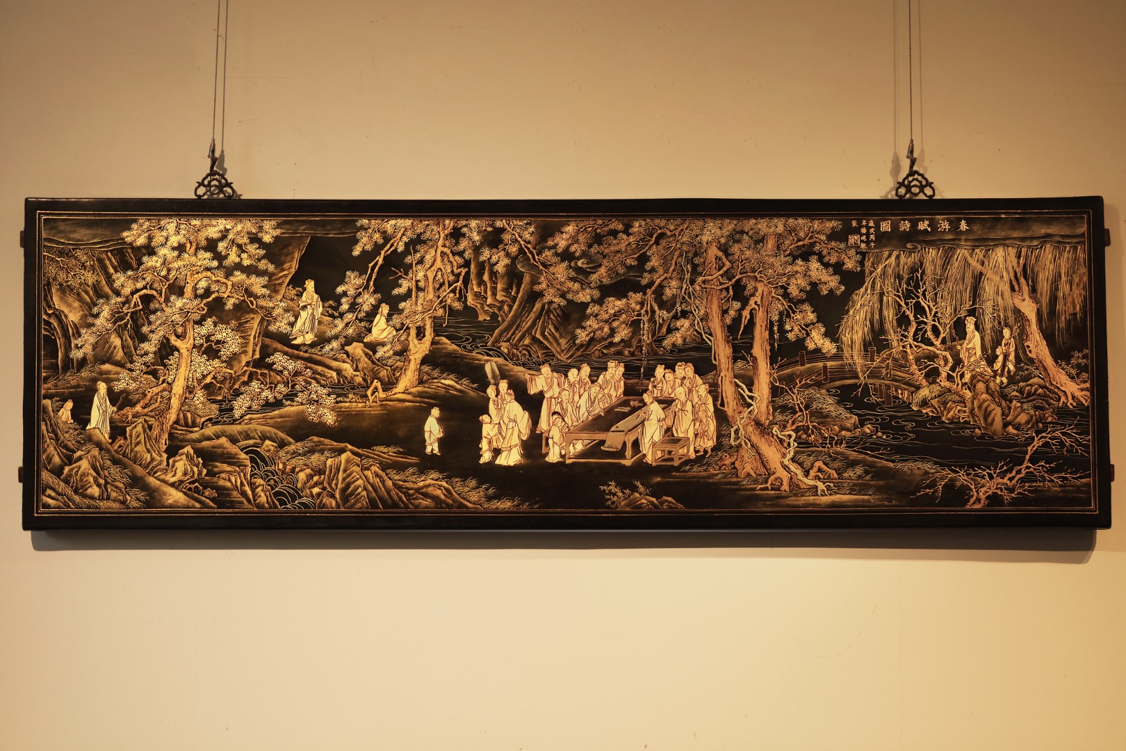 老楠木x漆画【春游赋诗图】描金挂屏