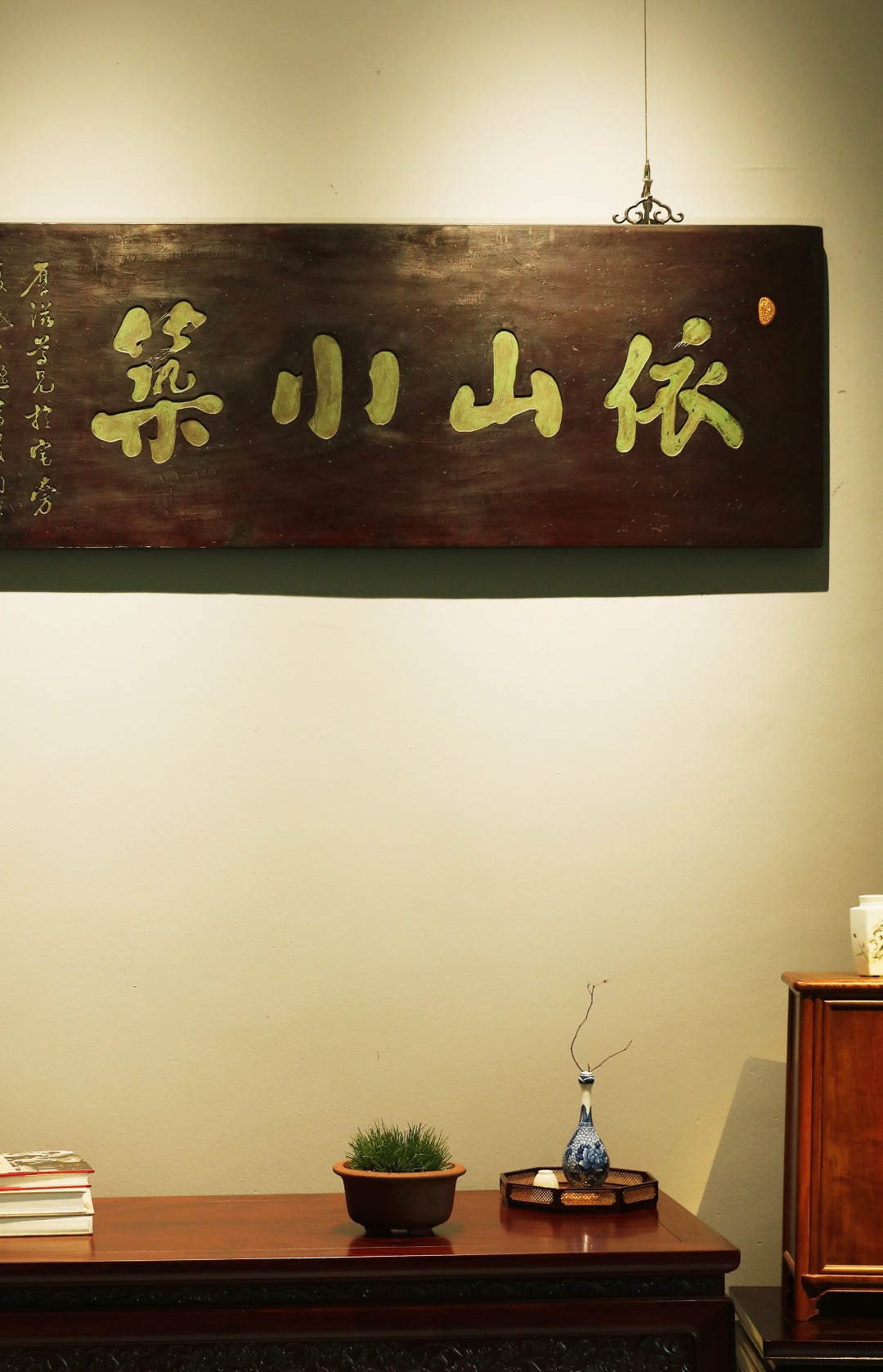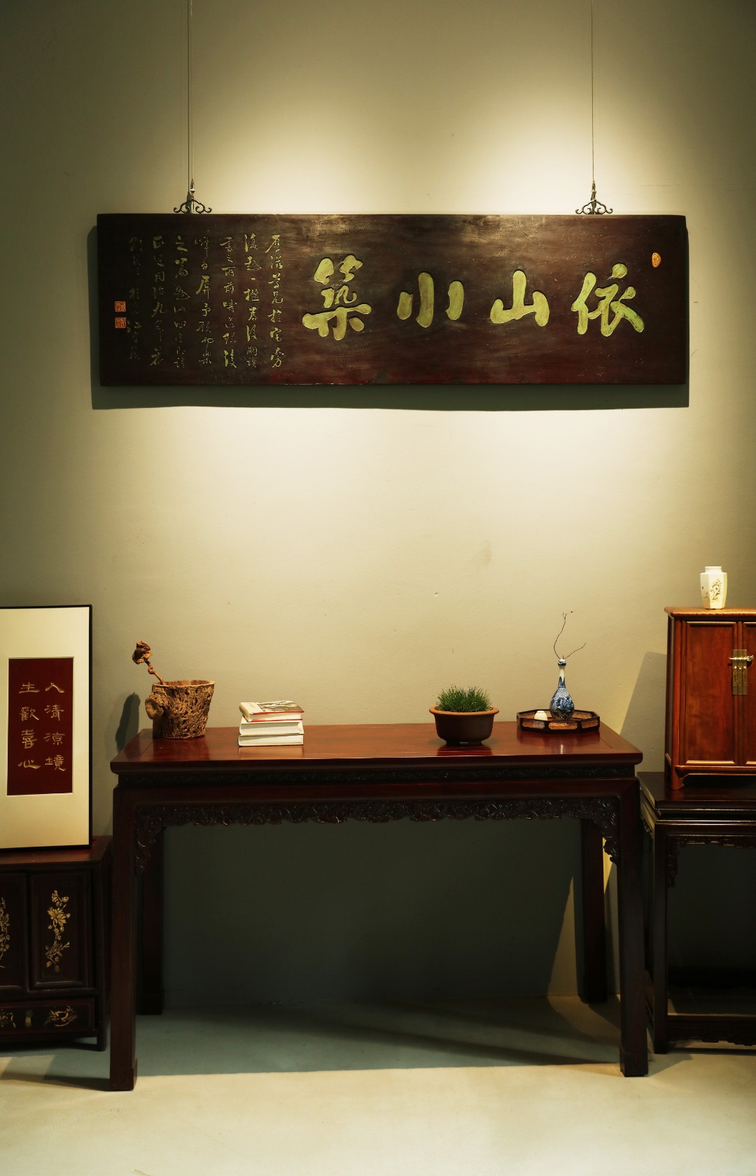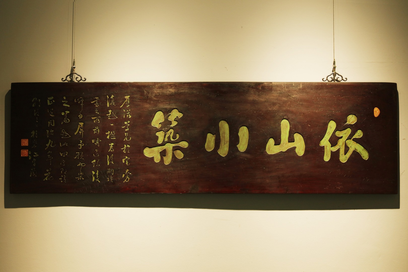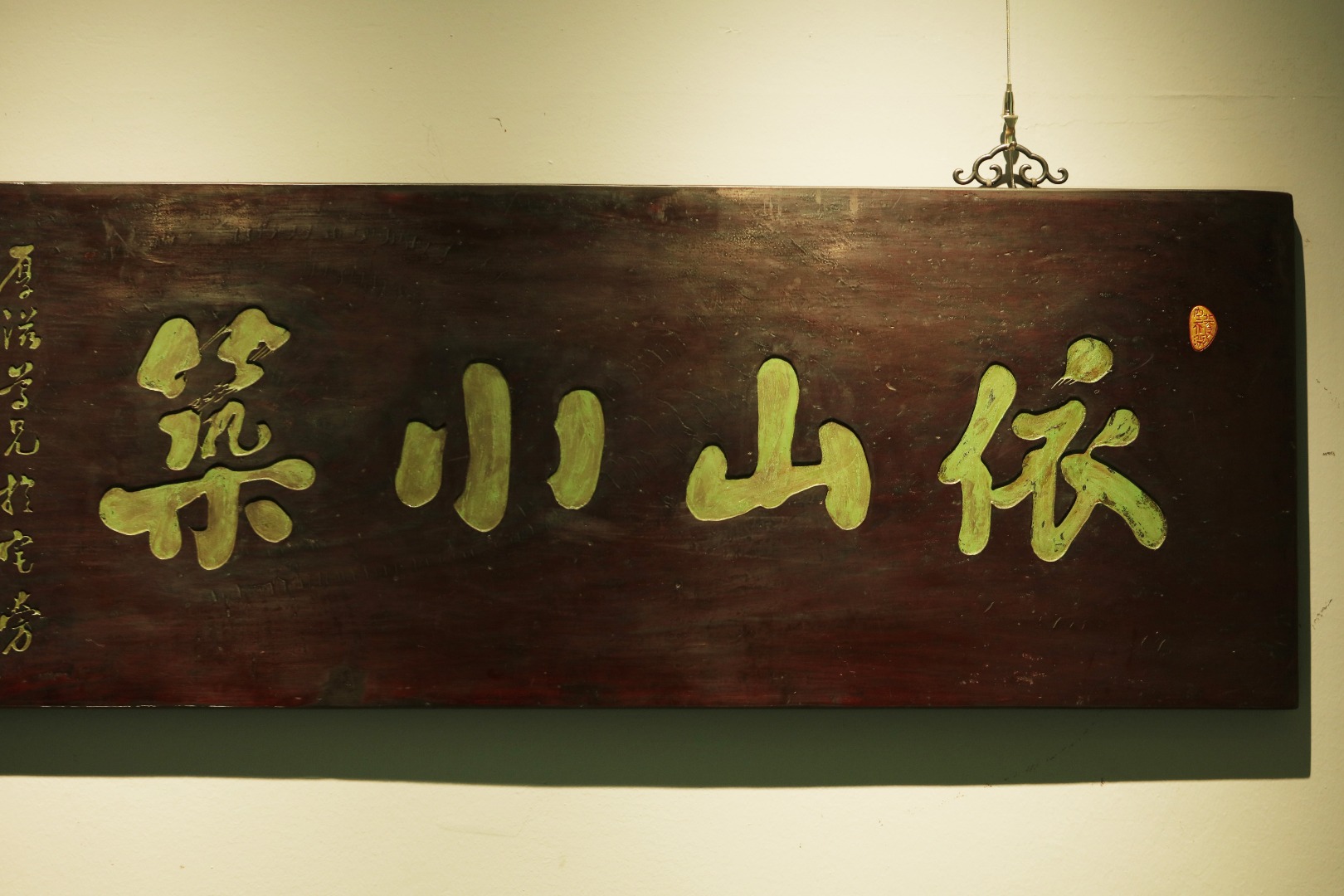 老楠木板新工,原皮壳漆,质地古朴,手工刻画,后又矿彩漆绘。悬于厅堂文房,精致有韵。