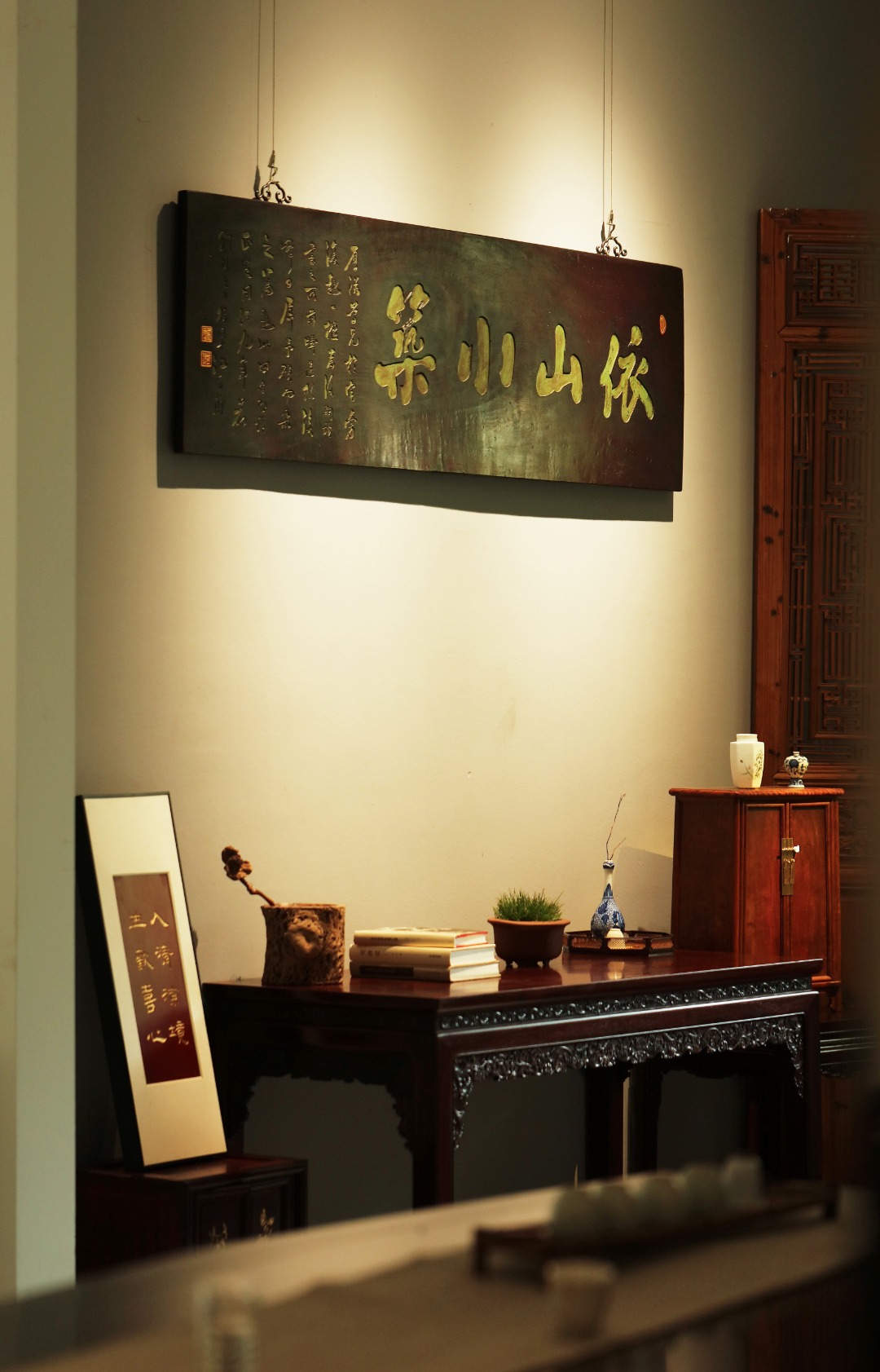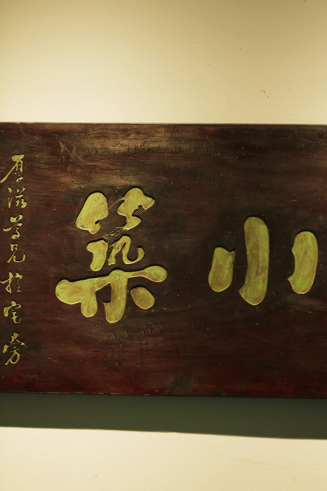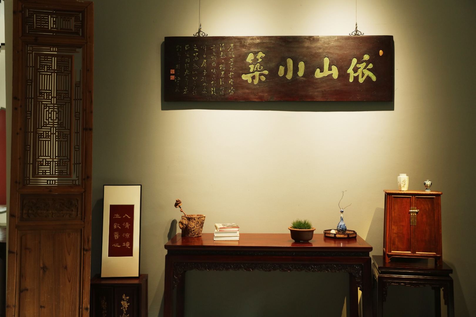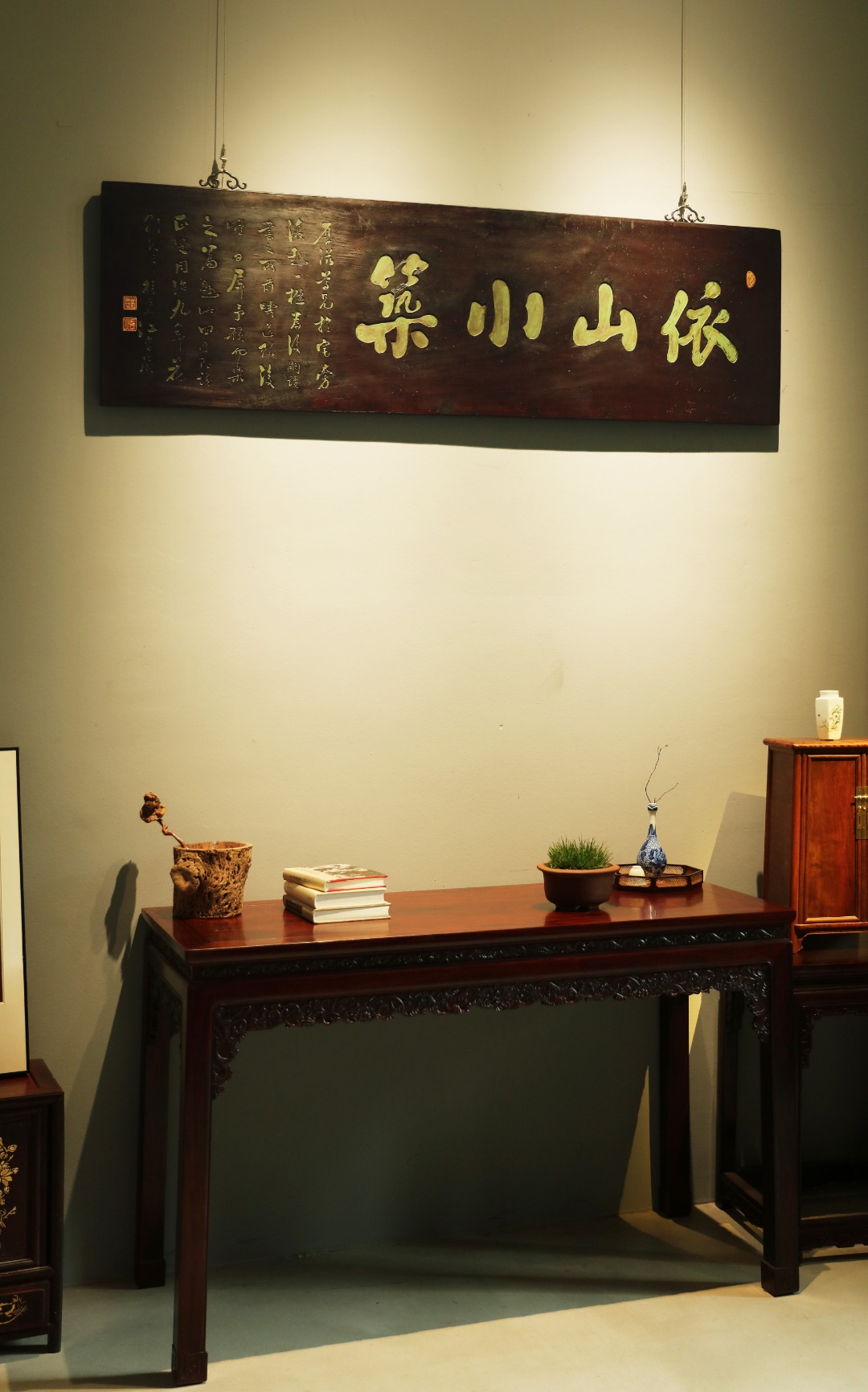 老楠木板新工,原皮壳漆,质地古朴,手工刻画,后又矿彩漆绘。悬于厅堂文房,精致有韵。