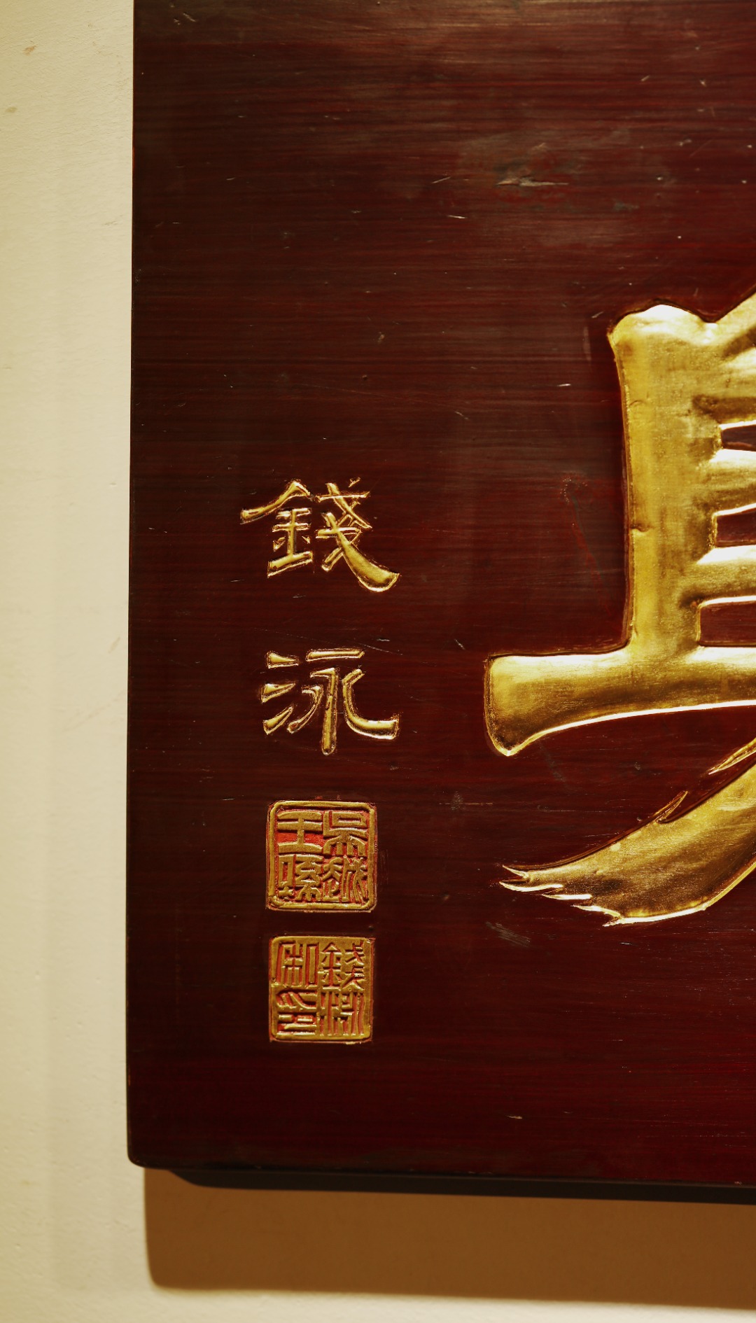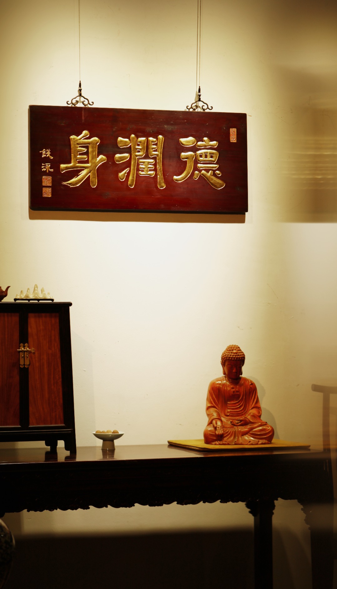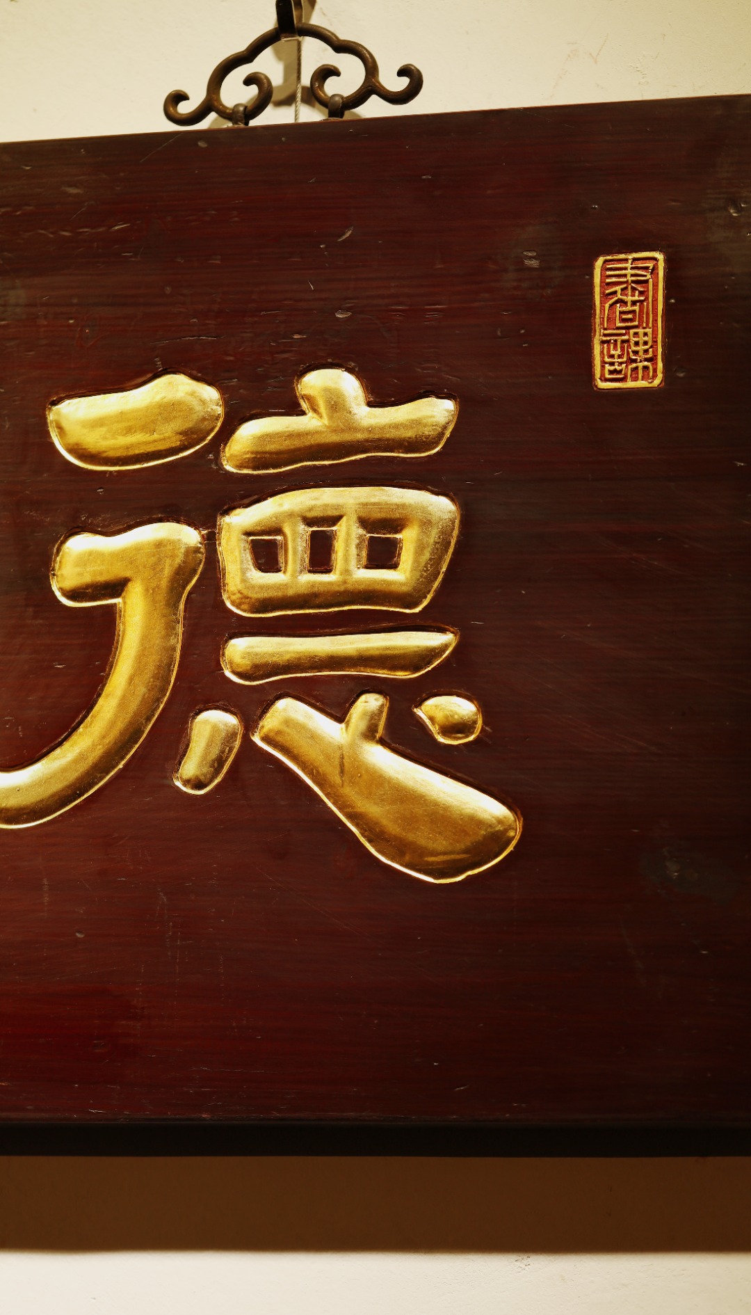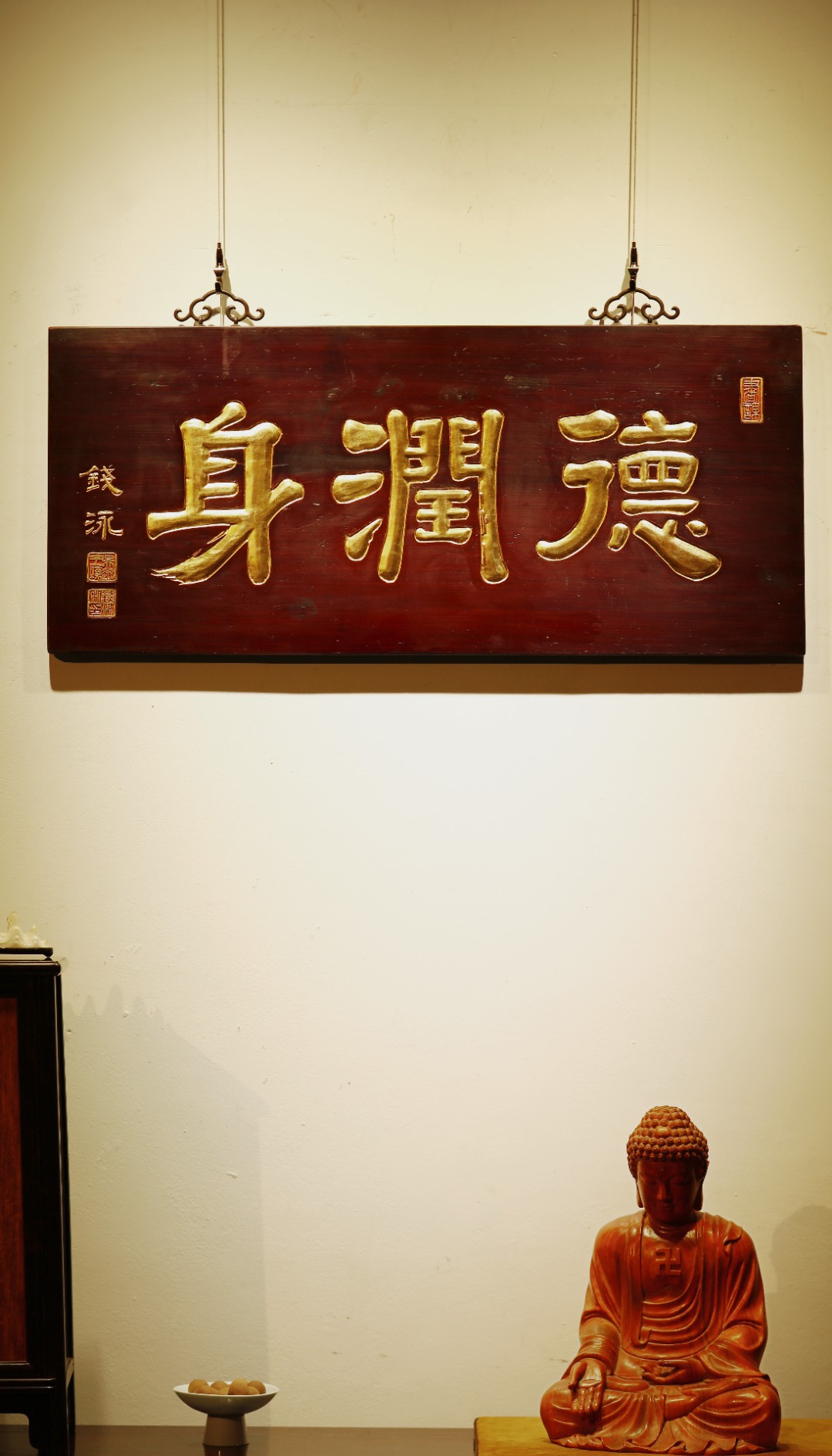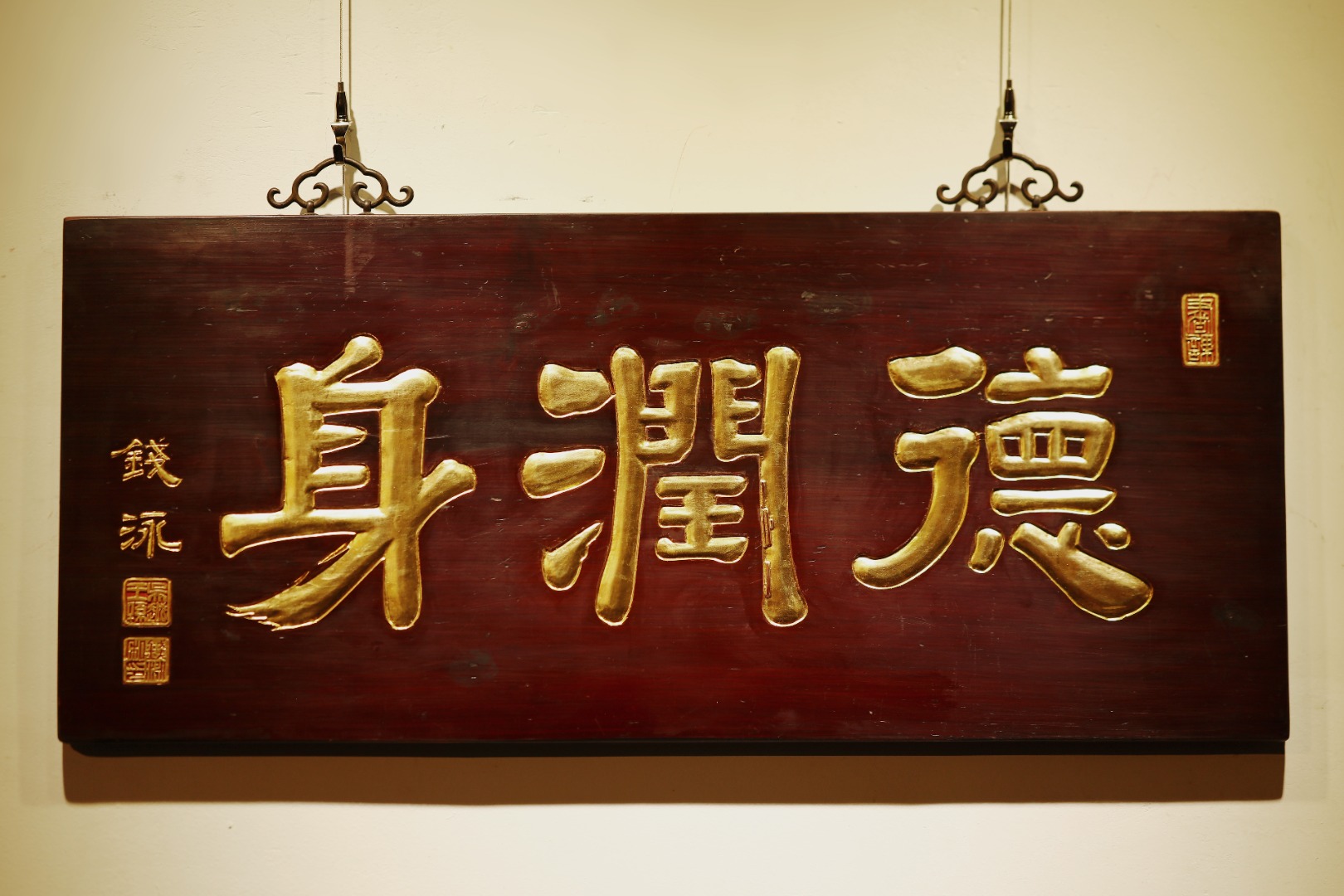 老楠木板新作,保留原皮壳漆,质地古朴,手工刻画,后又真金贴就,题识“德润身”。悬于厅堂、文房,空间装饰,可添雅蕴。