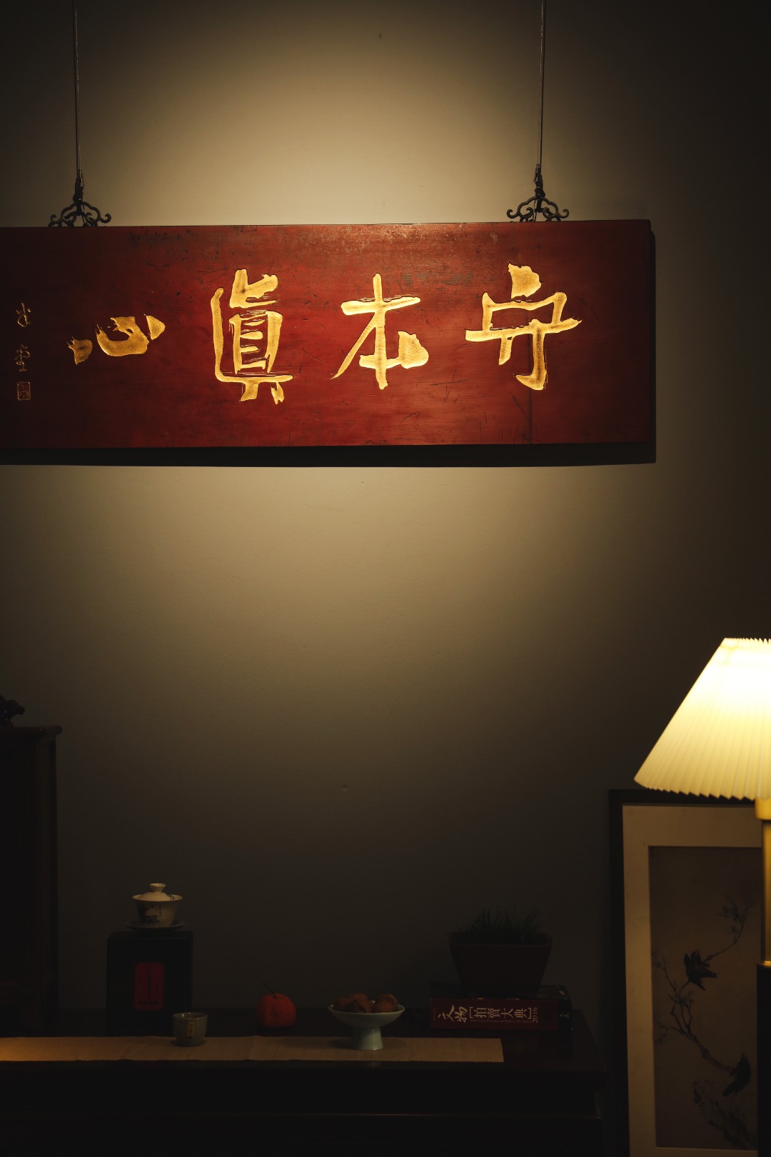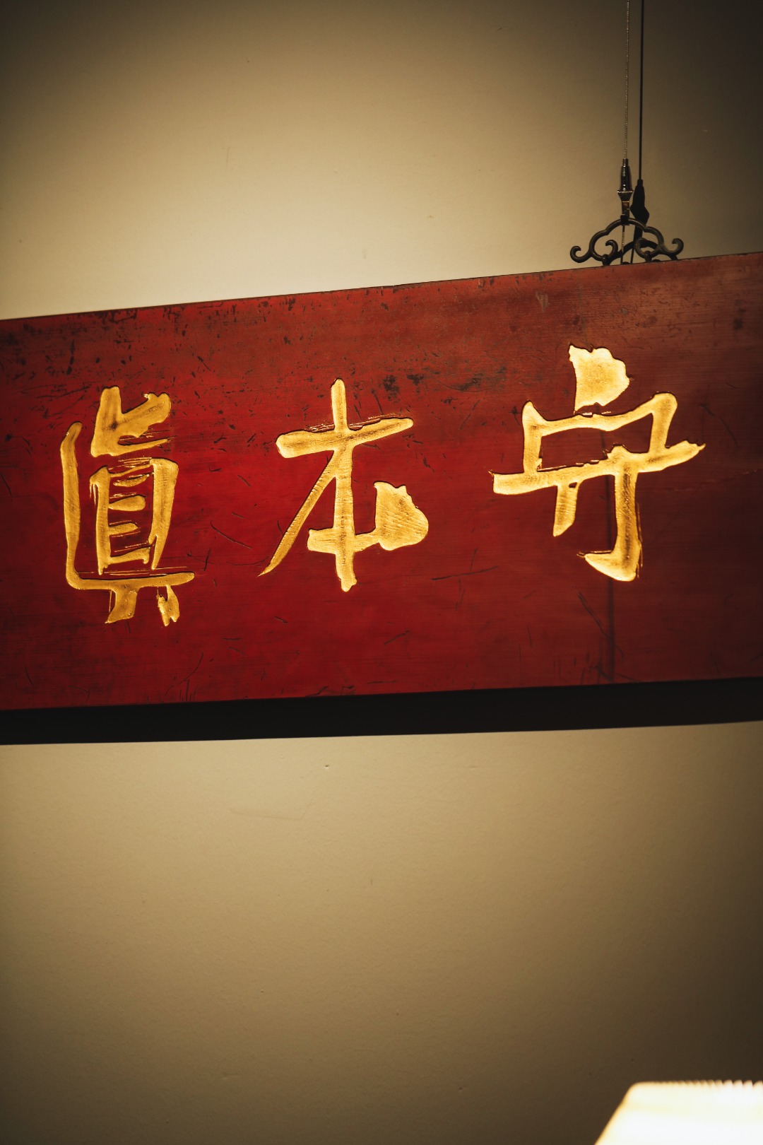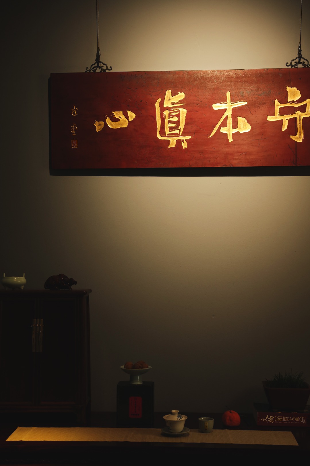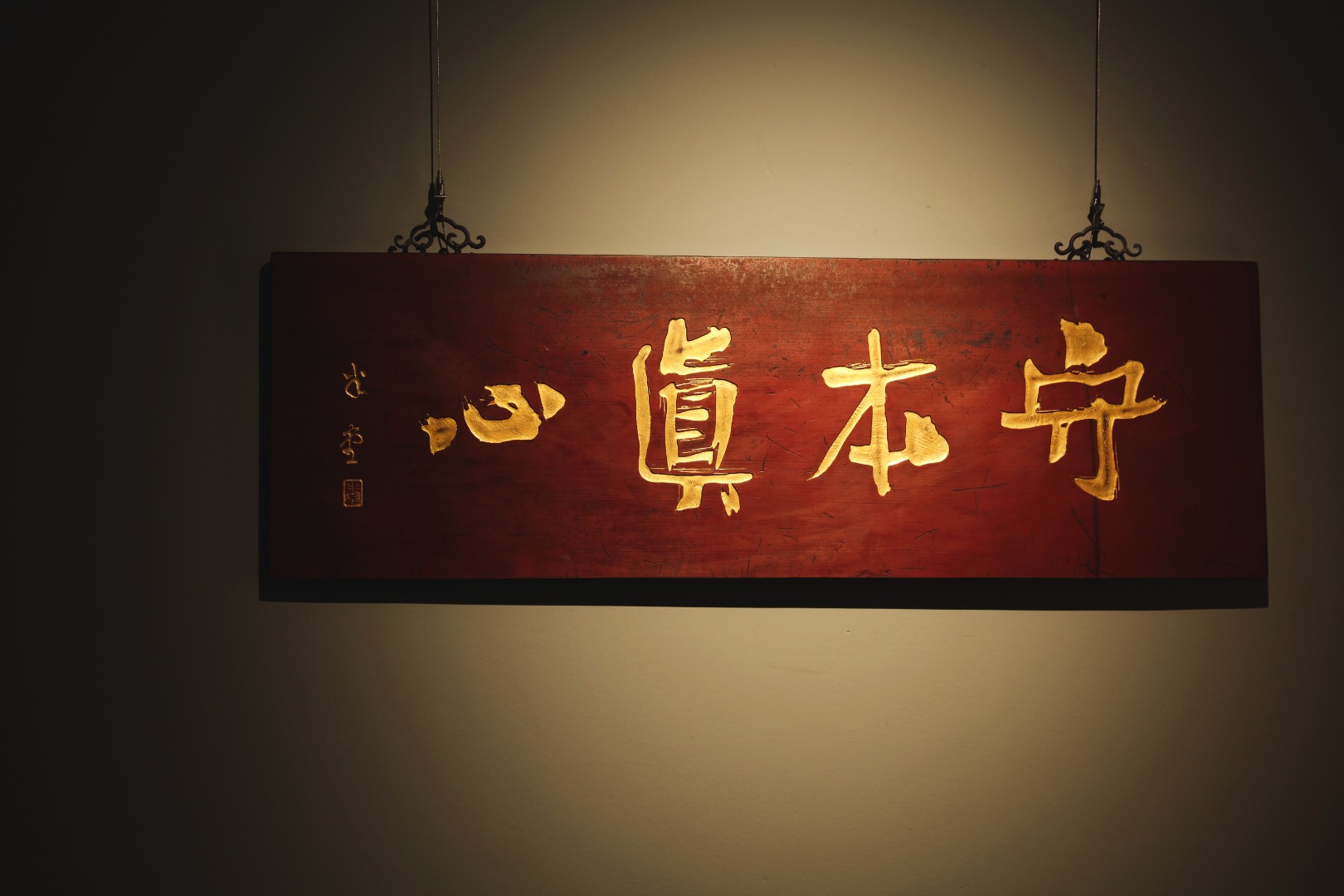 题字“守本真心”,手工贴金箔;