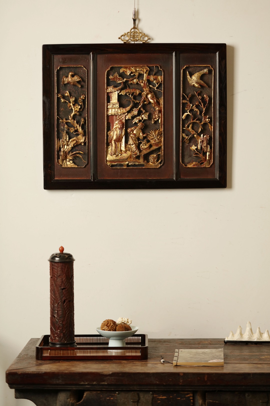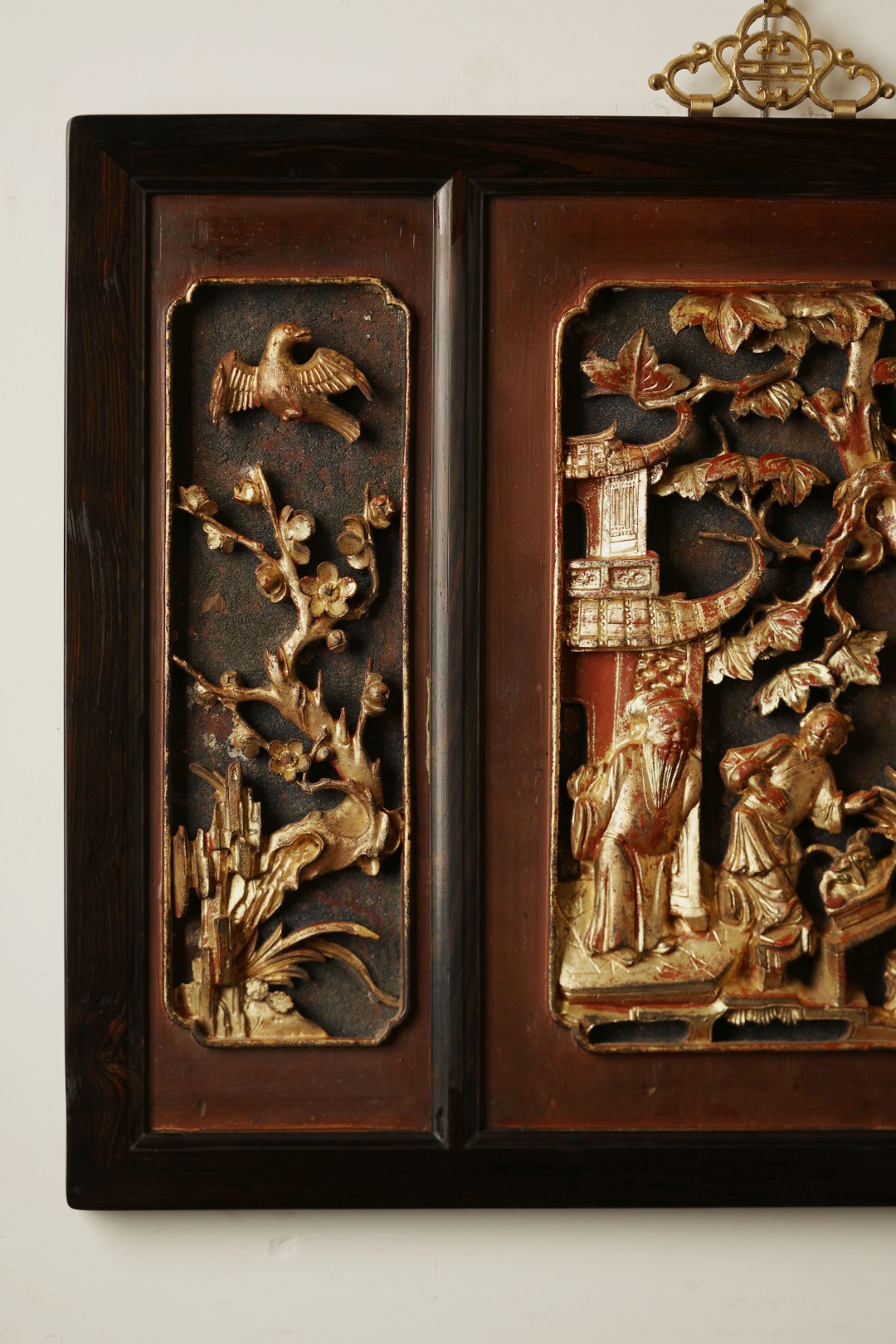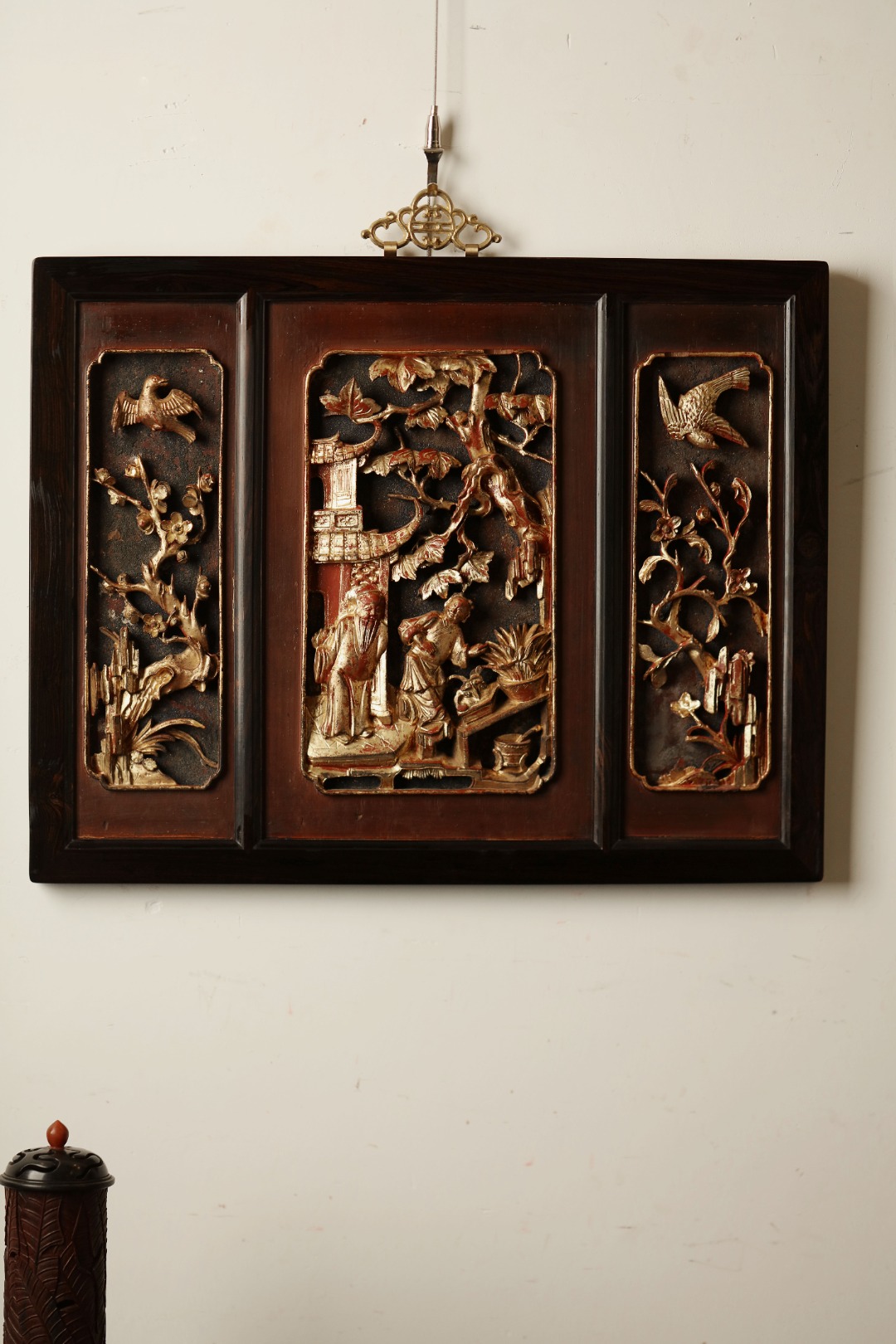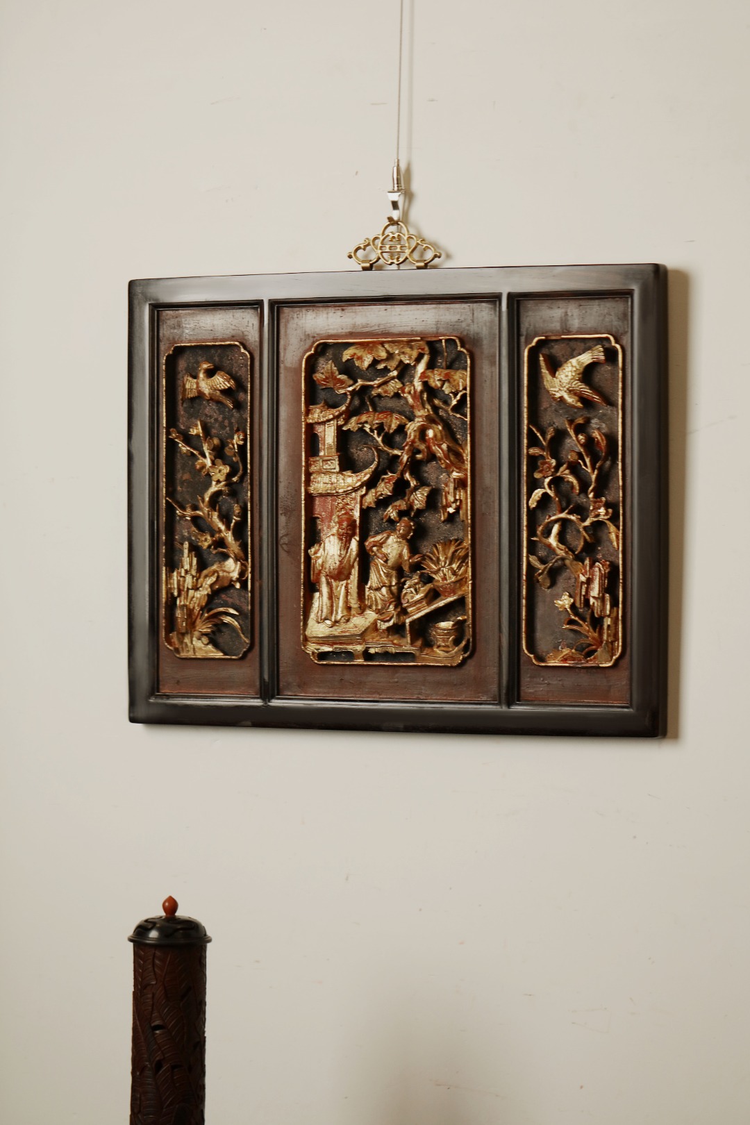 紫光檀攒框,取清期老楠木拆房花板,皮壳熟日古朴,雕工通透灵动,优美不俗。悬于厅堂雅室,颇增古意。