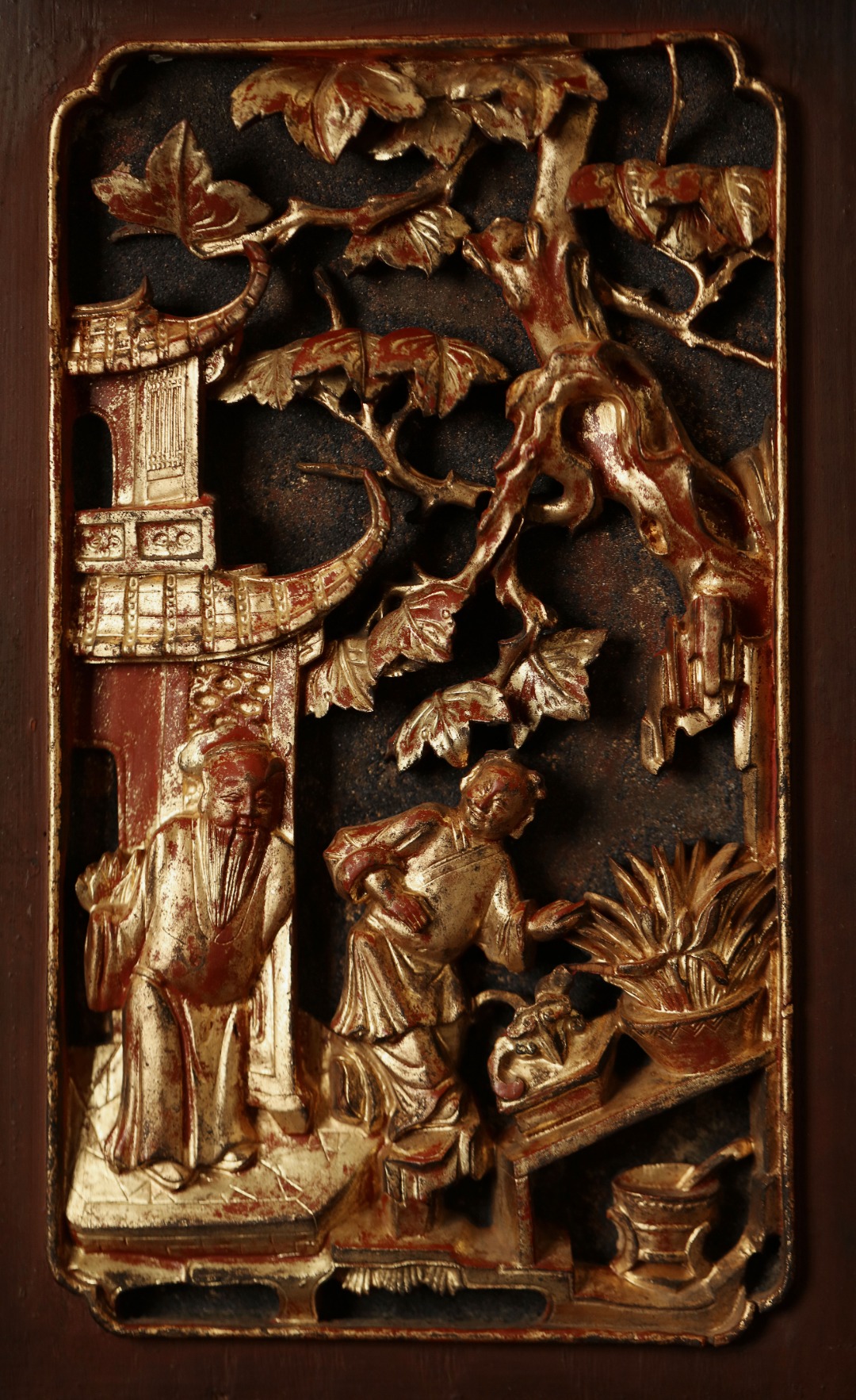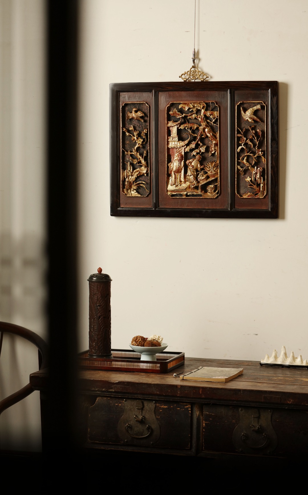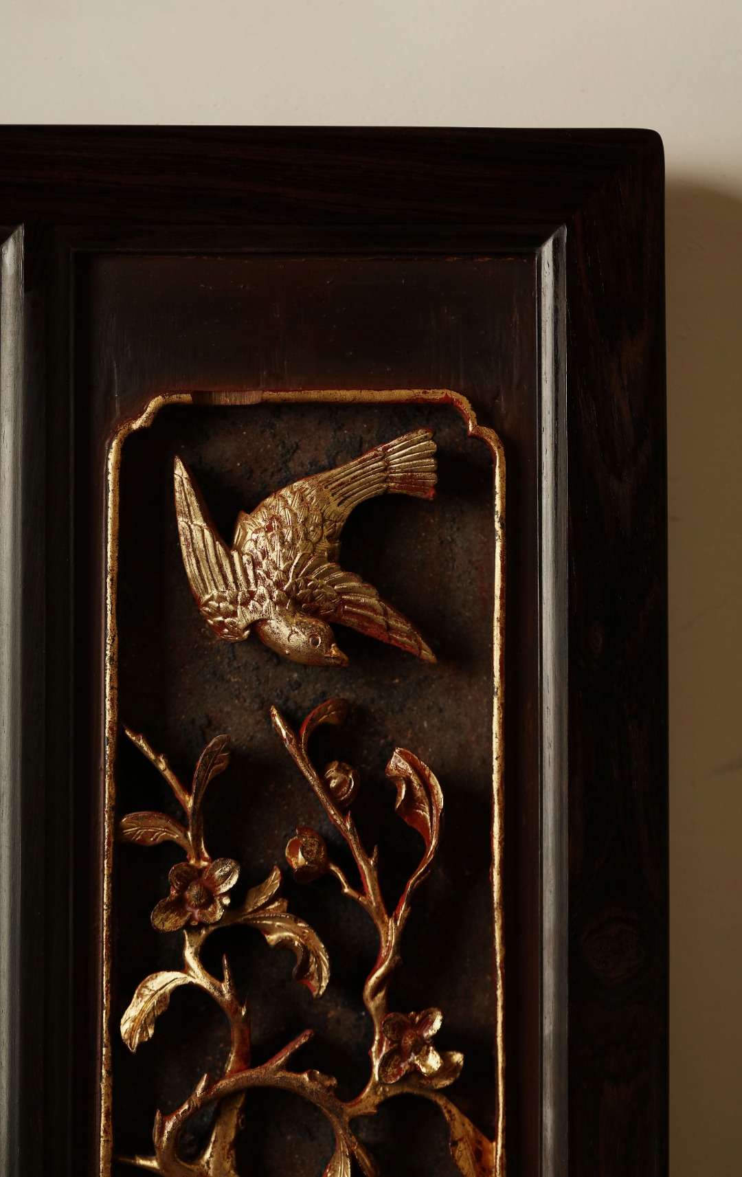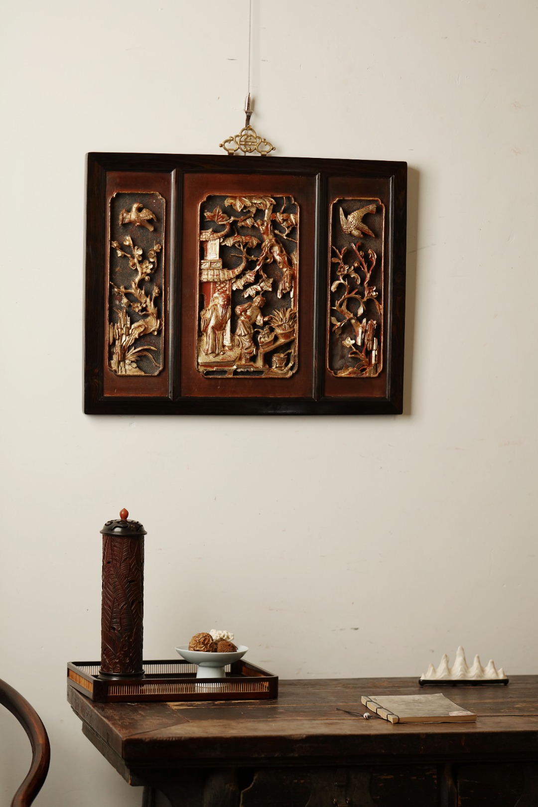 紫光檀攒框,取清期老楠木拆房花板,皮壳熟日古朴,雕工通透灵动,优美不俗。悬于厅堂雅室,颇增古意。