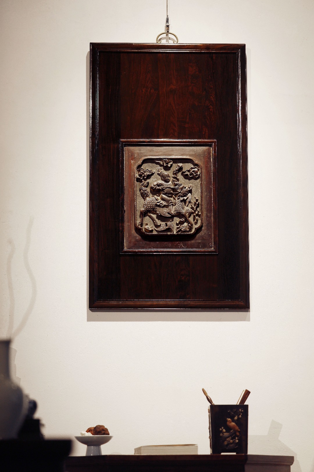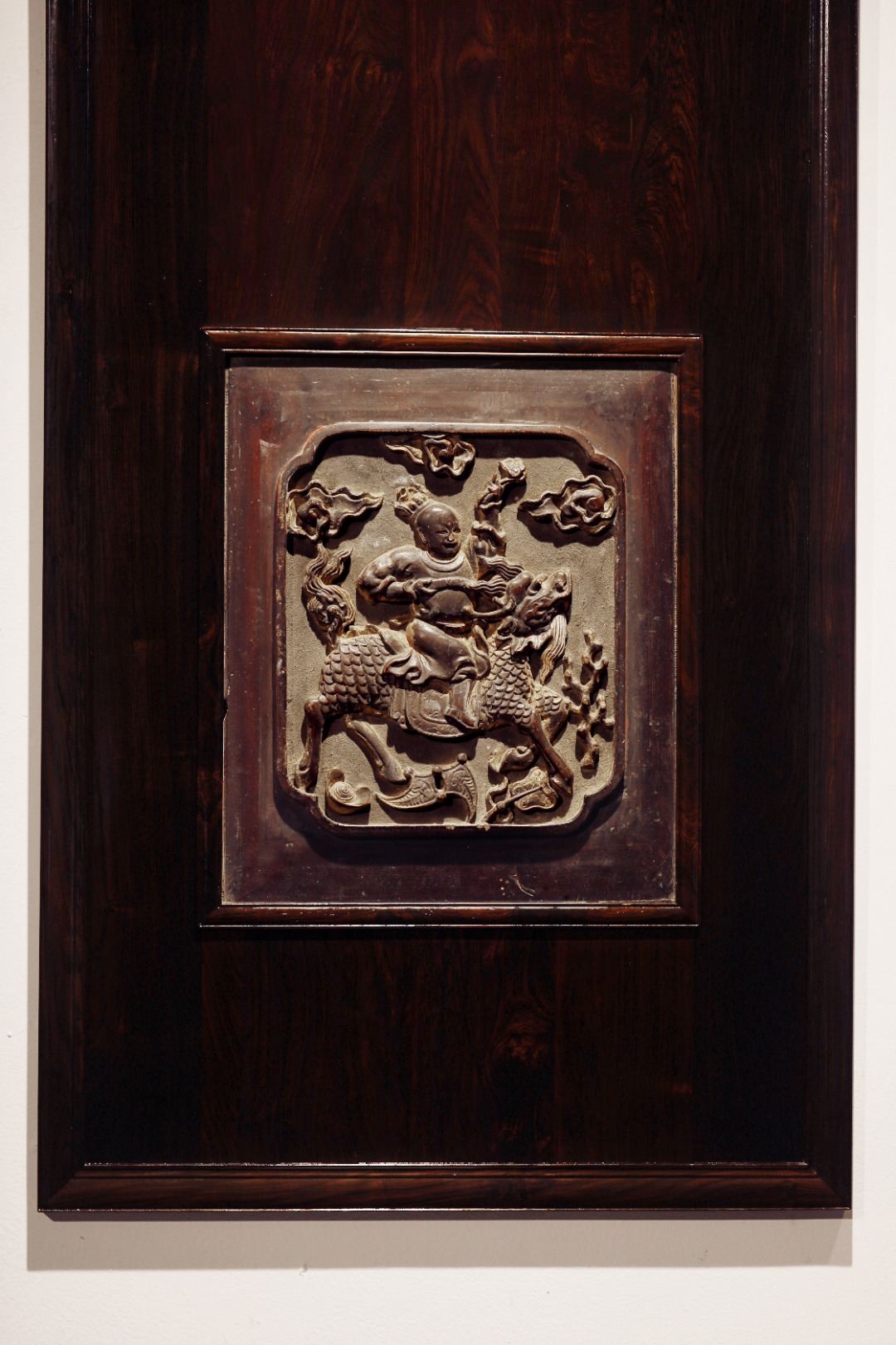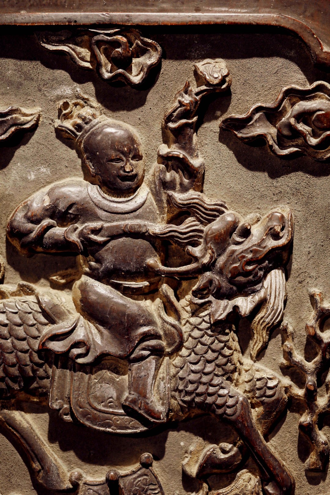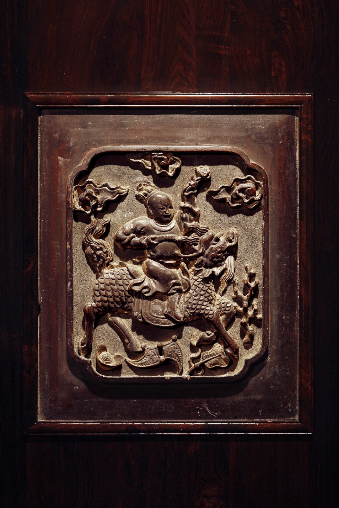 鎏金原漆皮壳高浮雕人物麒麟图,寓意祥瑞;