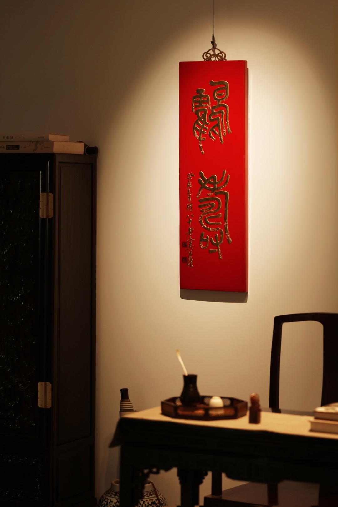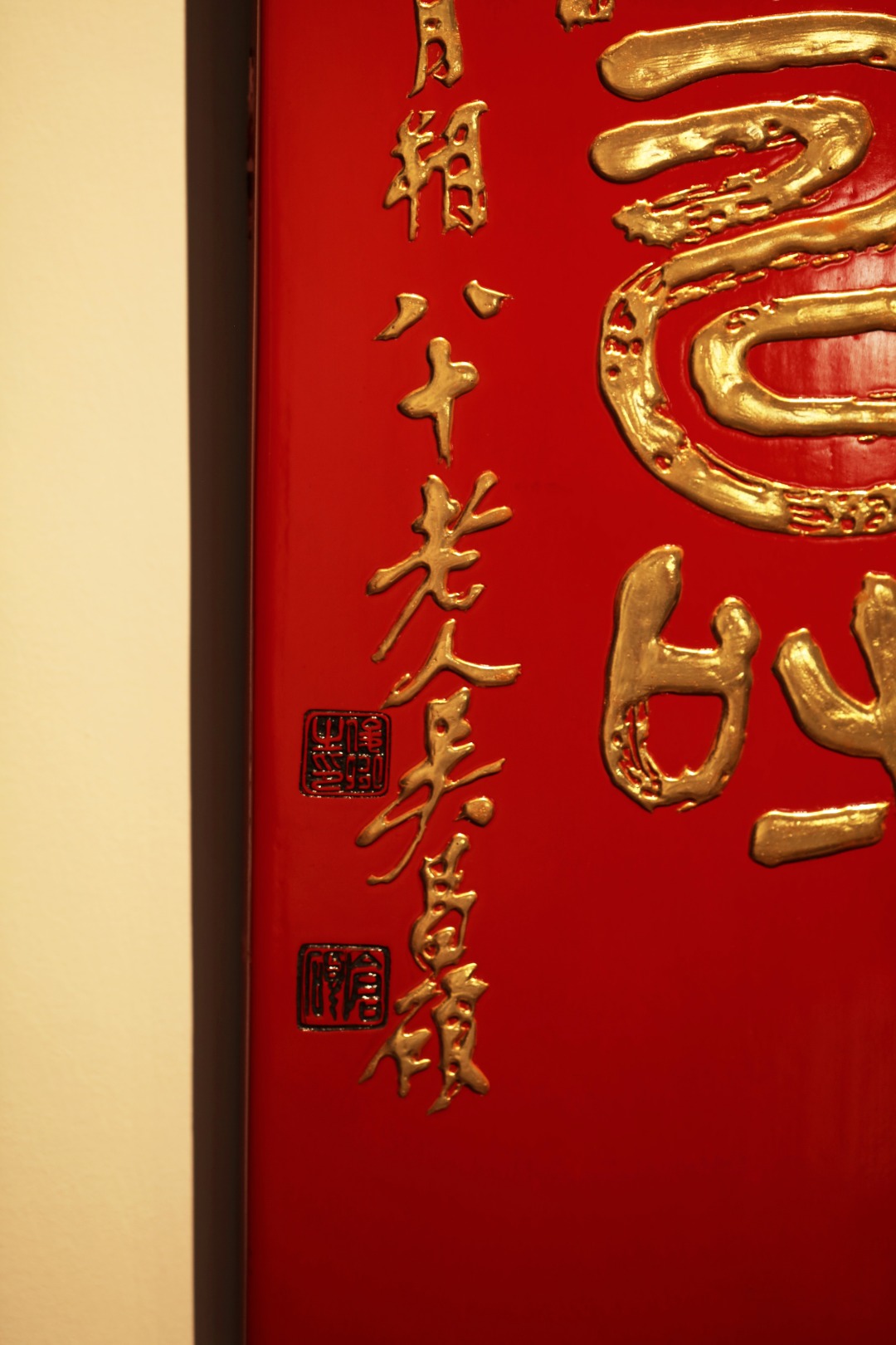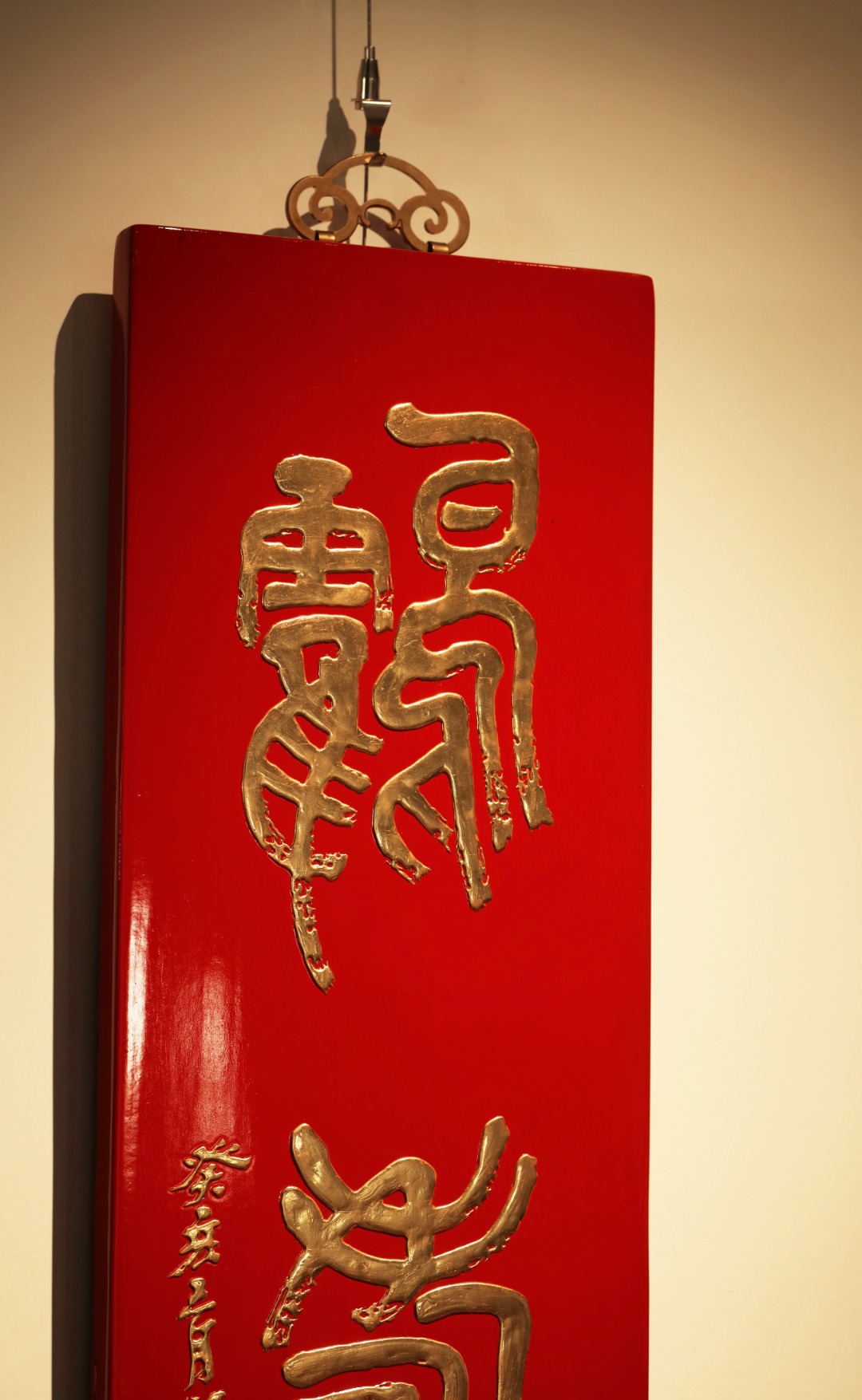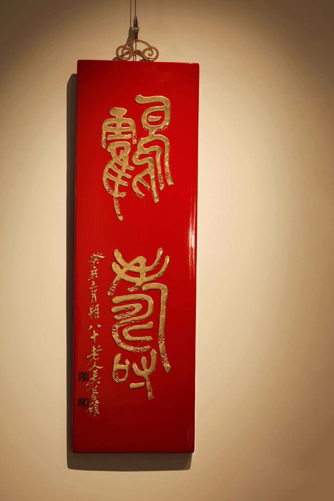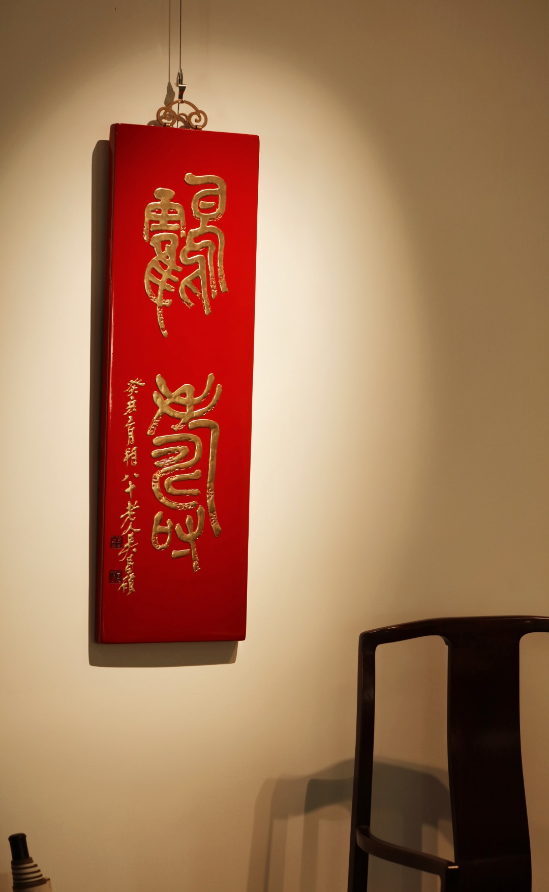 老木板新作,匾正面髹天然朱漆,题“鹤寿”贴金箔,癸亥三月朔,八十老人吴昌硕。悬于文房茶室,可添雅蕴。