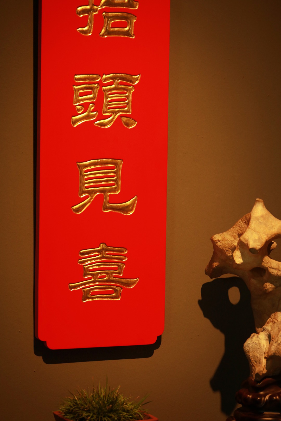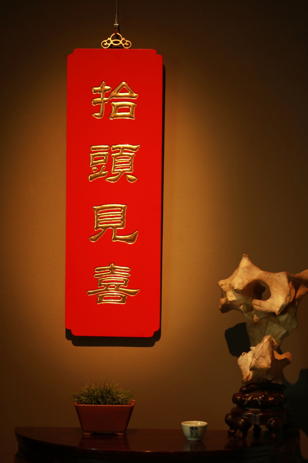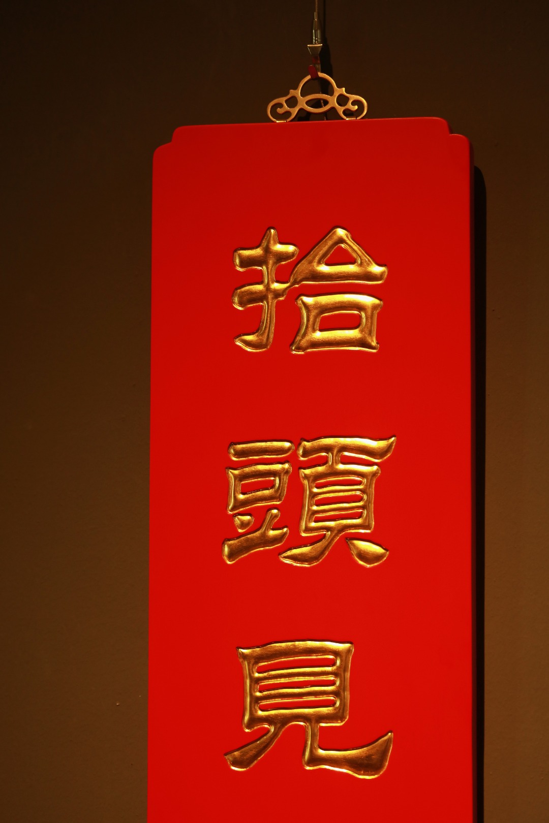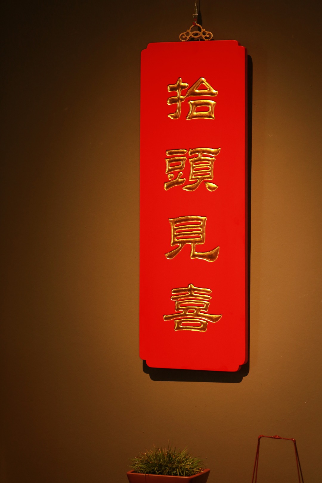 题字“抬头见喜”贴金箔;