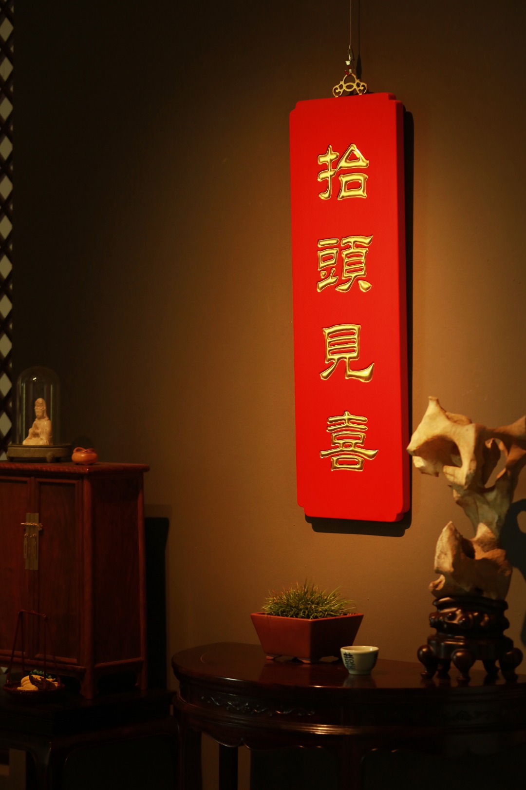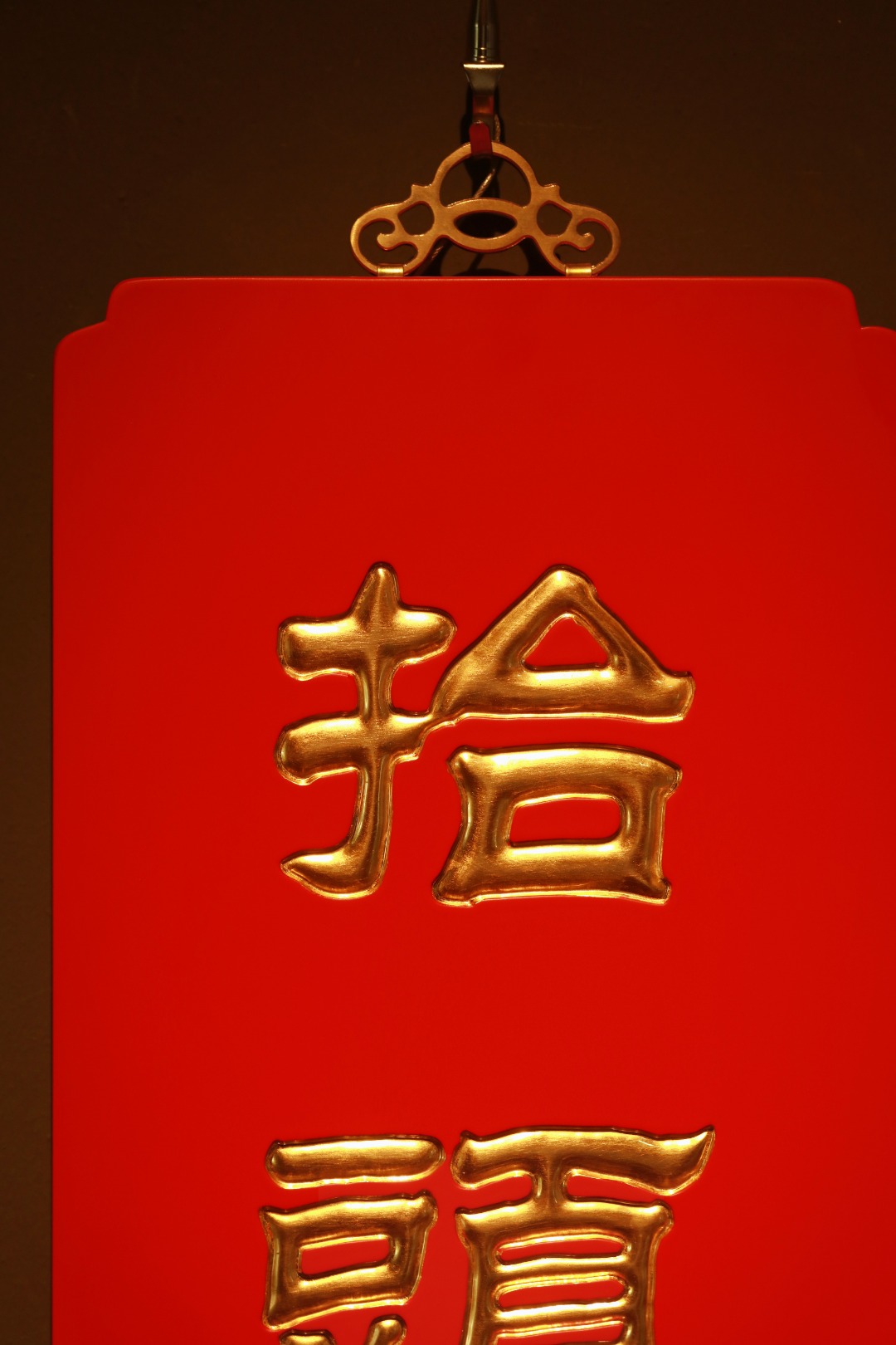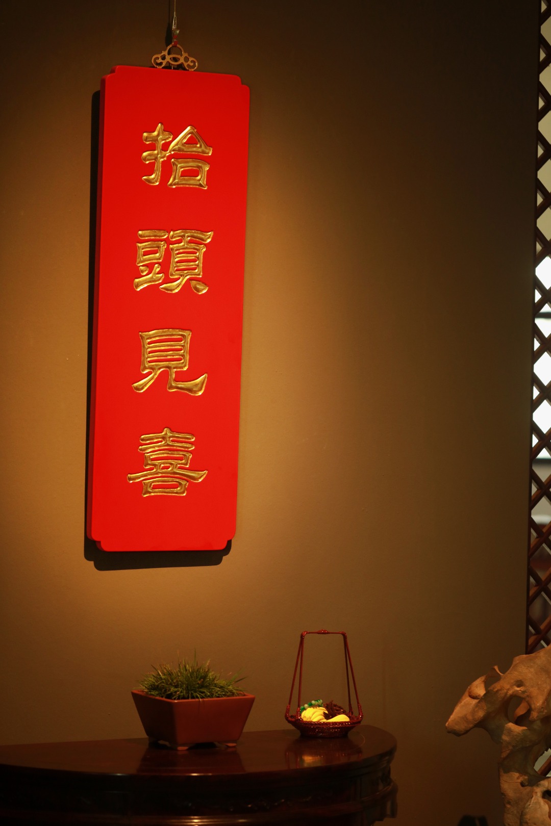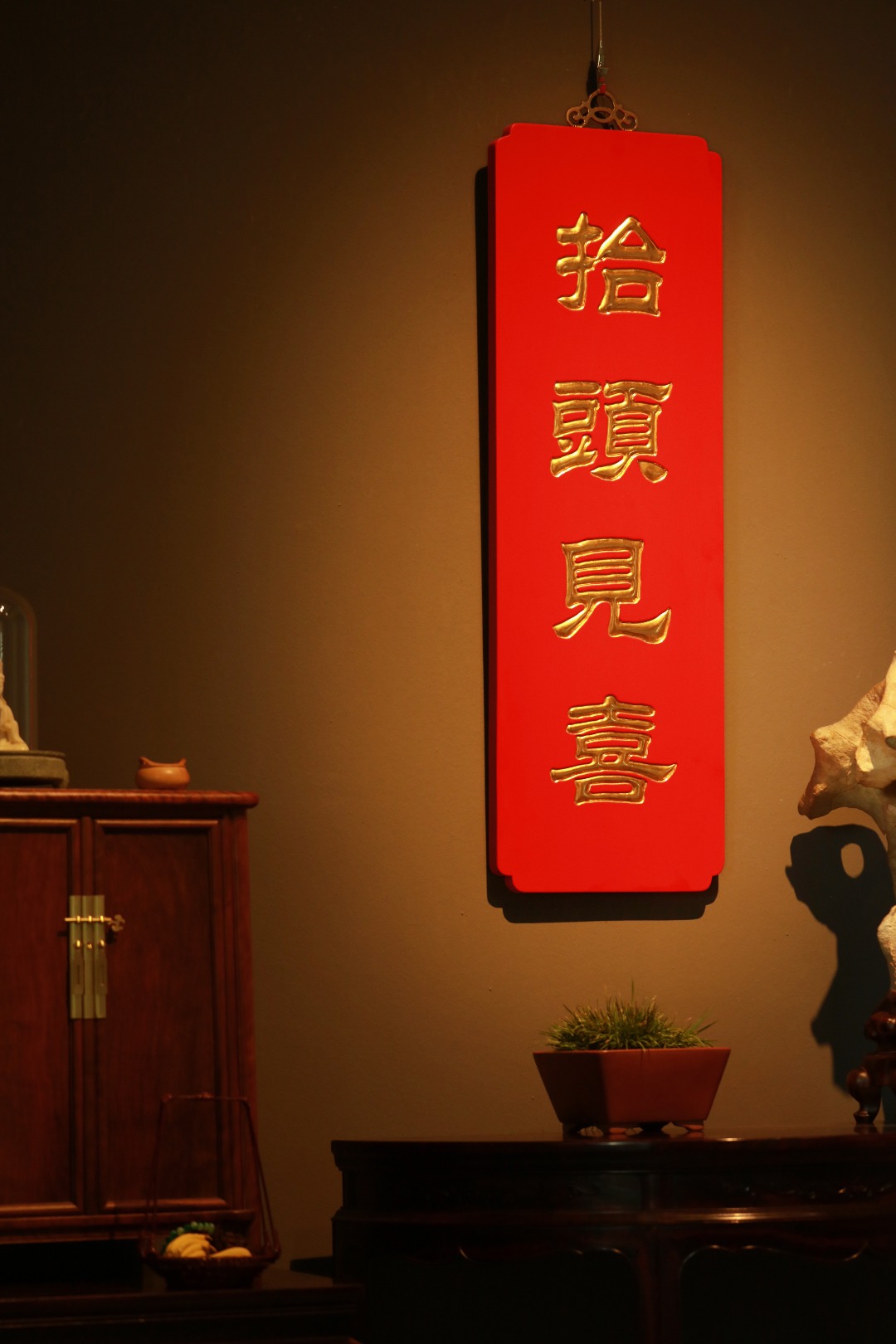 题字“抬头见喜”贴金箔;