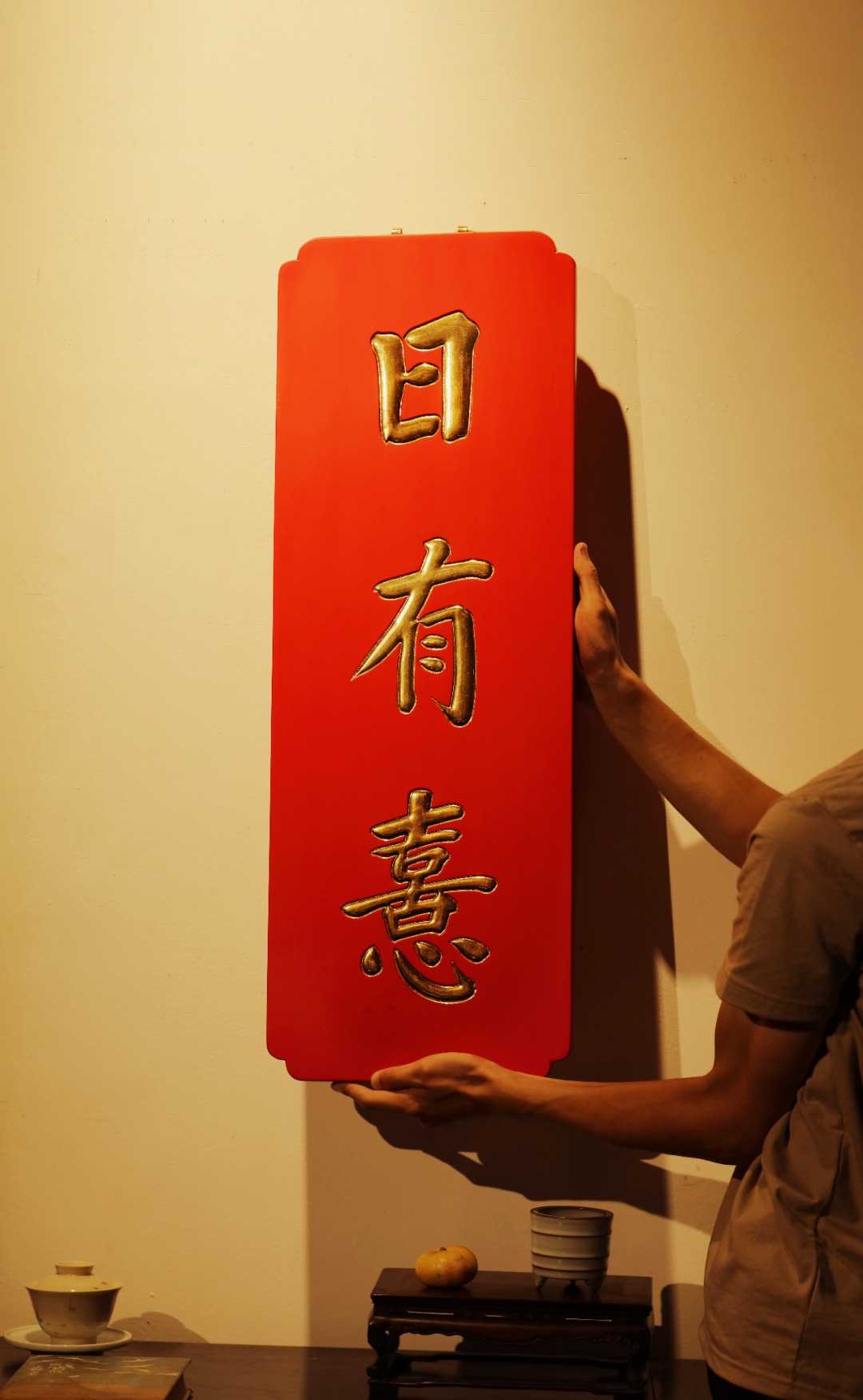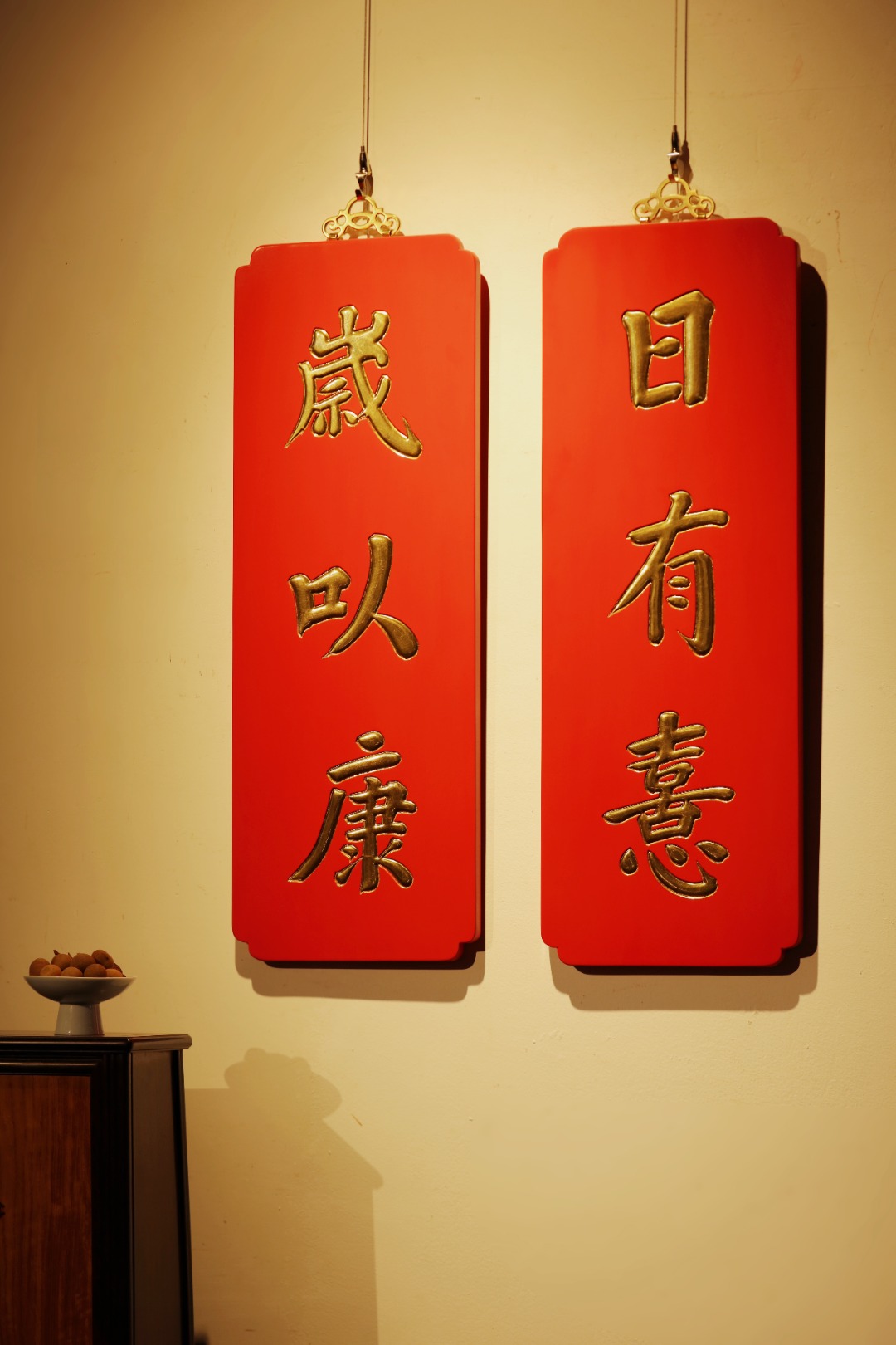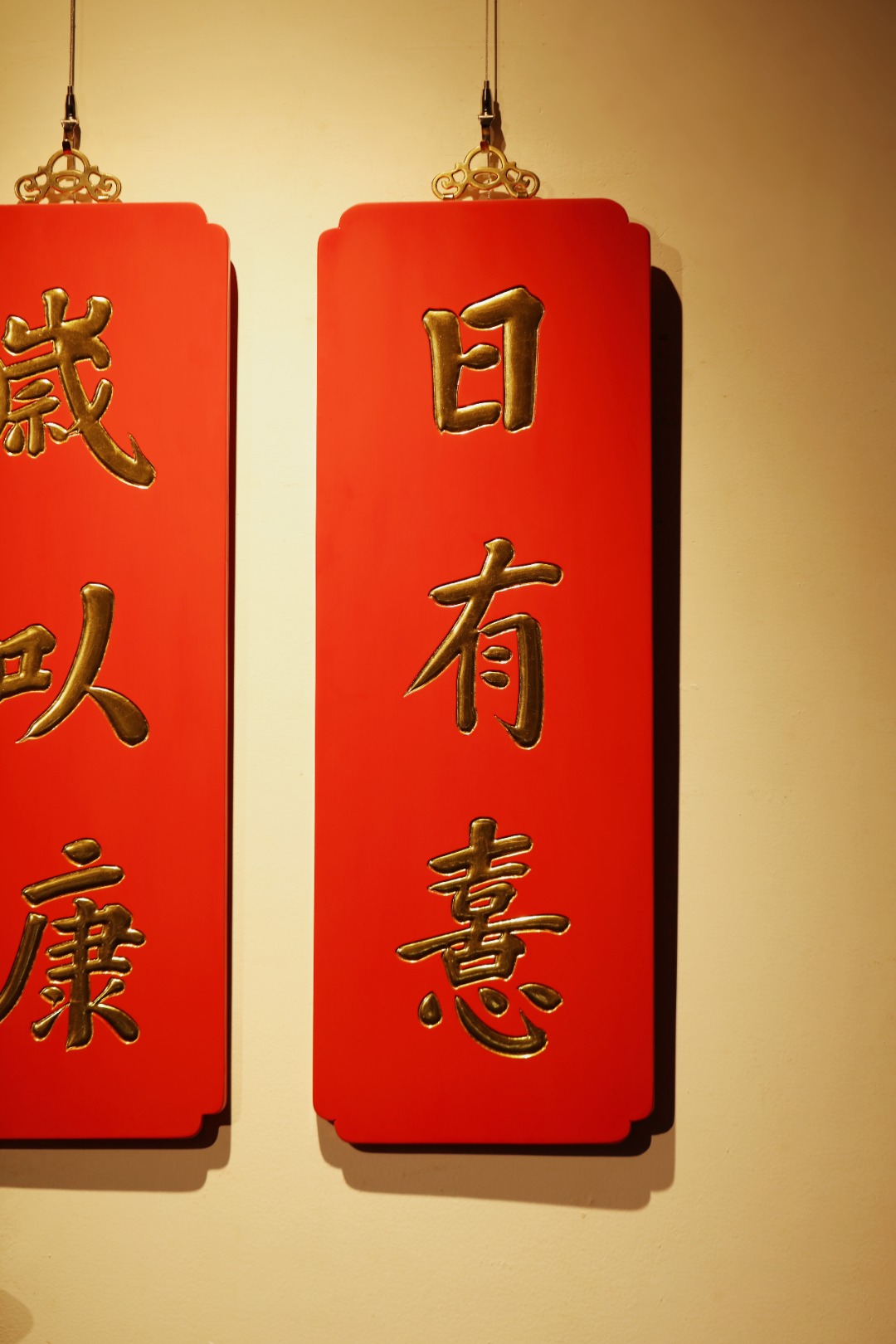 题字:“日有喜·岁以康”贴金箔;
