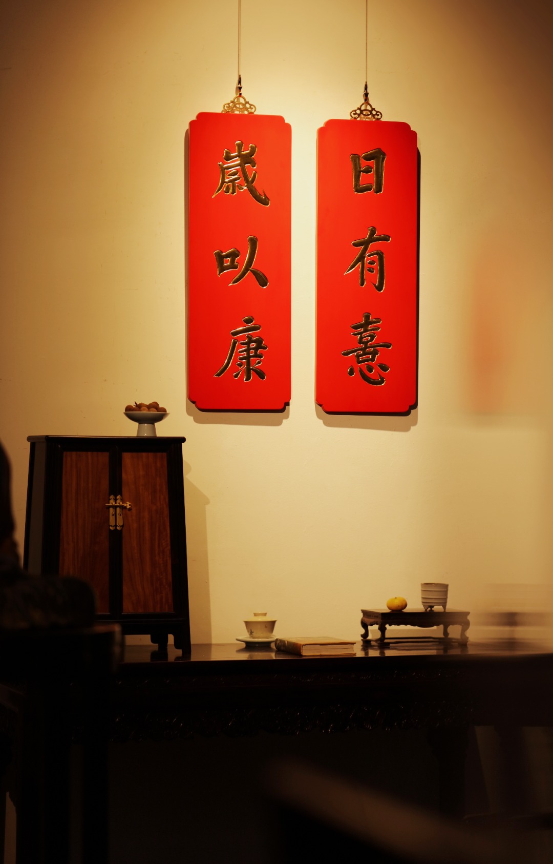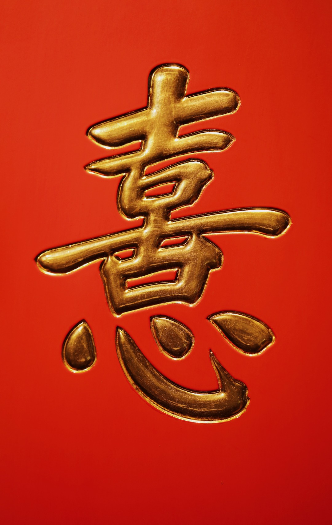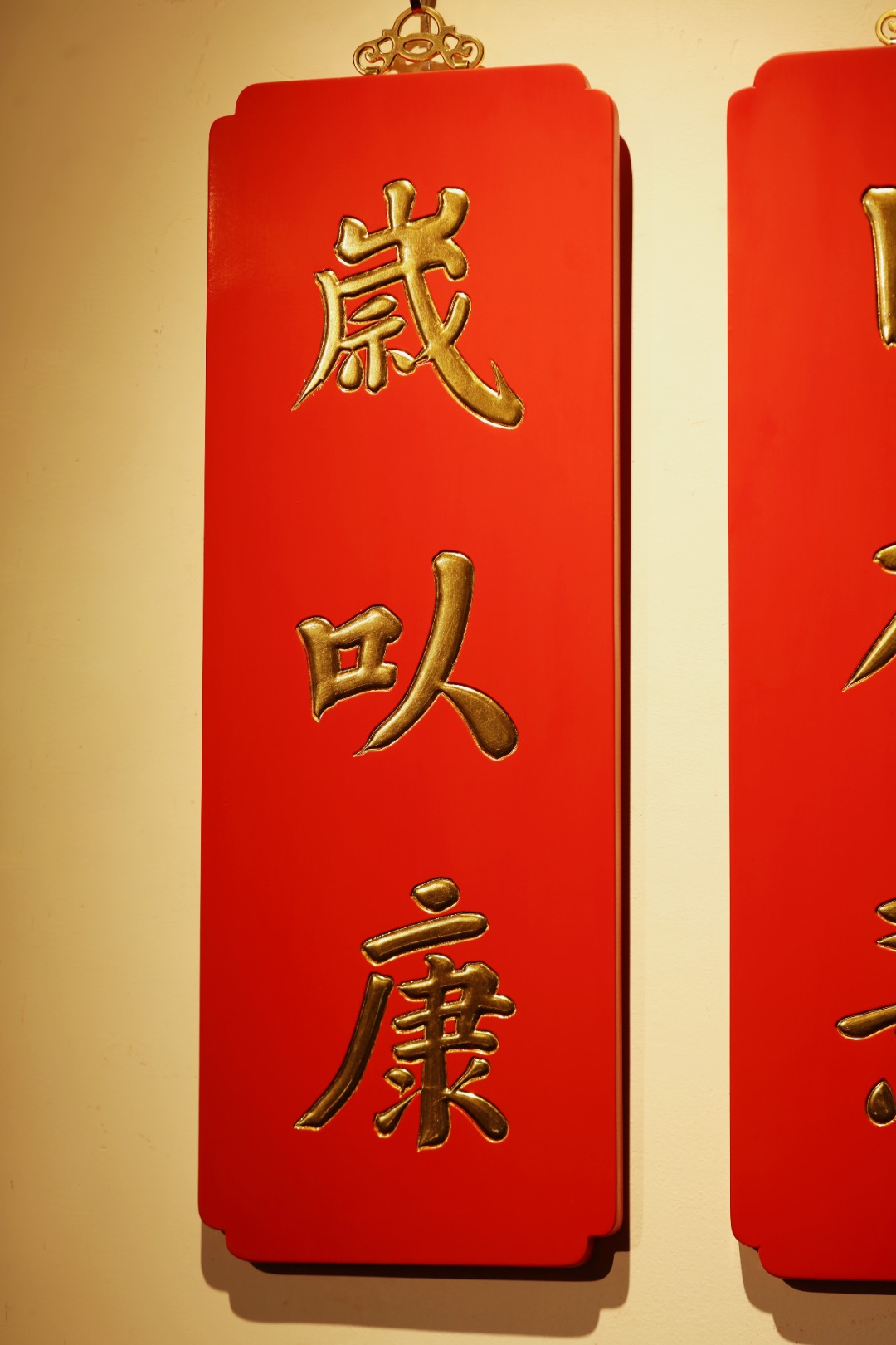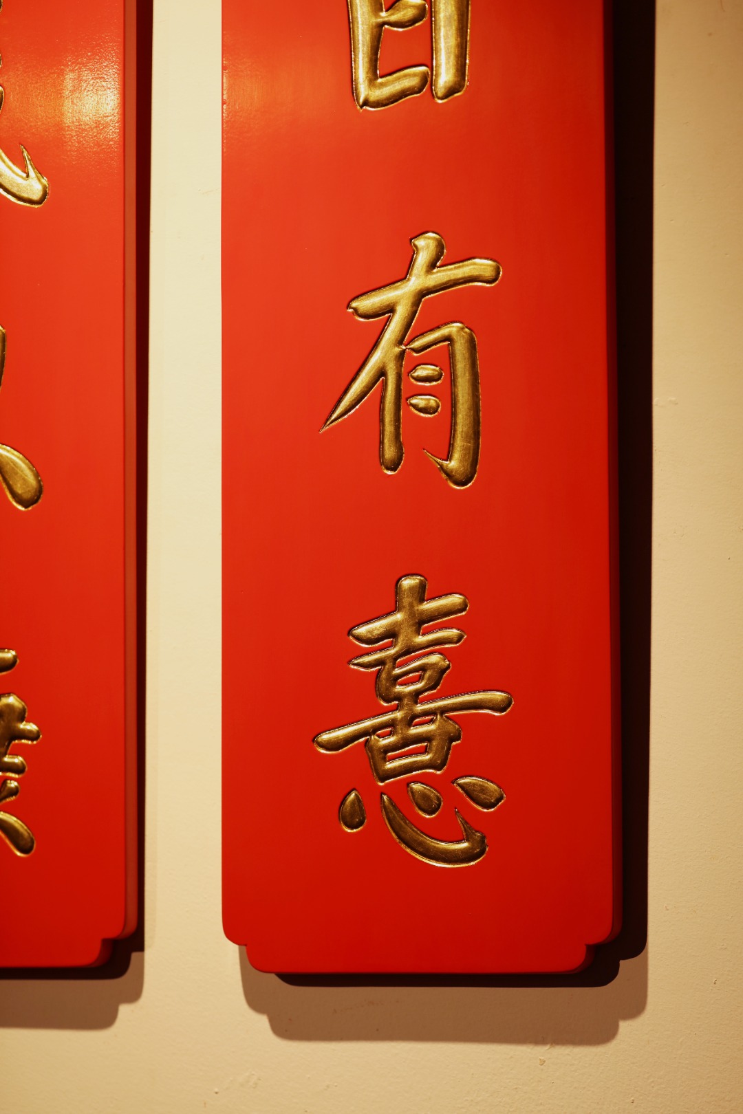 题字:“日有喜·岁以康”贴金箔;