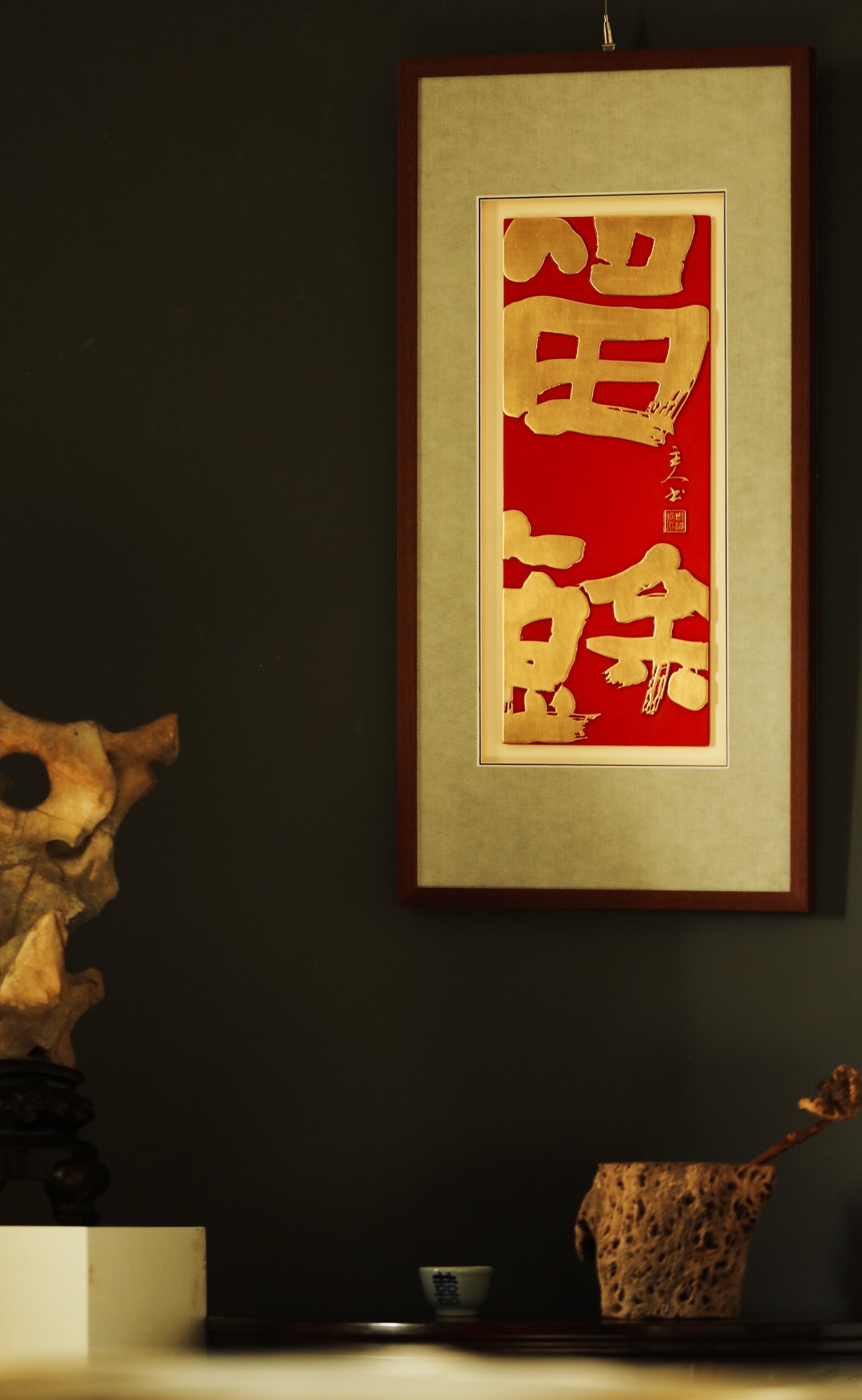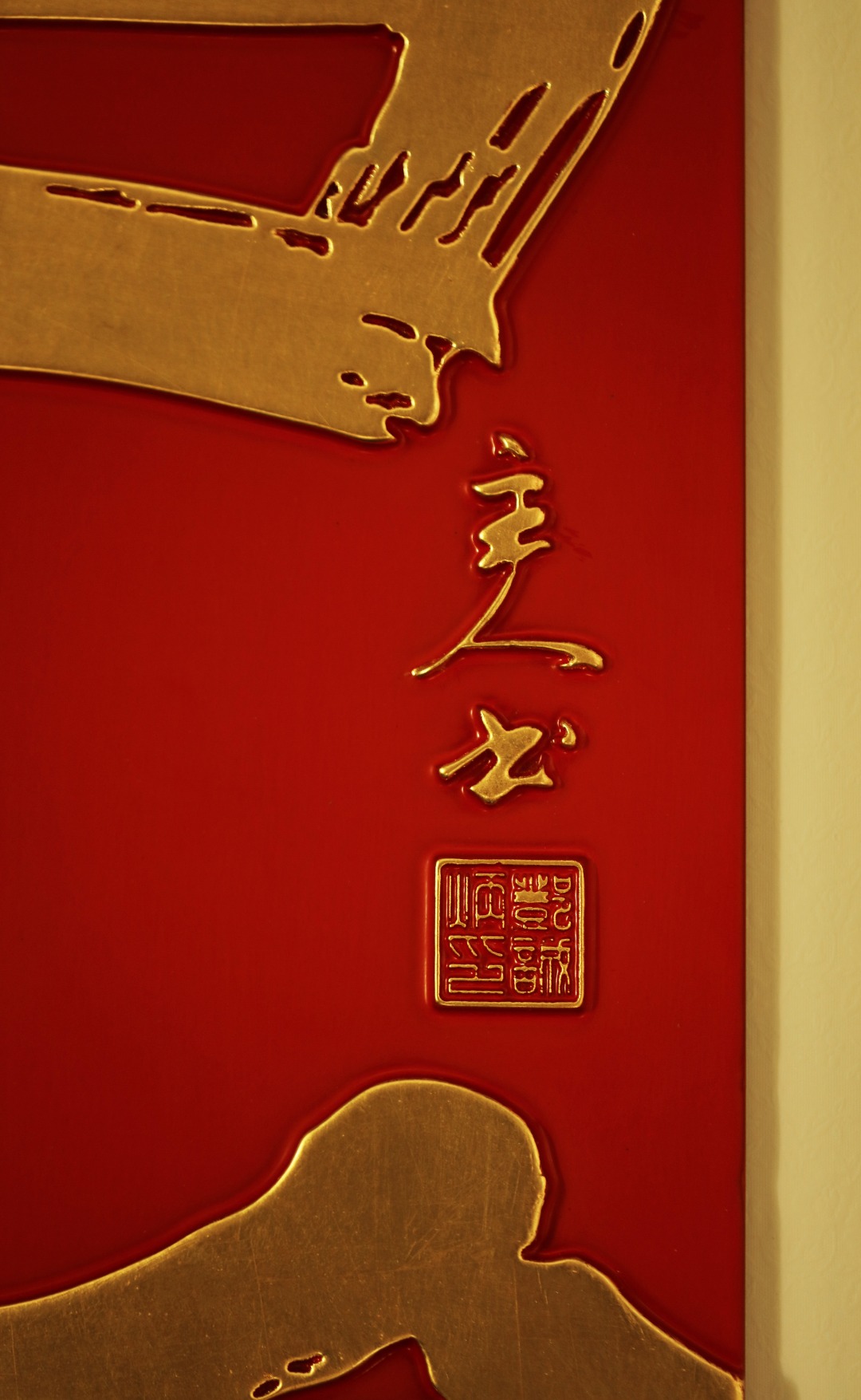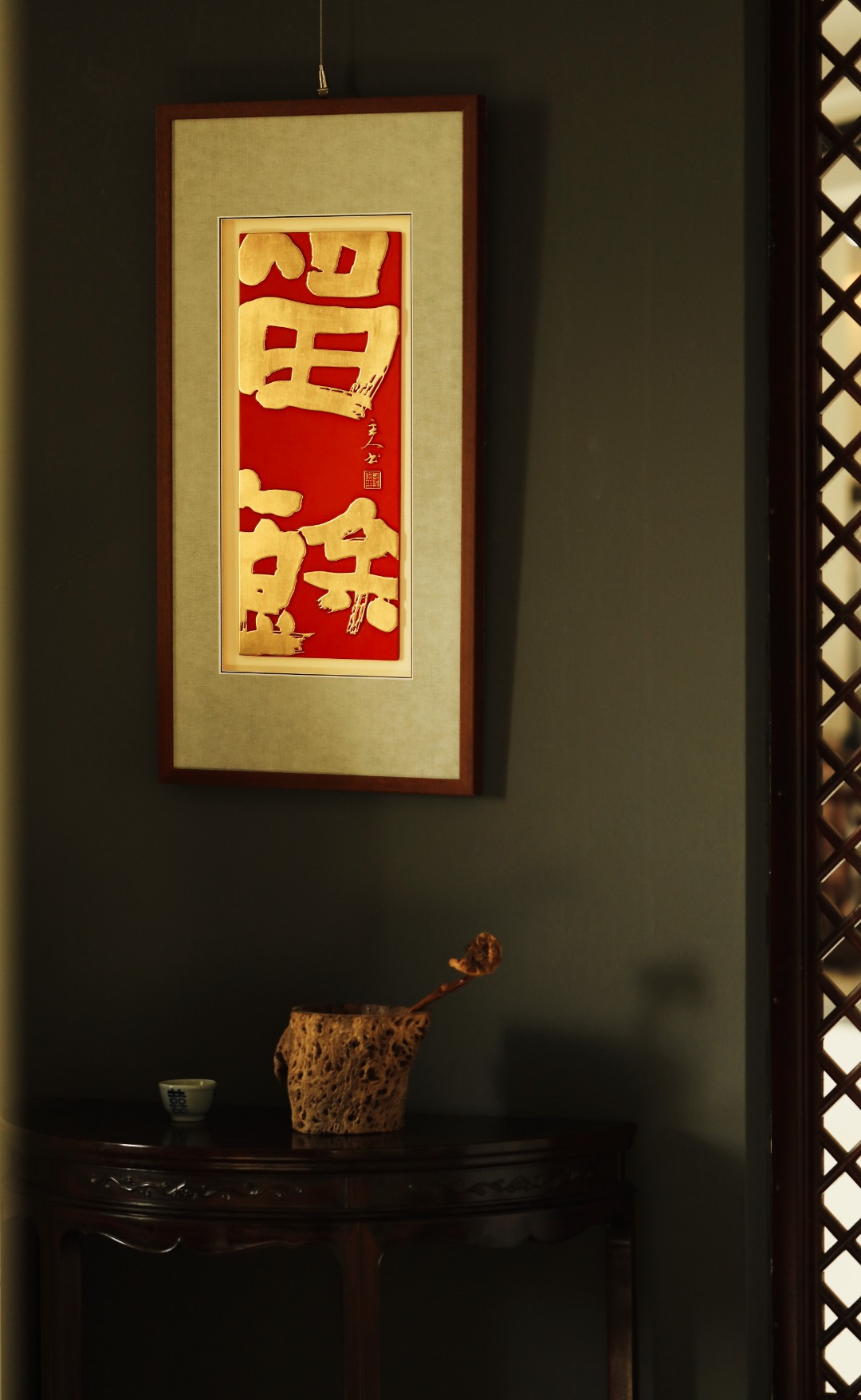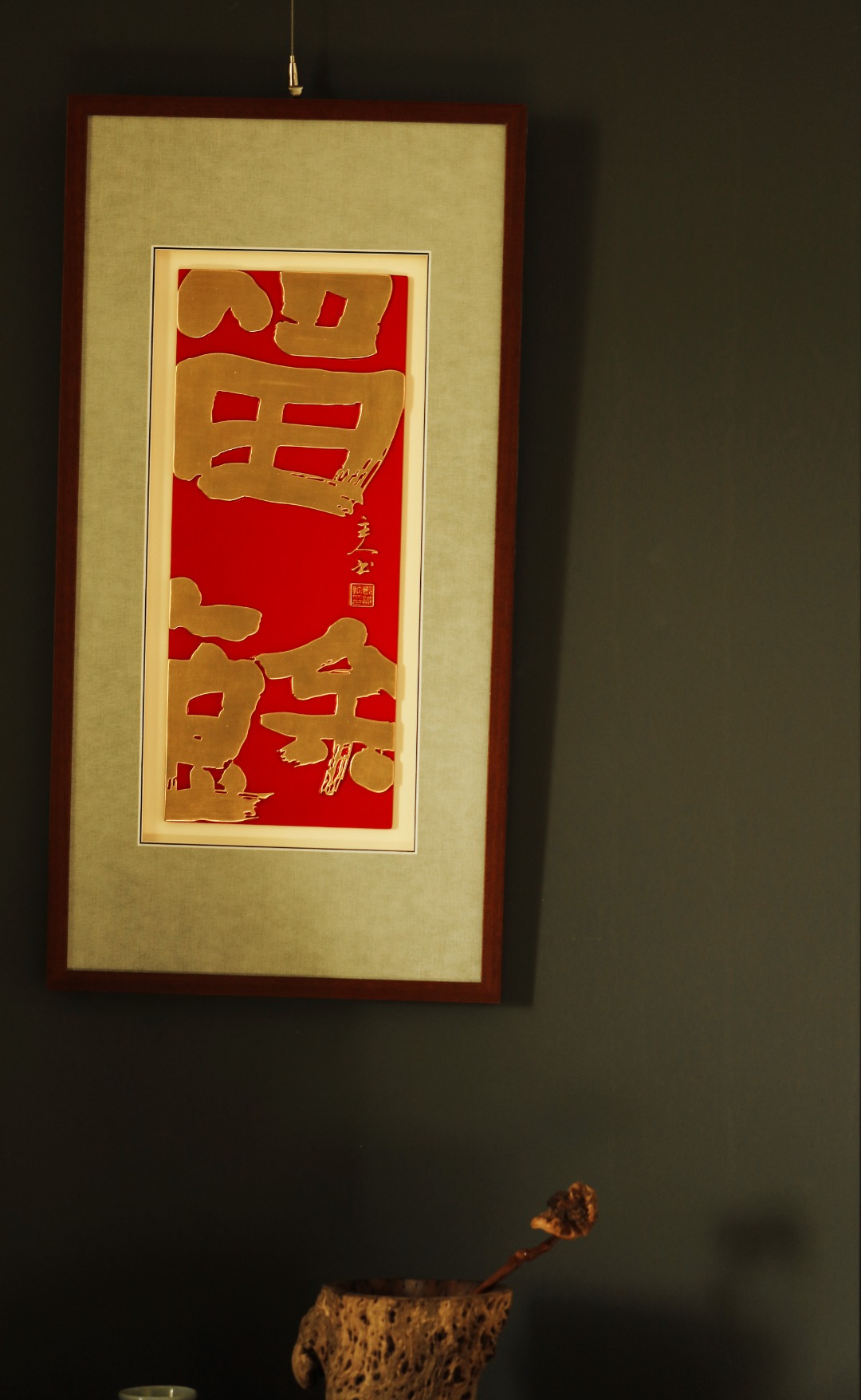 老木板新做,形制典雅,面髹朱漆,后又真金漆绘,悬于厅堂文房,精致有韵。主人书 钤印:邓诚炳印。