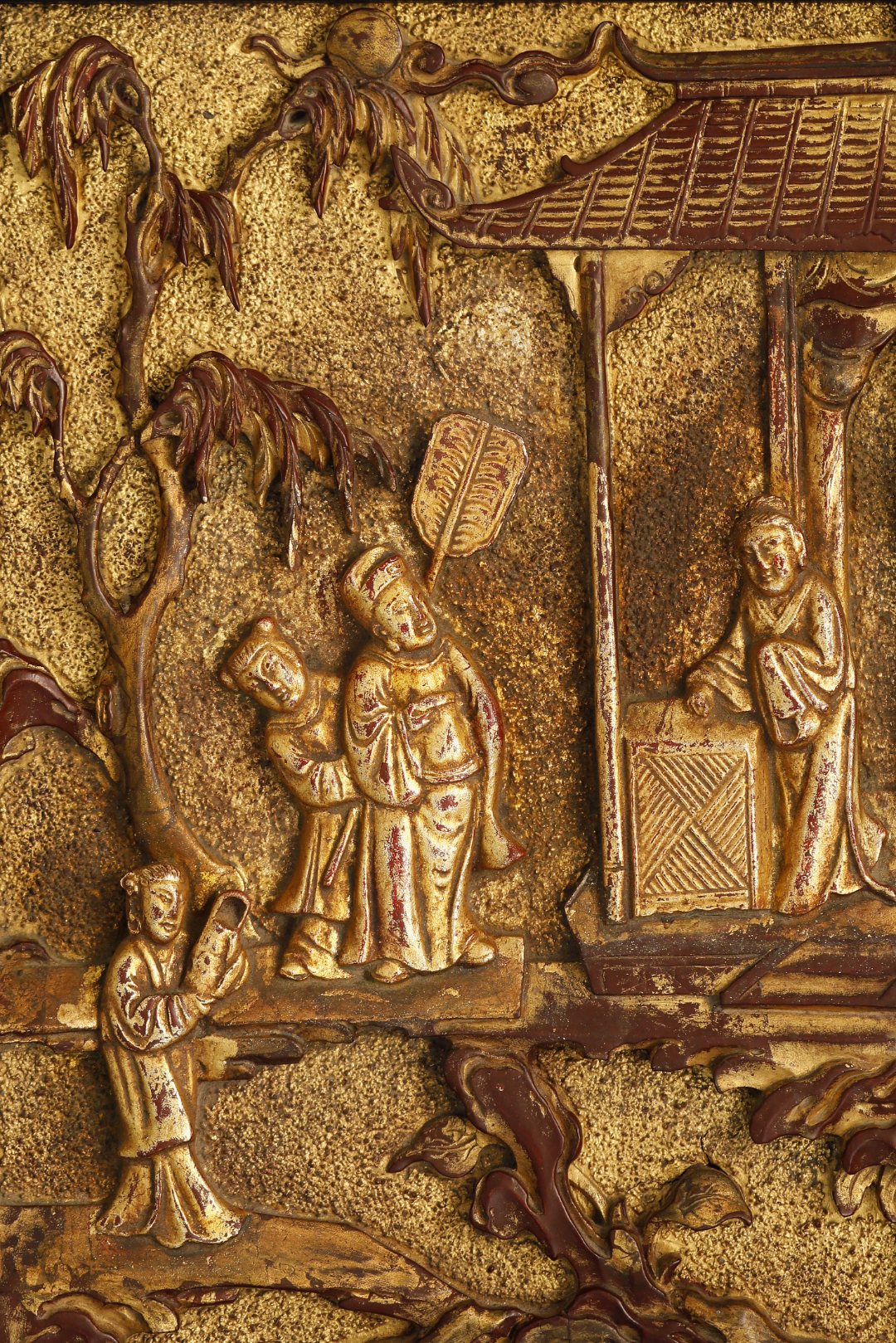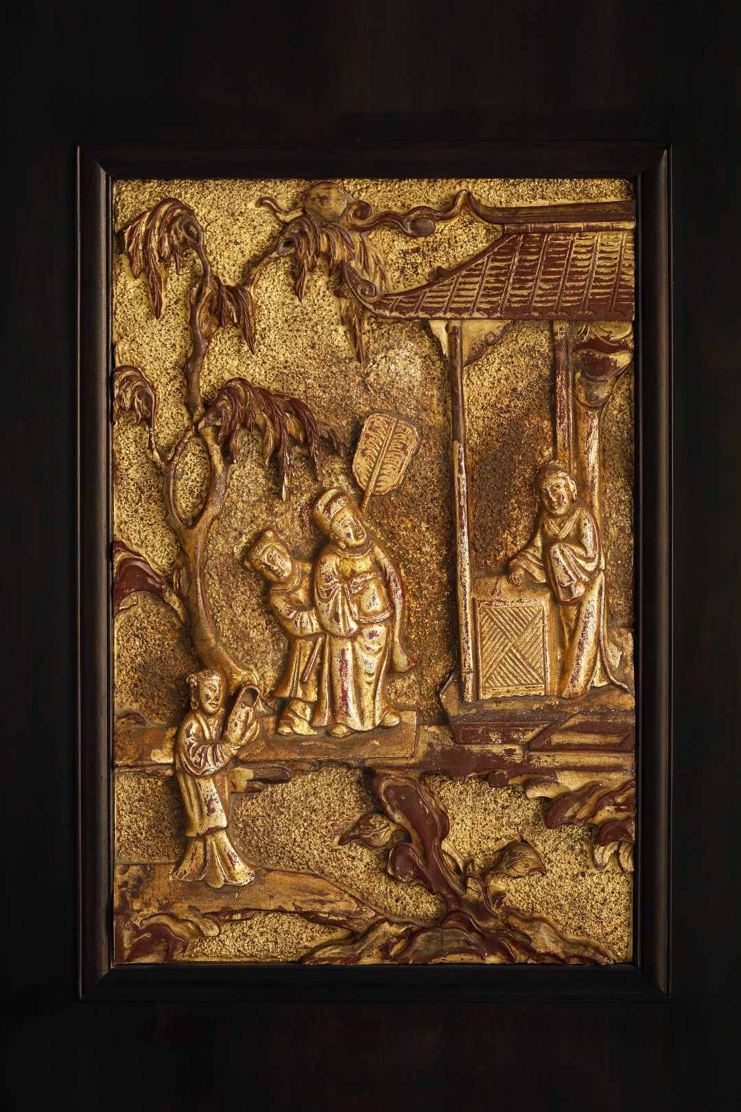 鎏金原漆皮壳,高浮雕“山亭雅趣”,