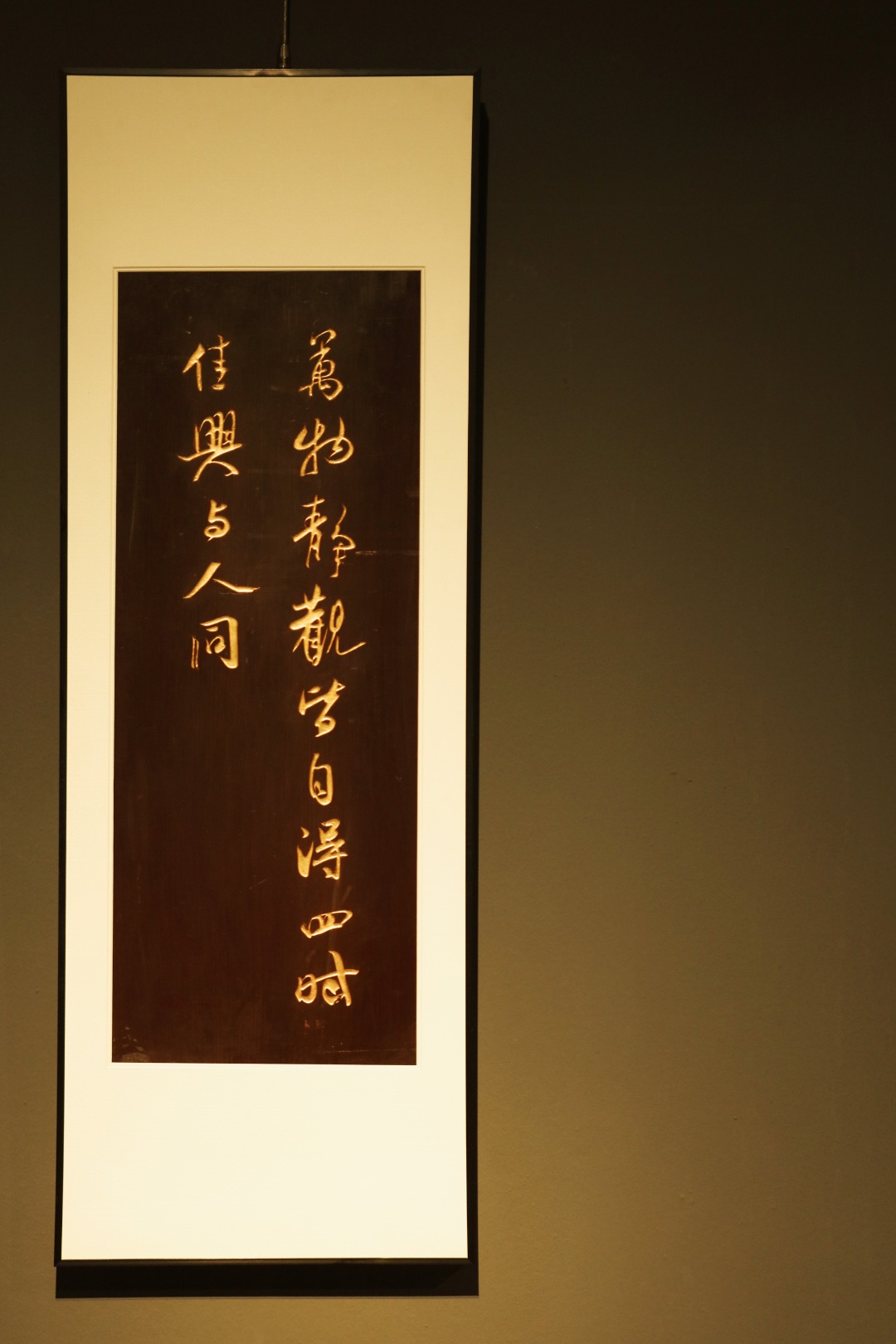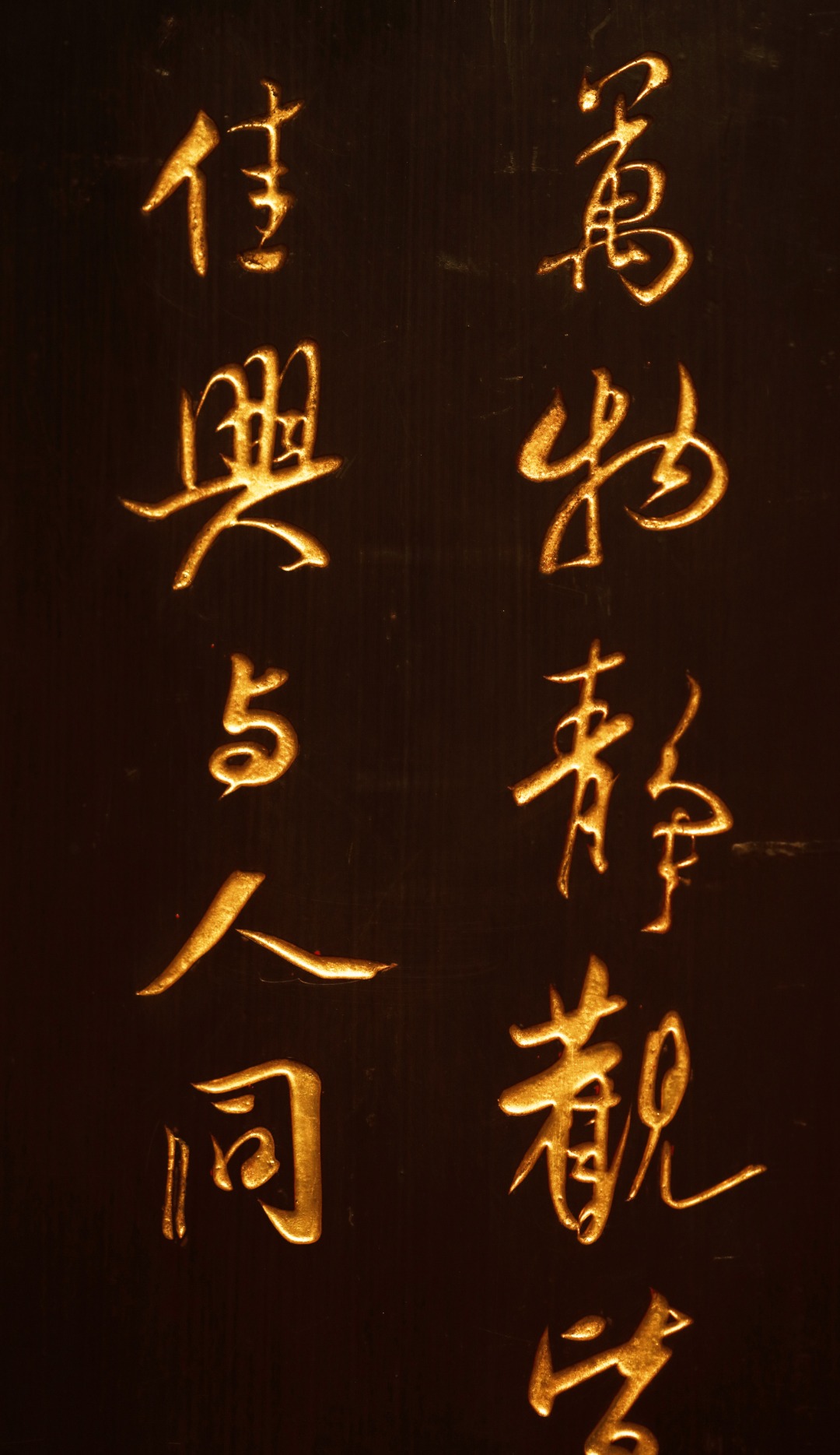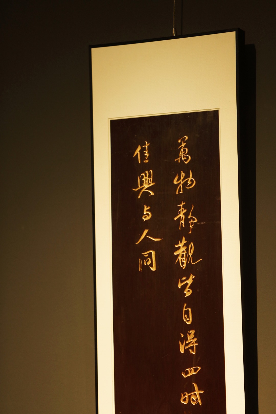 题识:“万物静观皆自得,四时佳兴与人同。‘’老楠木手刻,大漆描绘,字体酣畅浑厚,苍劲有力,悬于厅堂,可添雅蕴。