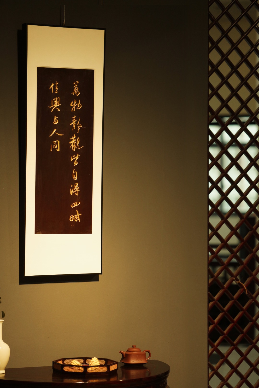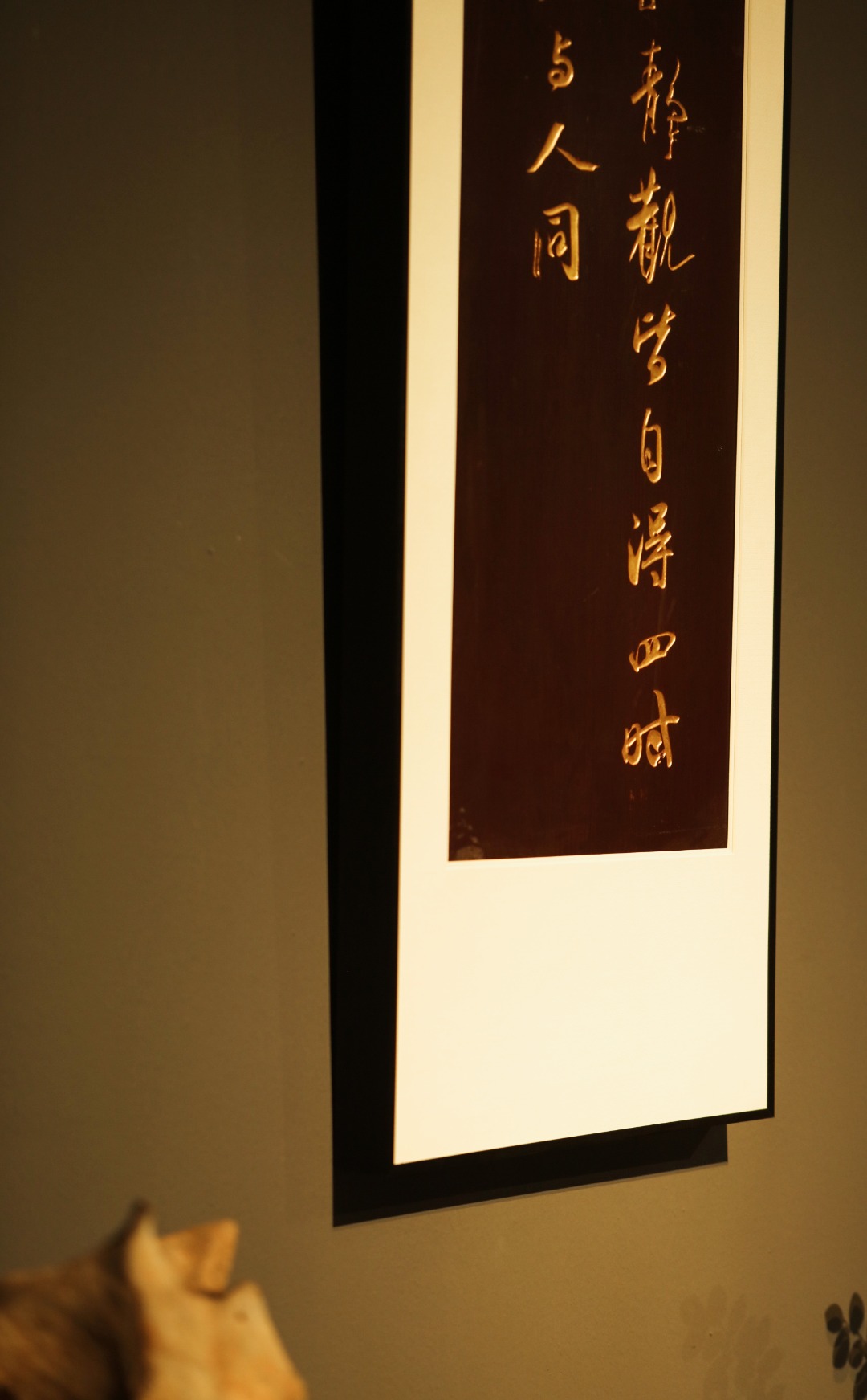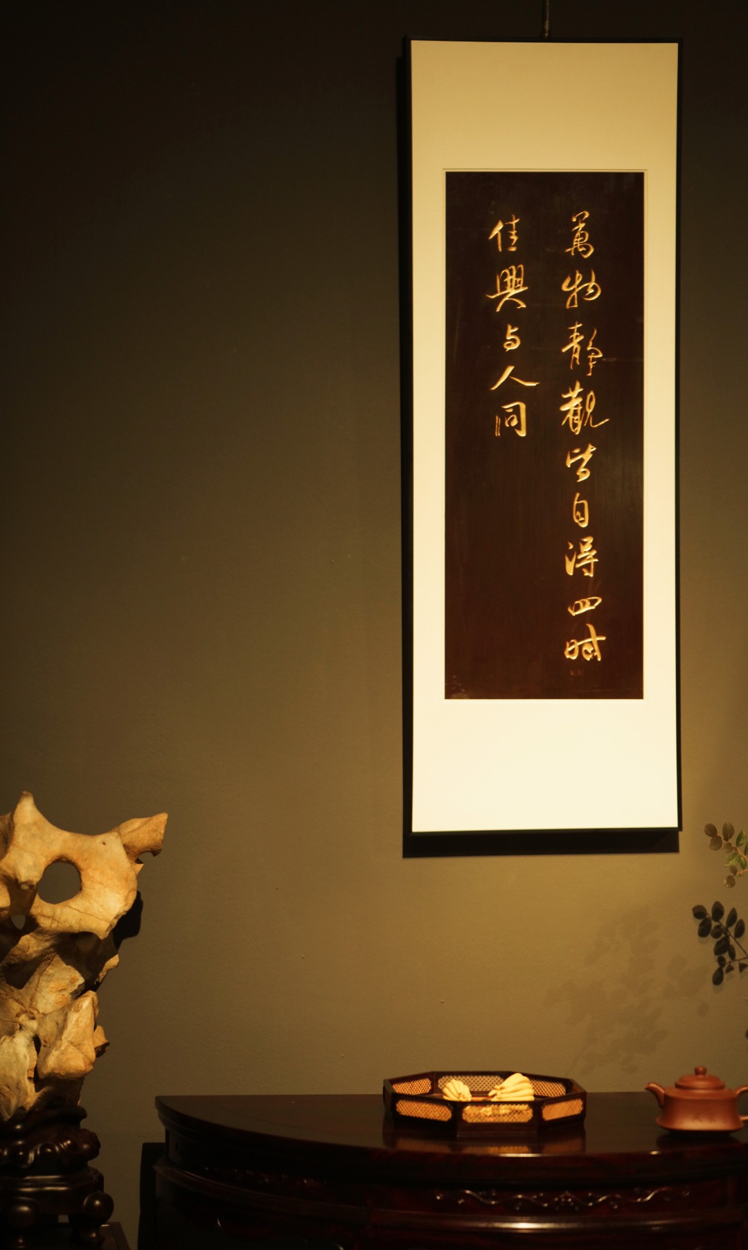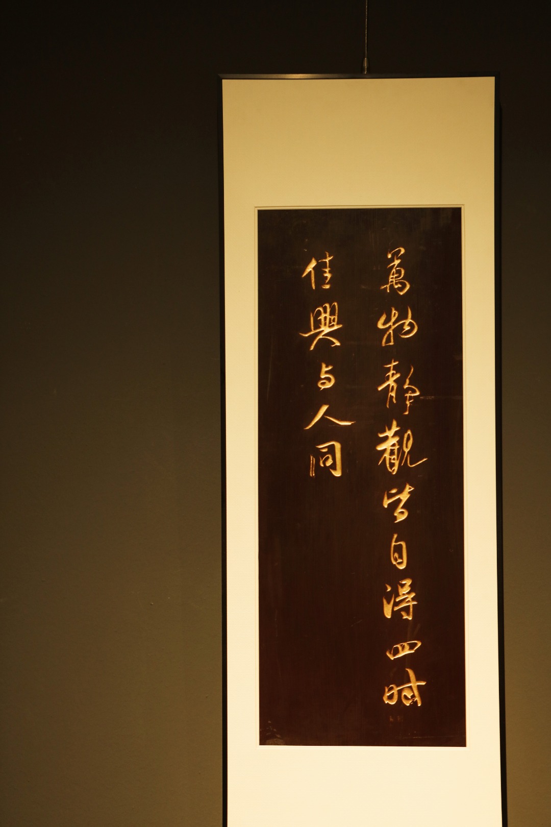 题识:“万物静观皆自得,四时佳兴与人同。‘’老楠木手刻,大漆描绘,字体酣畅浑厚,苍劲有力,悬于厅堂,可添雅蕴。