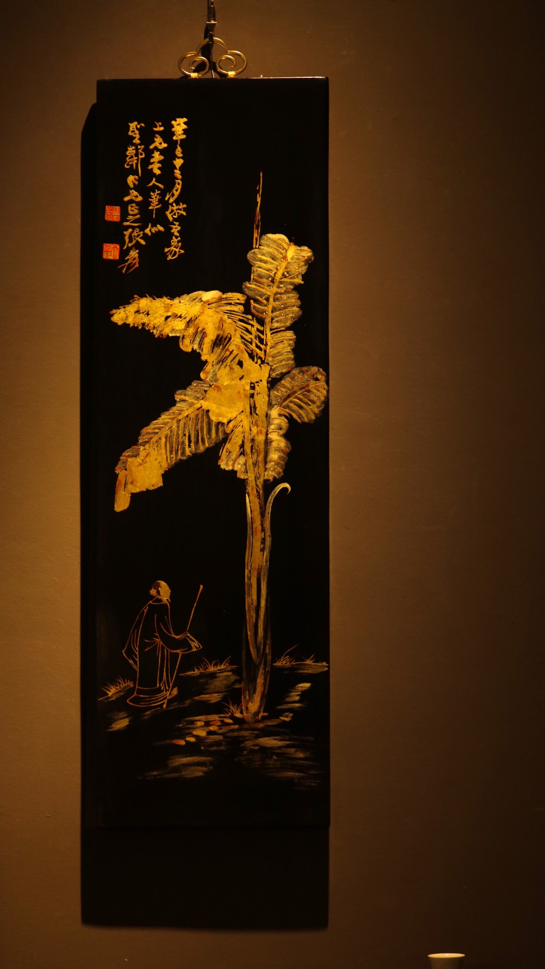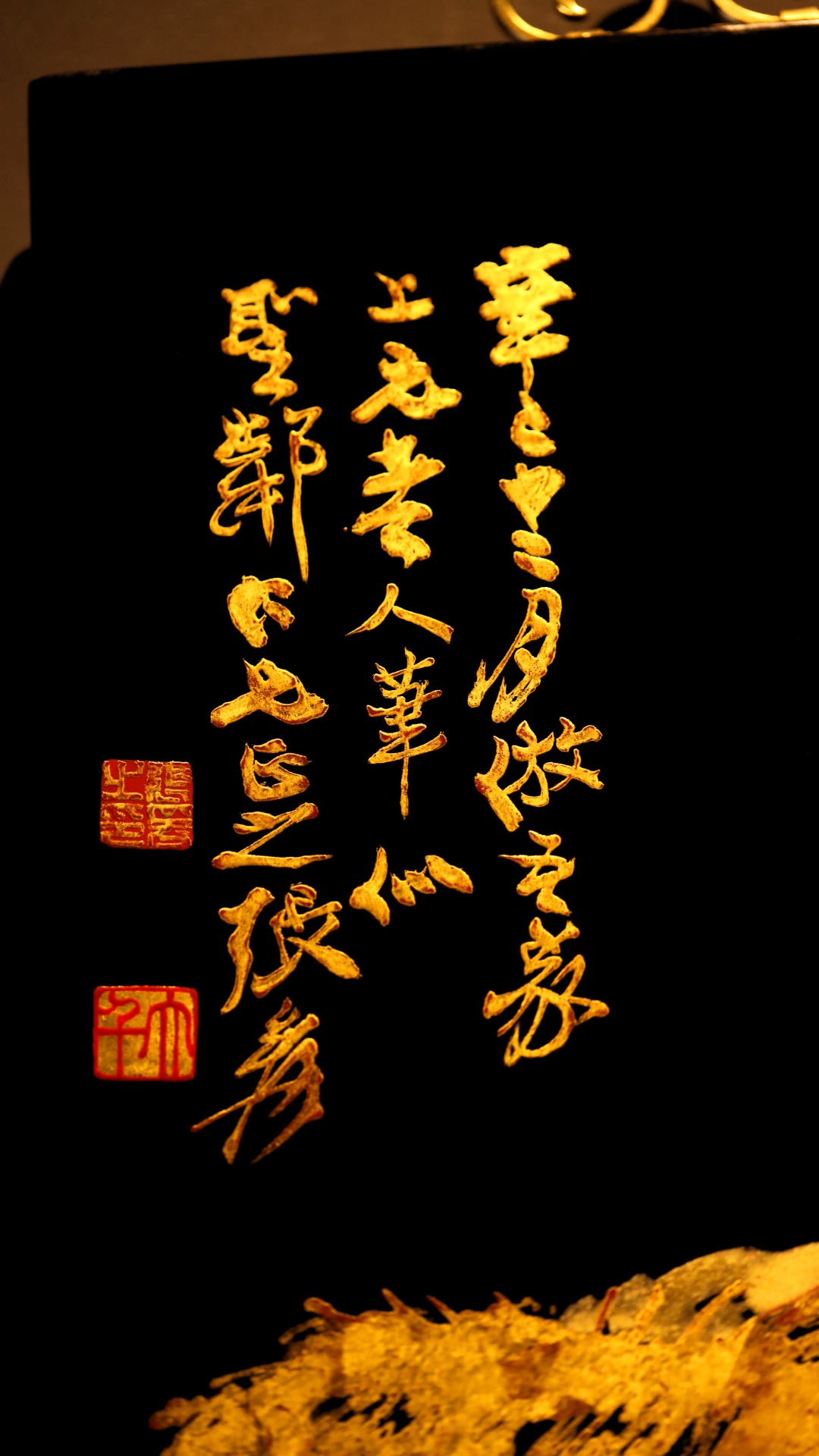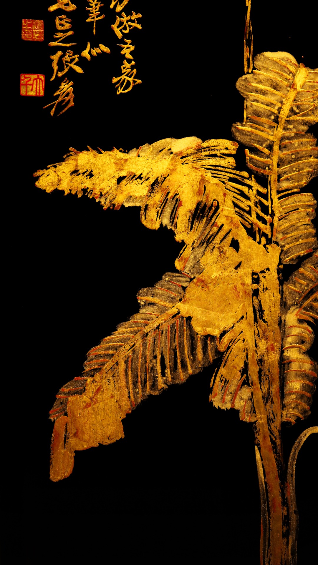 裱布刮灰,面髹黑漆,后又真金漆绘图;