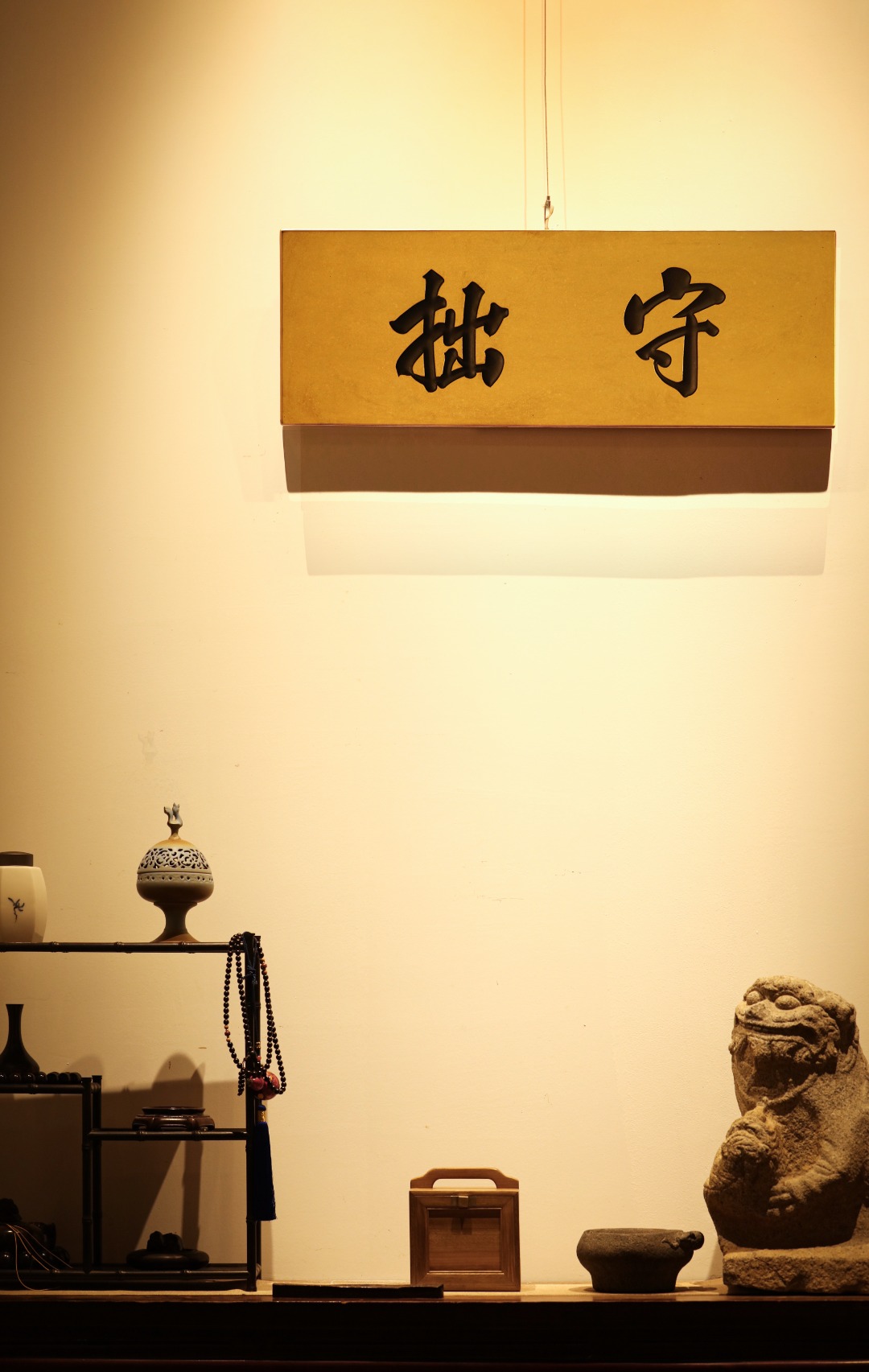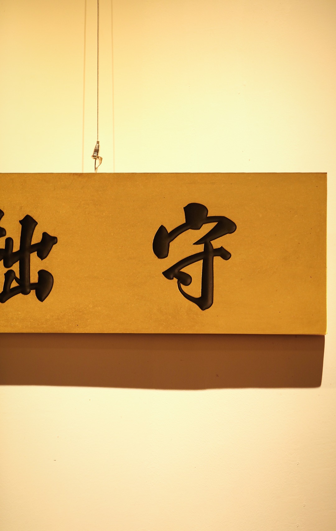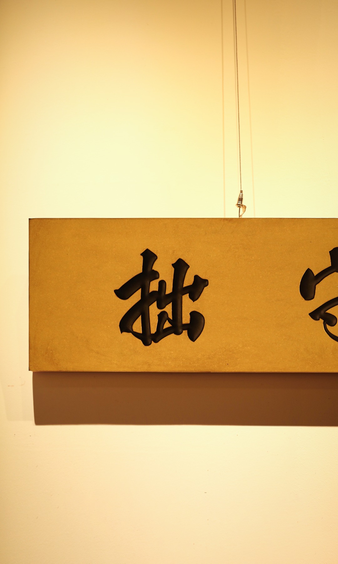 老楠木板新工,手工刻画,题字:"守拙,"面饰金箔。几字体酣畅浑厚,苍劲有力,悬于厅堂文房,可添文史雅蕴。